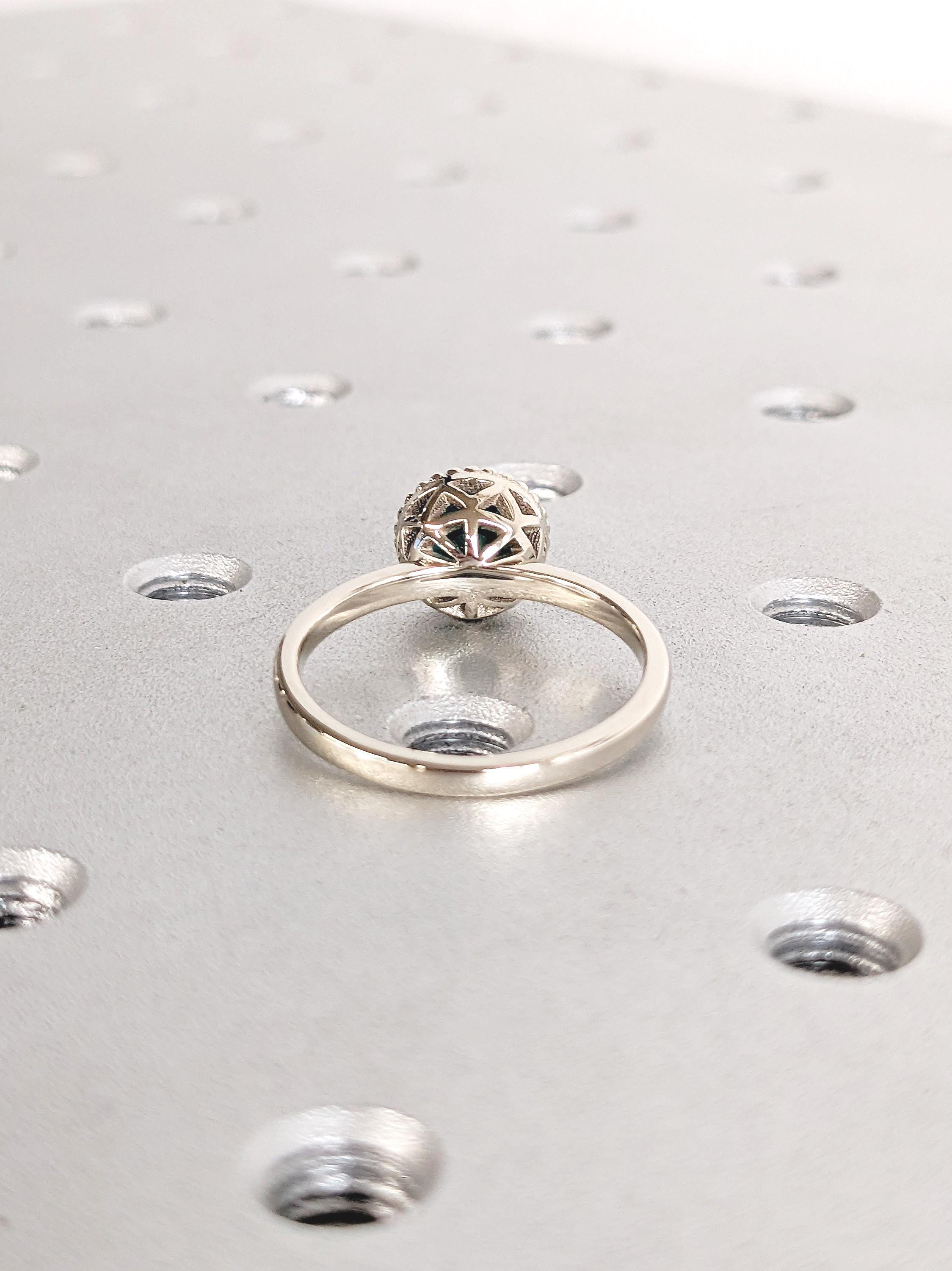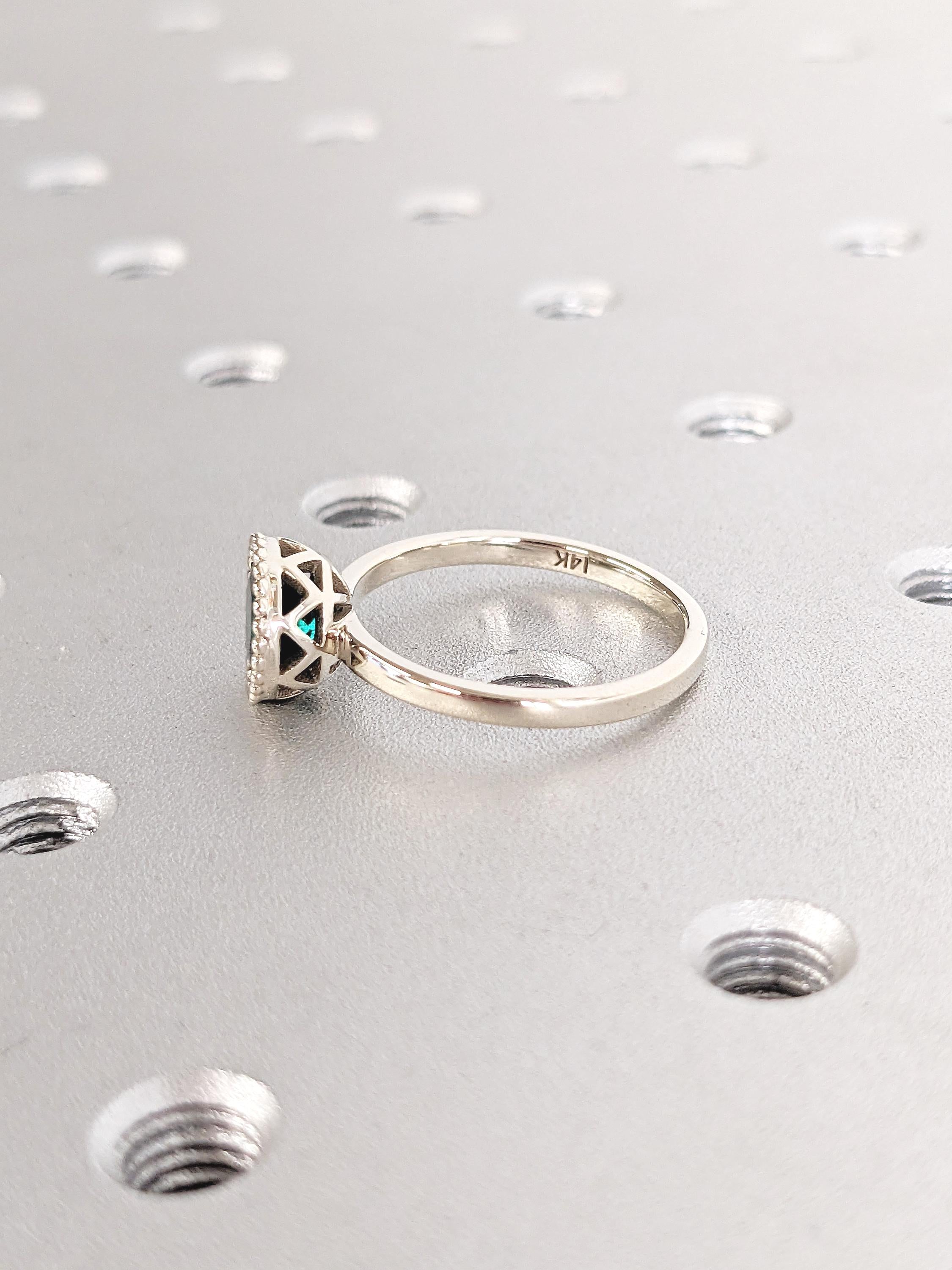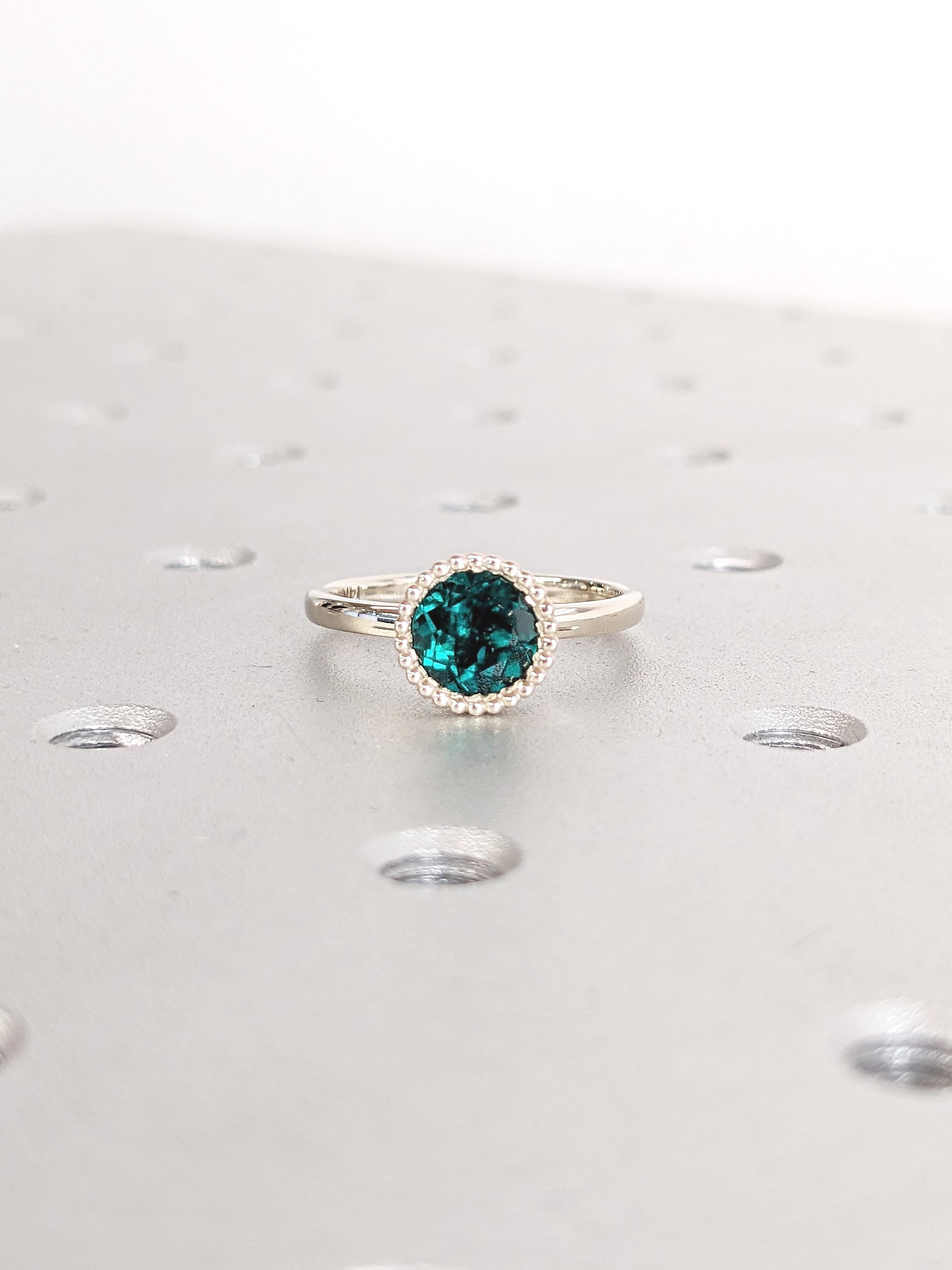 This enchanting engagement ring features a round cut Lab Emerald set in a delicate milgrain bezel basket setting. The rich green hue of the emerald is beautifully framed by the intricate beaded detailing, while the open basket design allows light to flow through, enhancing its brilliance. A timeless and elegant design, this piece blends vintage charm with modern craftsmanship.
