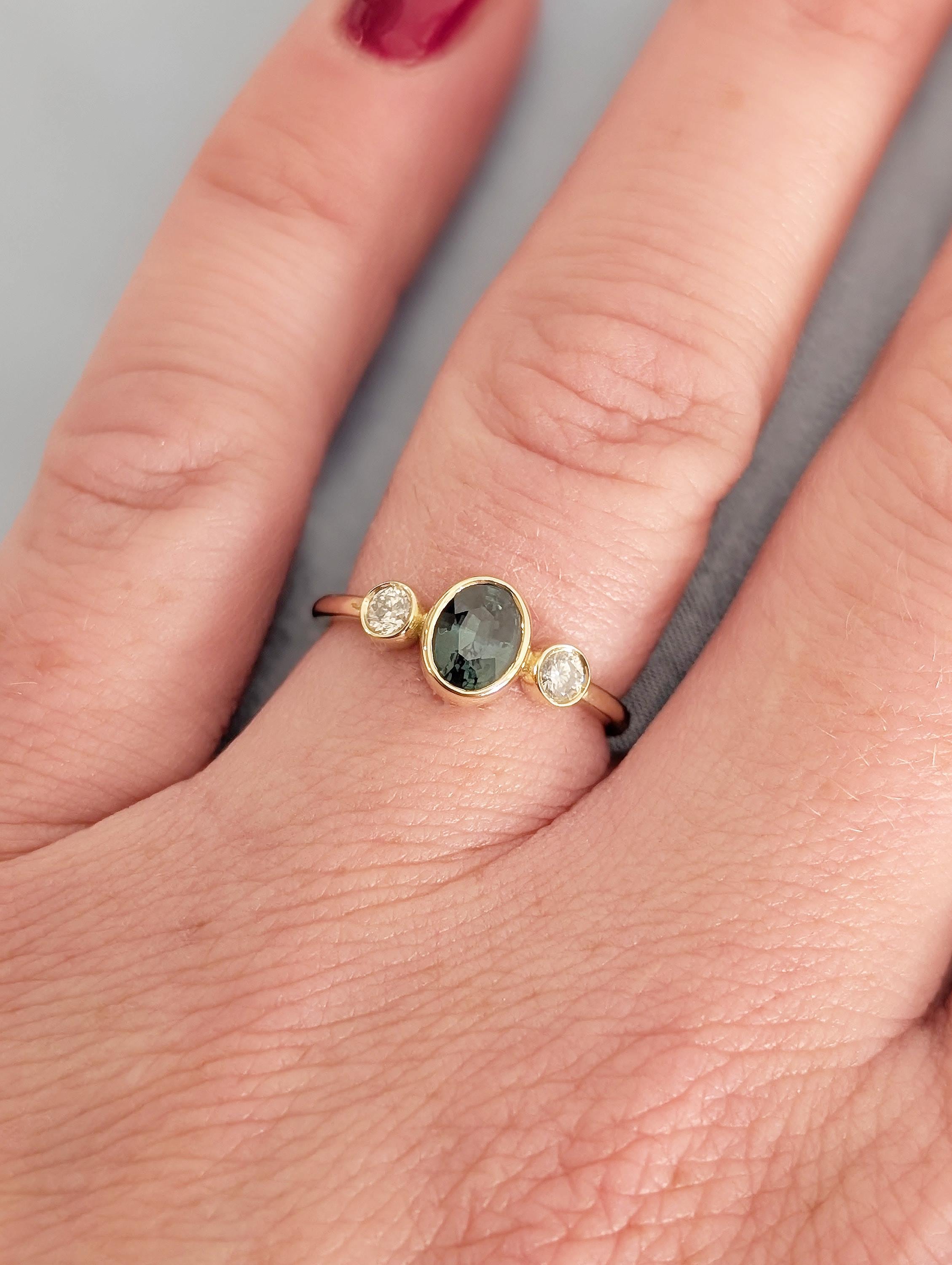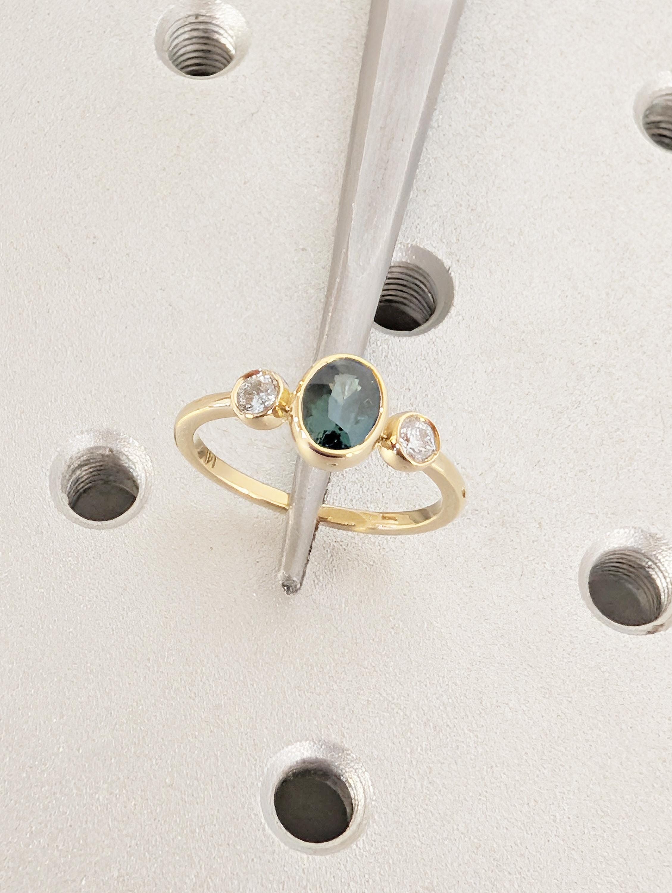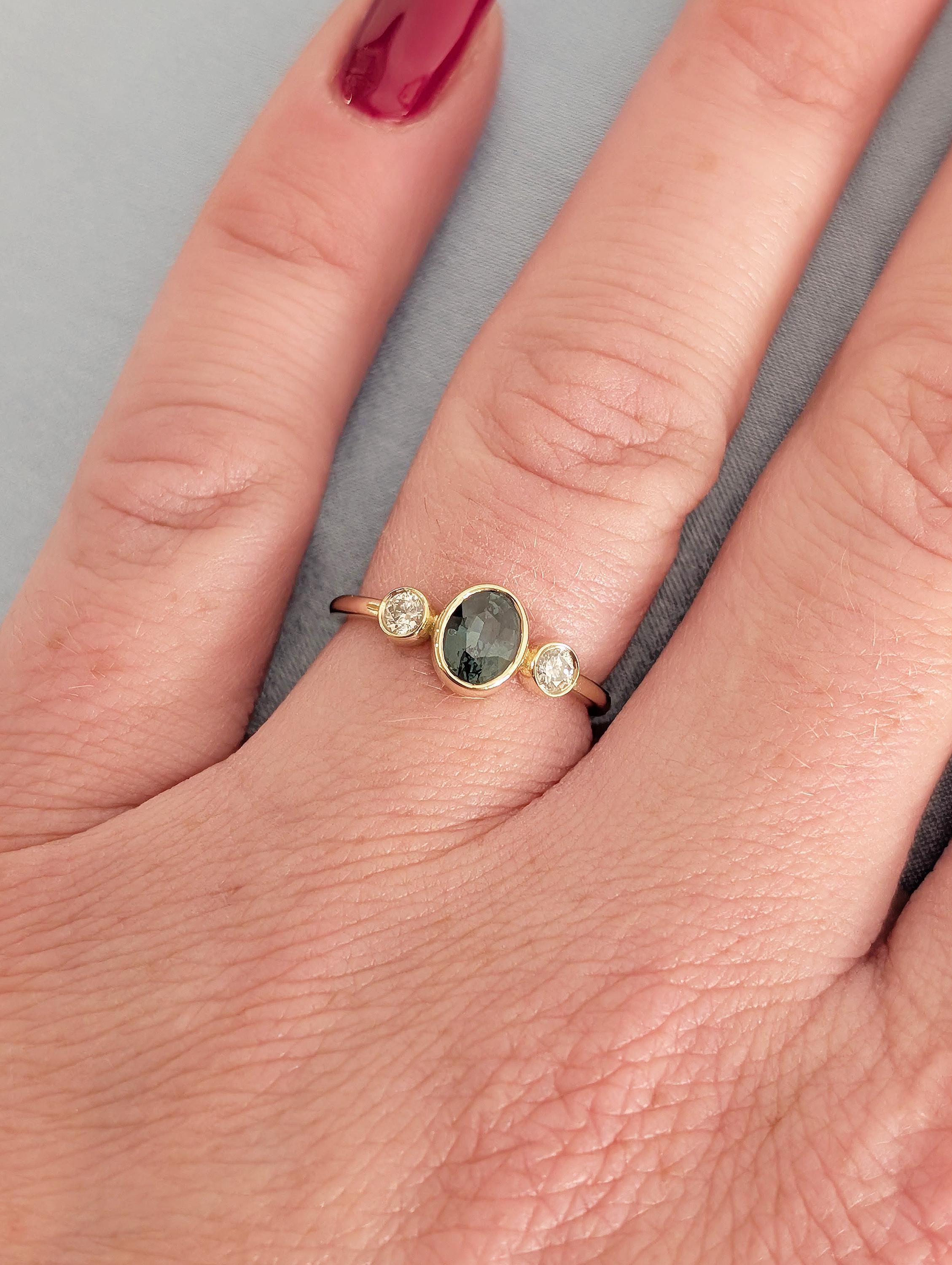 Bezel Set Montana Sapphire Ring, 14K Yellow Gold Three Stone Engagement Ring, Oval Blue Green Sapphire September Birthstone and Diamond Ring