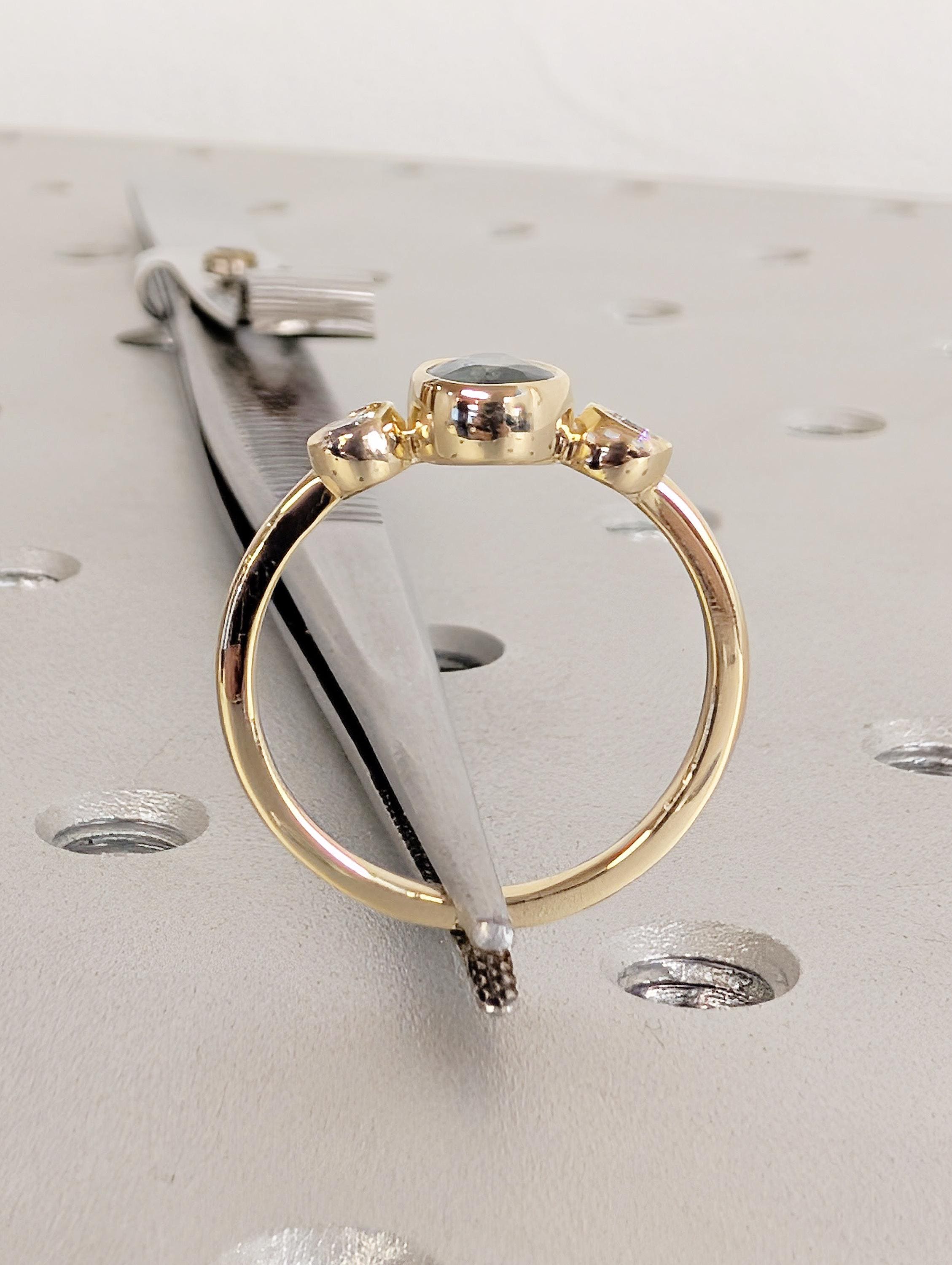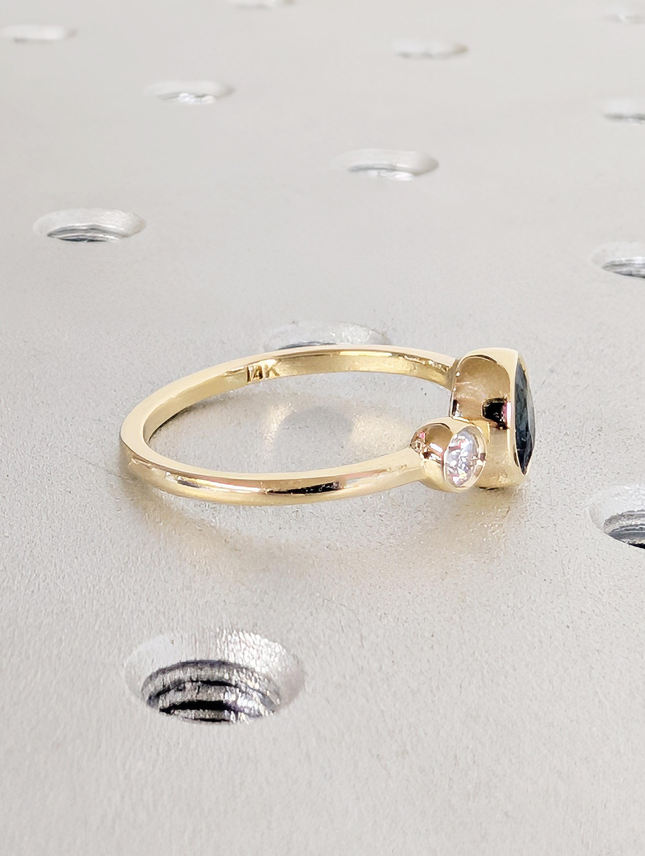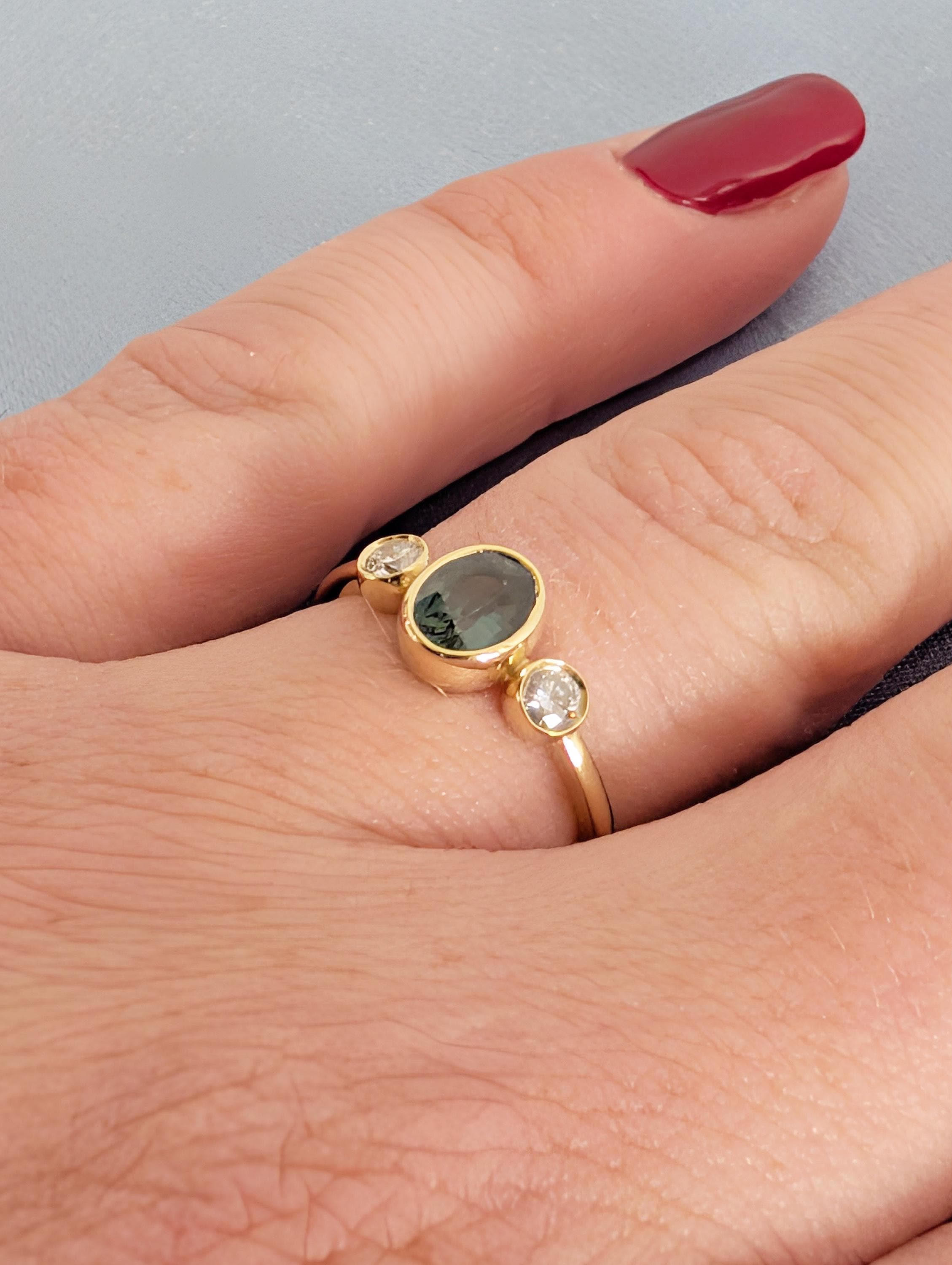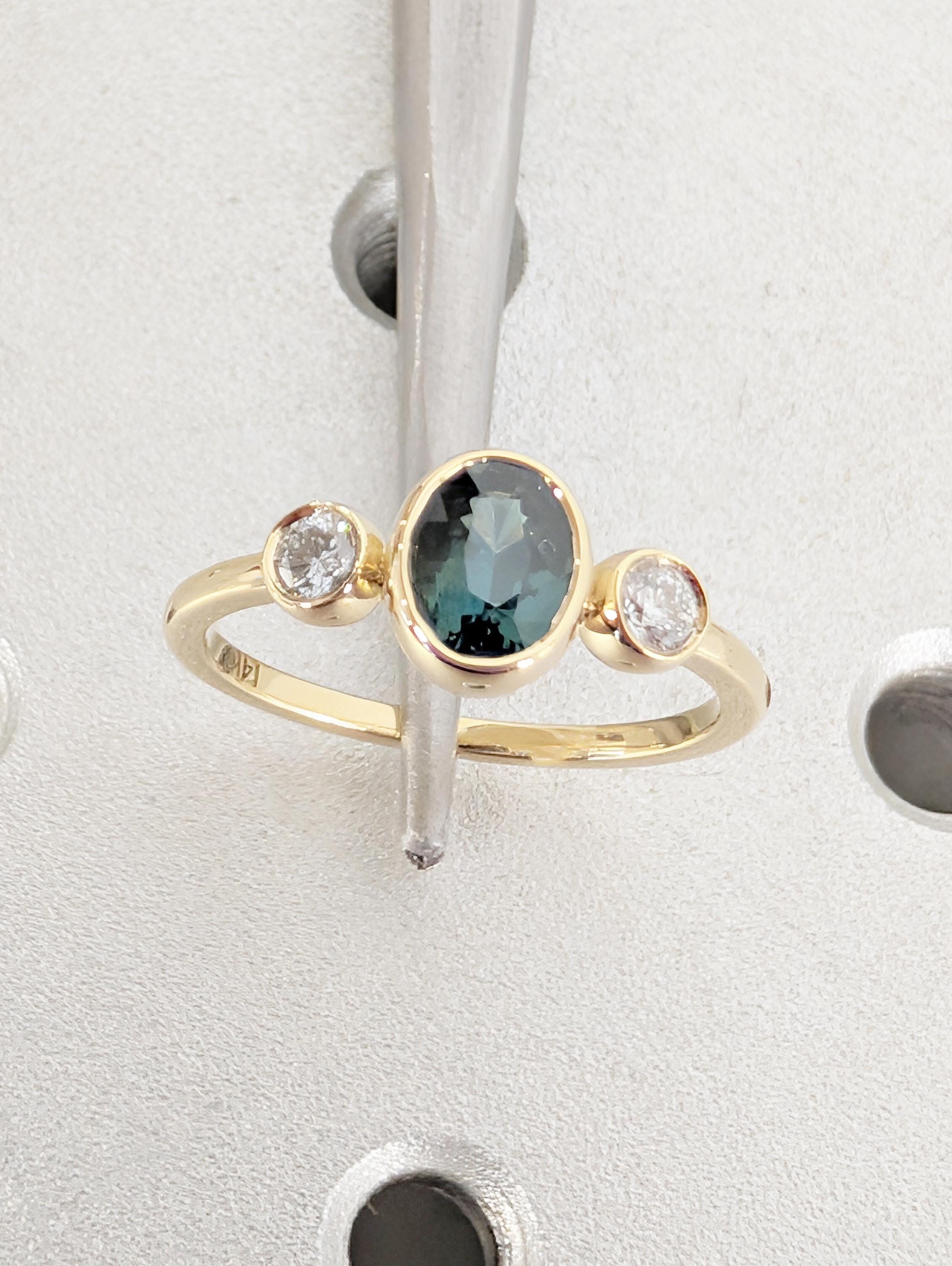 Bezel Set Montana Sapphire Ring, 14K Yellow Gold Three Stone Engagement Ring, Oval Blue Green Sapphire September Birthstone and Diamond Ring