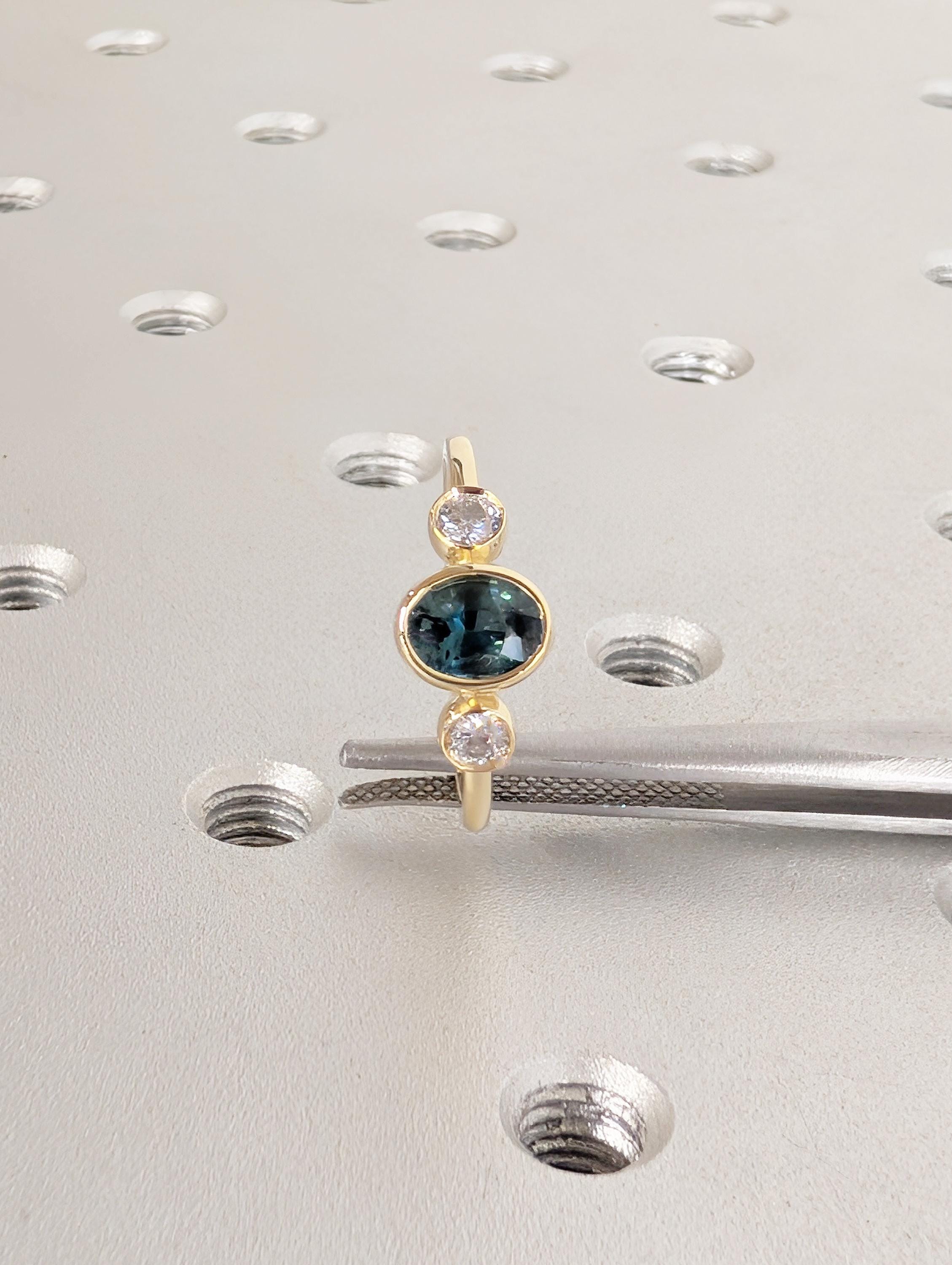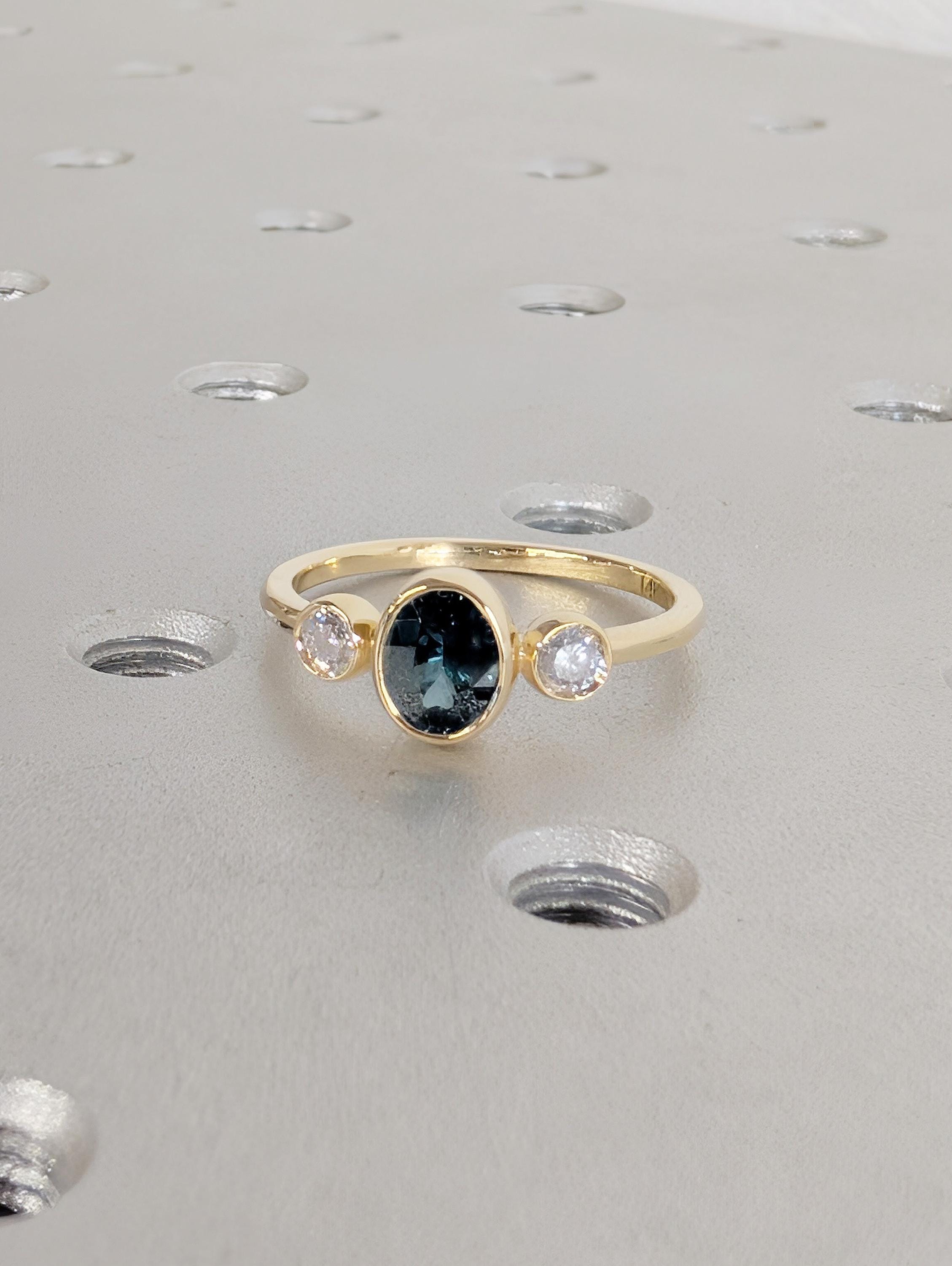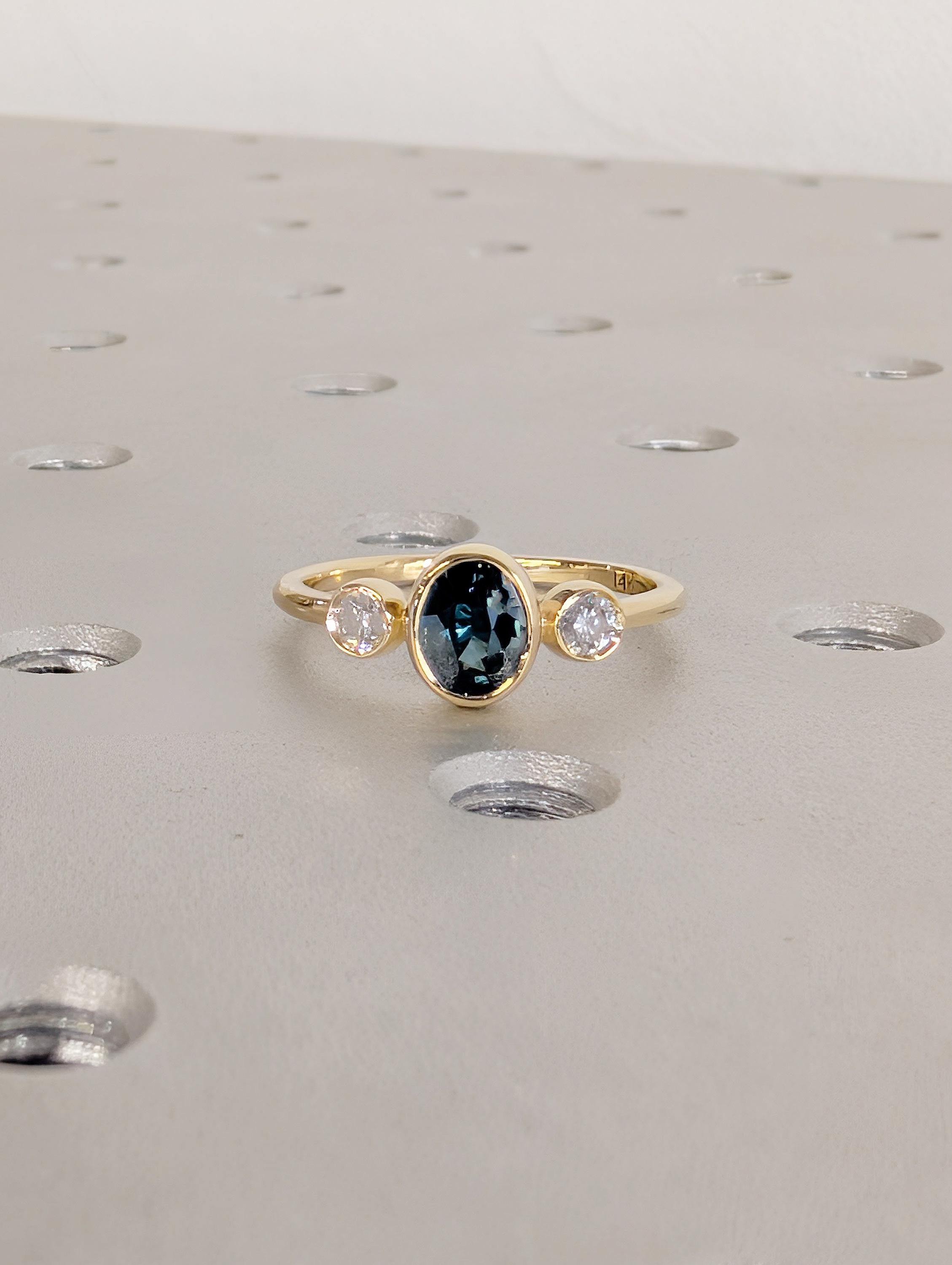 A captivating oval cut Teal Sapphire takes center stage in this elegant three-stone engagement ring. Bezel settings surround each stone for a sleek, modern yet timeless finish. The rich blue-green hue of the center stone evokes nature's beauty, reminiscent of peacock feathers and ocean tones. Two smaller side stones add balance and symmetry, representing your past, present, and future. Choose from natural diamond, lab diamond, or moissanite for the side accents.