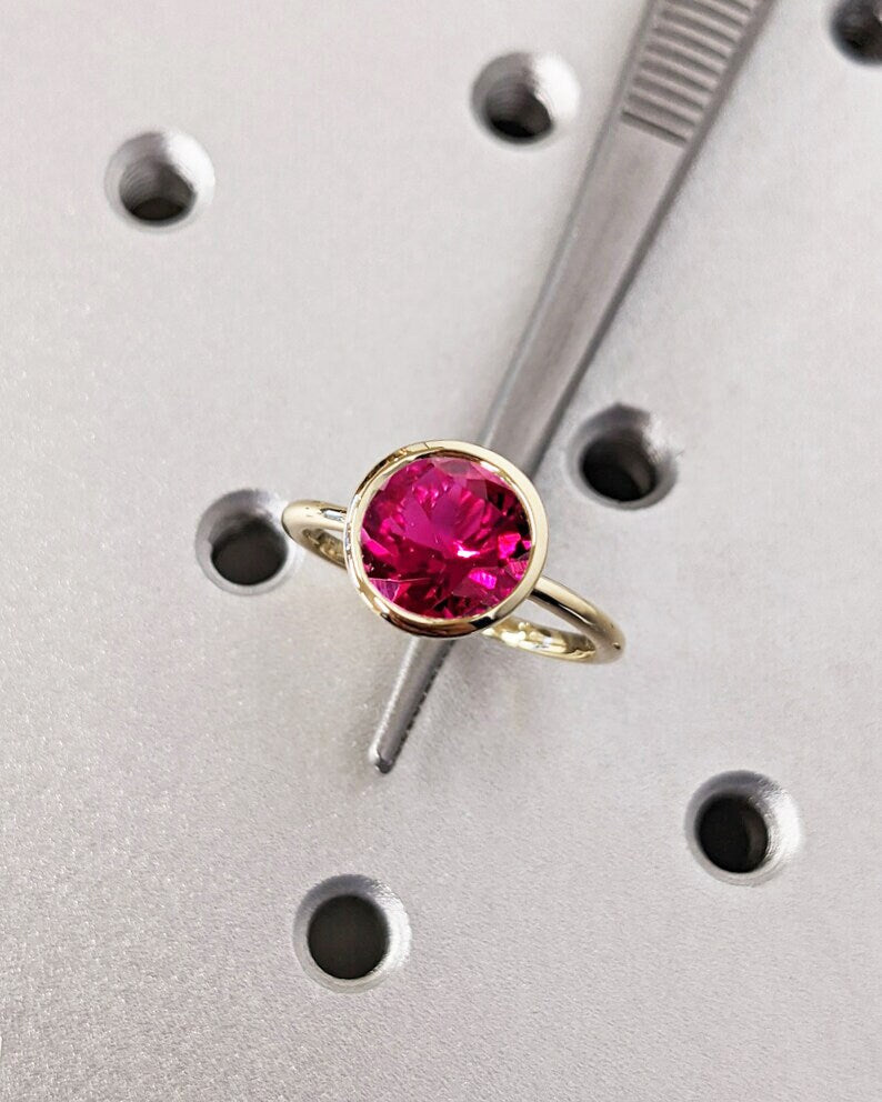 Make a statement with our alluring ring, highlighting a vibrant ruby securely set in an elegant bezel. The delicately rounded band not only enhances the timeless vintage charm but also offers unparalleled comfort, making it a versatile and chic accessory for any fashion-forward individual.