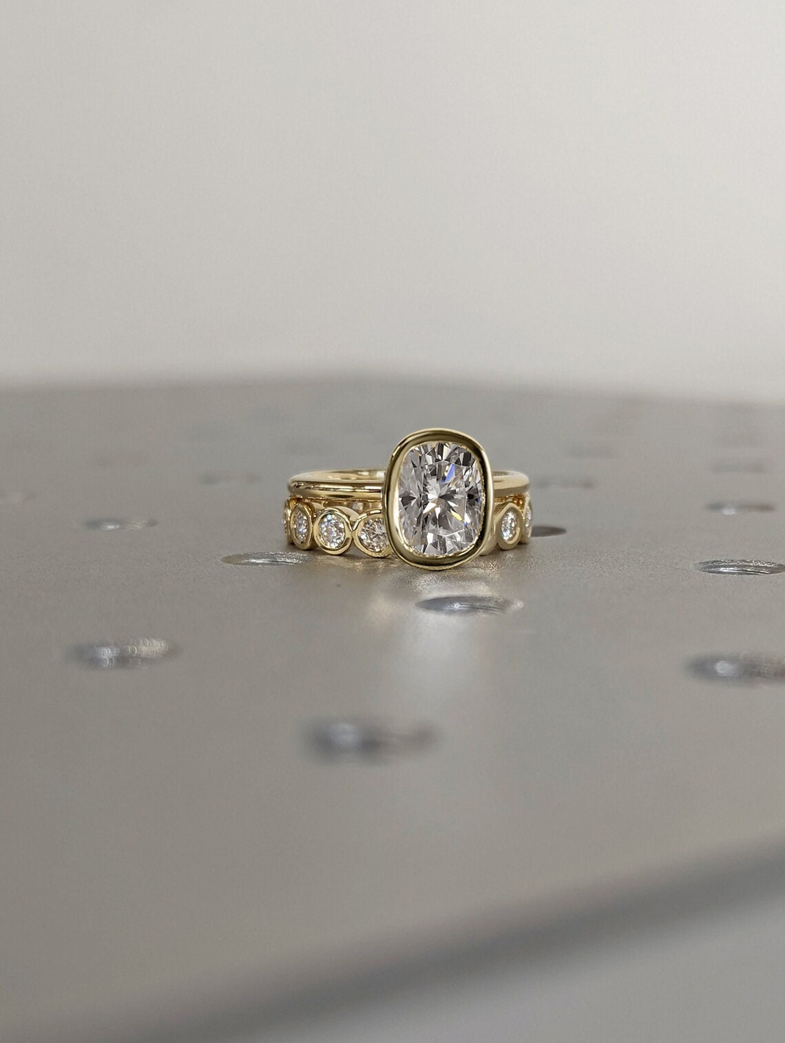 Bezel set Solitaire Promise Ring in 14k or 18k Gold: Long Cushion cut Moissanite