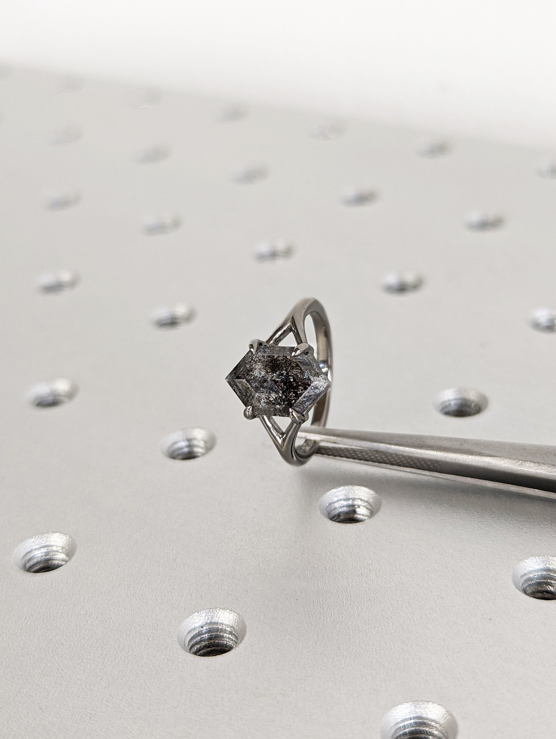 ONE-OF-A-KIND Hexagon salt and pepper diamond, solitaire ring that is just pure uniqueness, nothing that has ever been seen before.