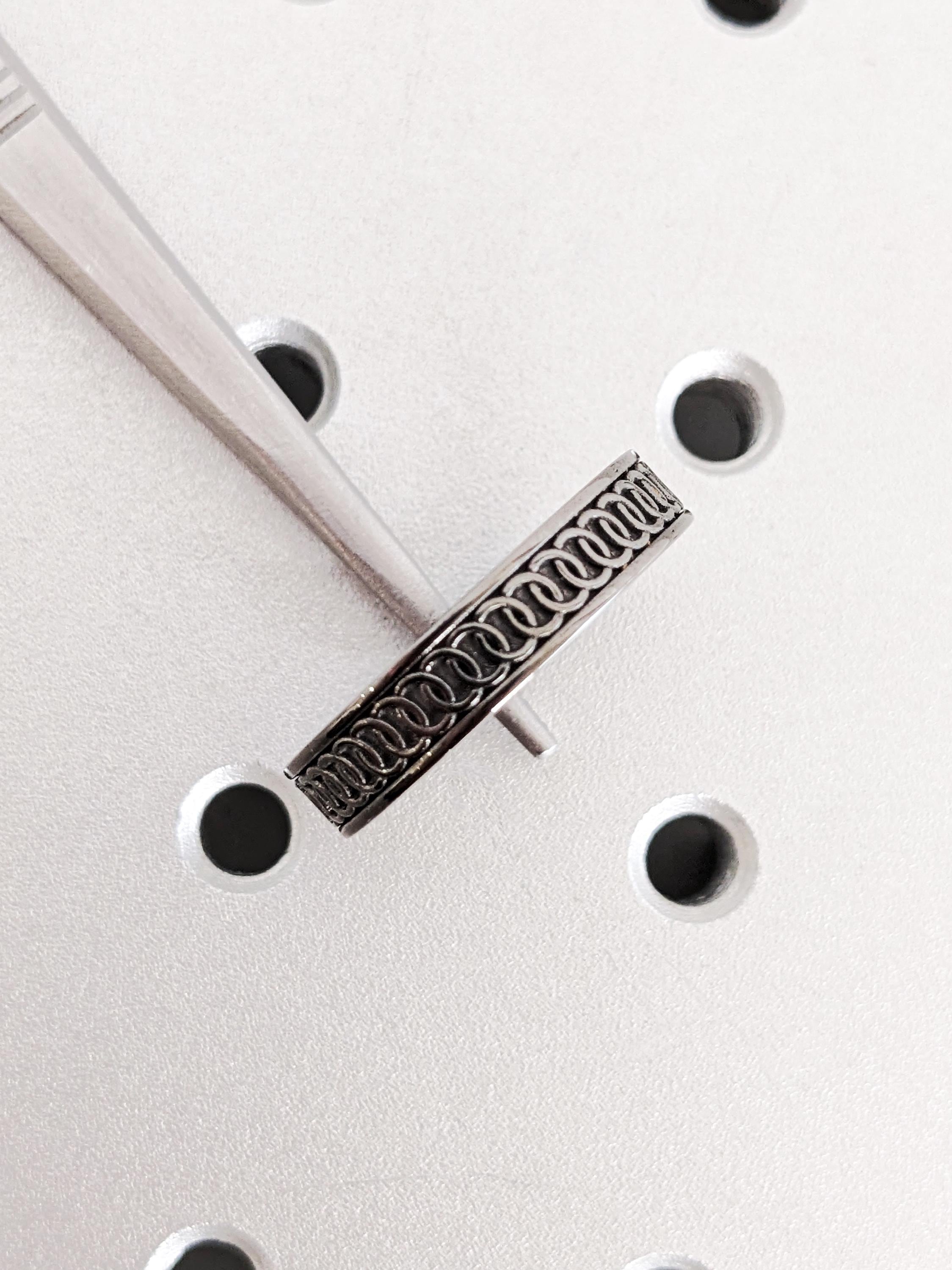 A bold yet refined piece that symbolizes strength and connection. This wedding band features a chain inspired pattern along the center, creating a timeless design that represents an unbreakable bond. Polished to a smooth finish, it’s a meaningful choice for men who appreciate both style and sentiment.