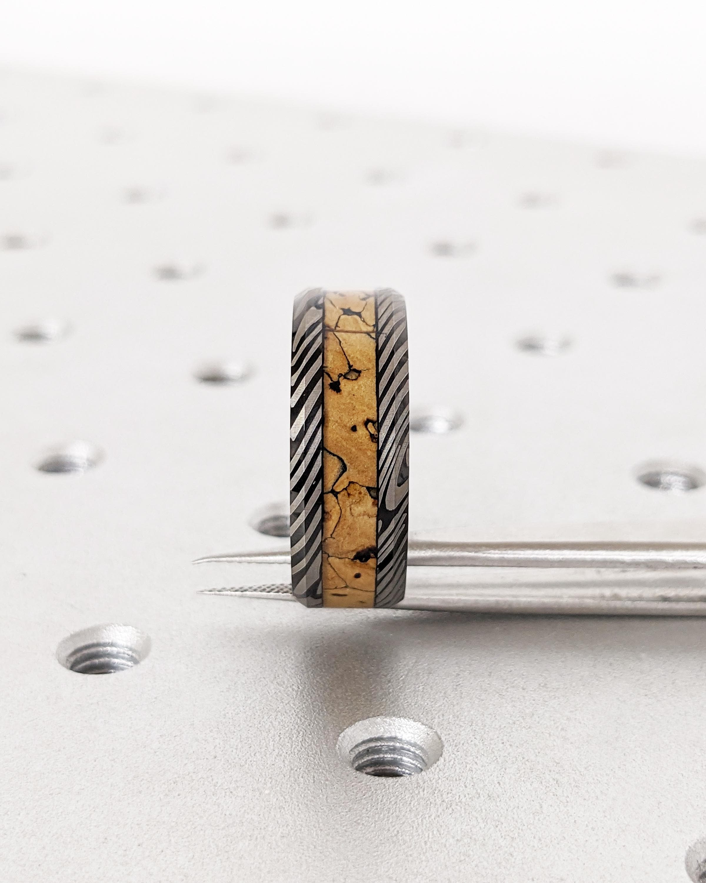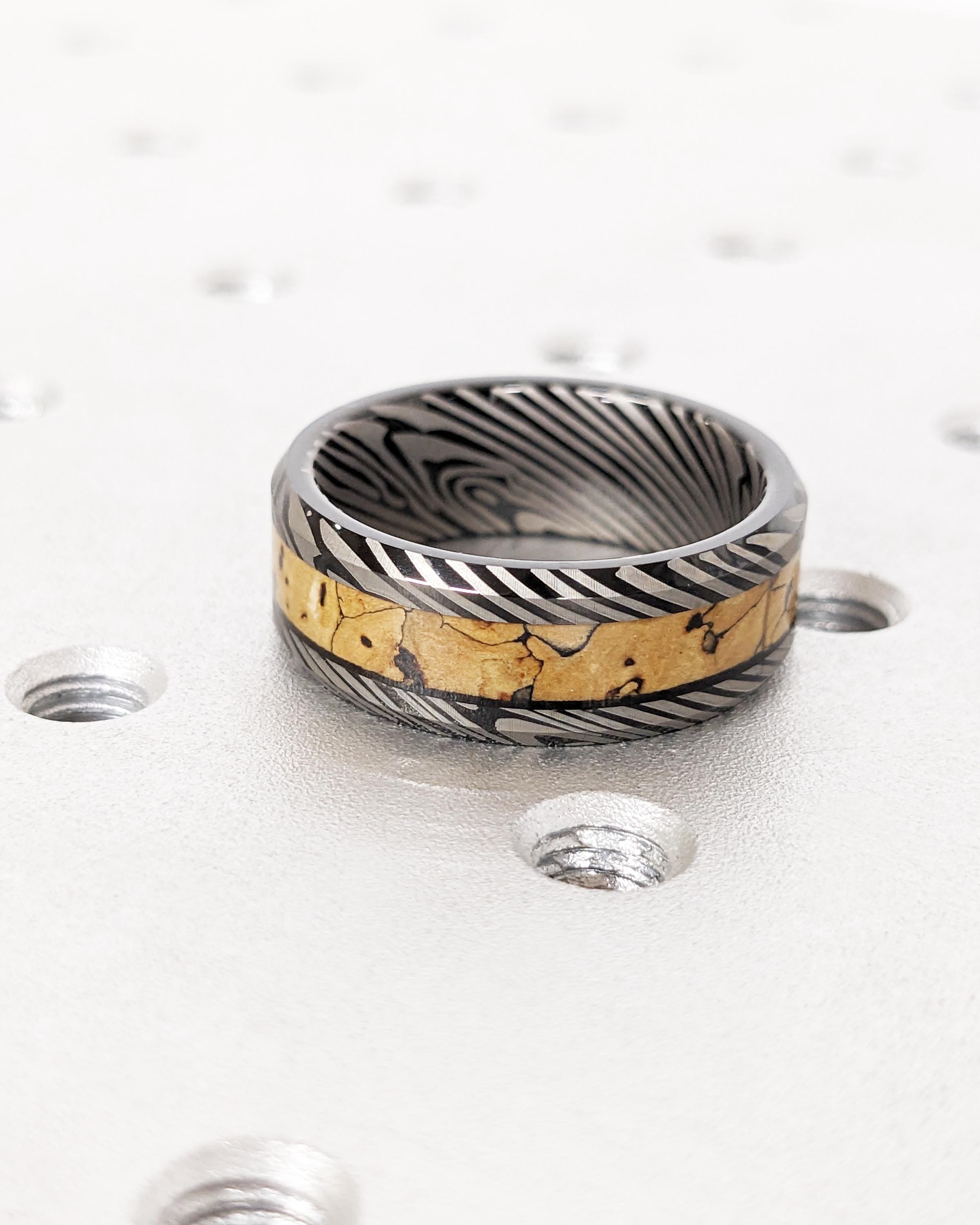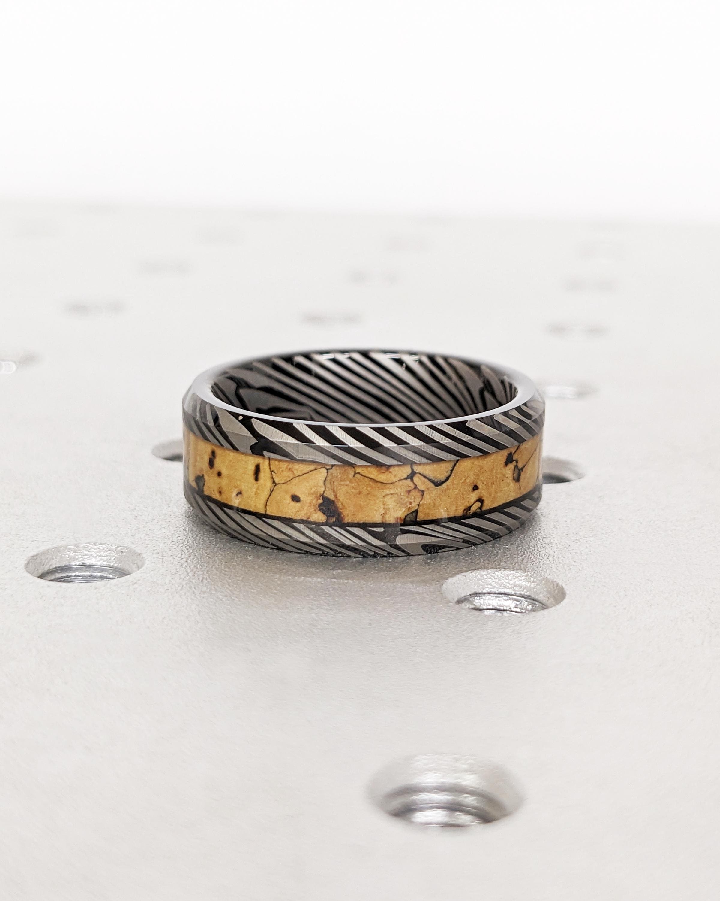 Black Tungsten Wedding Band: Mokume Gane Damascus Pattern & Dinosaur Bone Inlay, Polished Finish, 8mm
