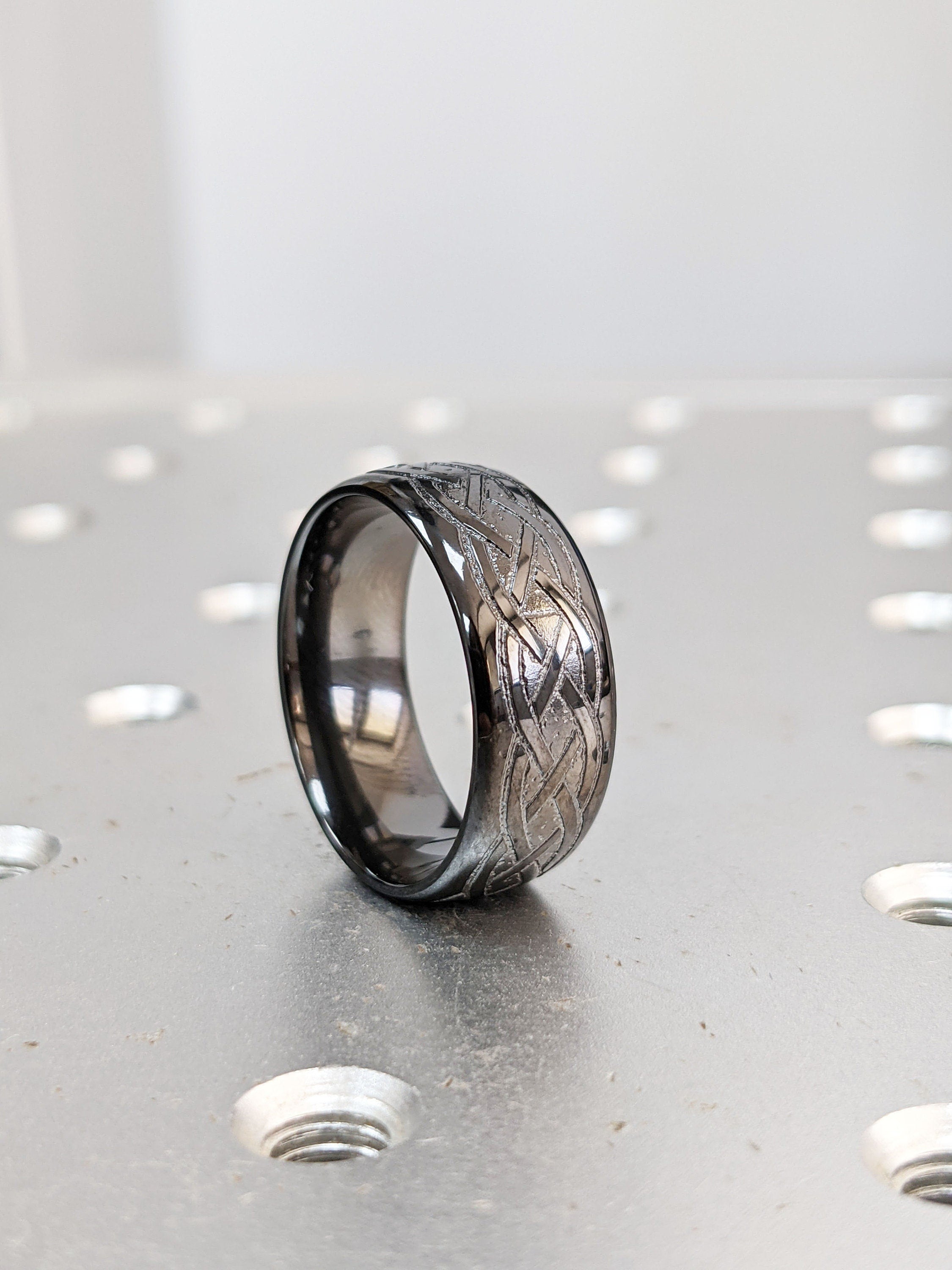 This hand made ring is crafted of the finest quality black zirconium. One of our unique custom handmade Black Zirconium ring, this piece is made with the greatest of care, the black color of the piece with its brushed finish are forever beautiful, a ring suiting as a men's wedding band as well, Celtic pattern finish and design.