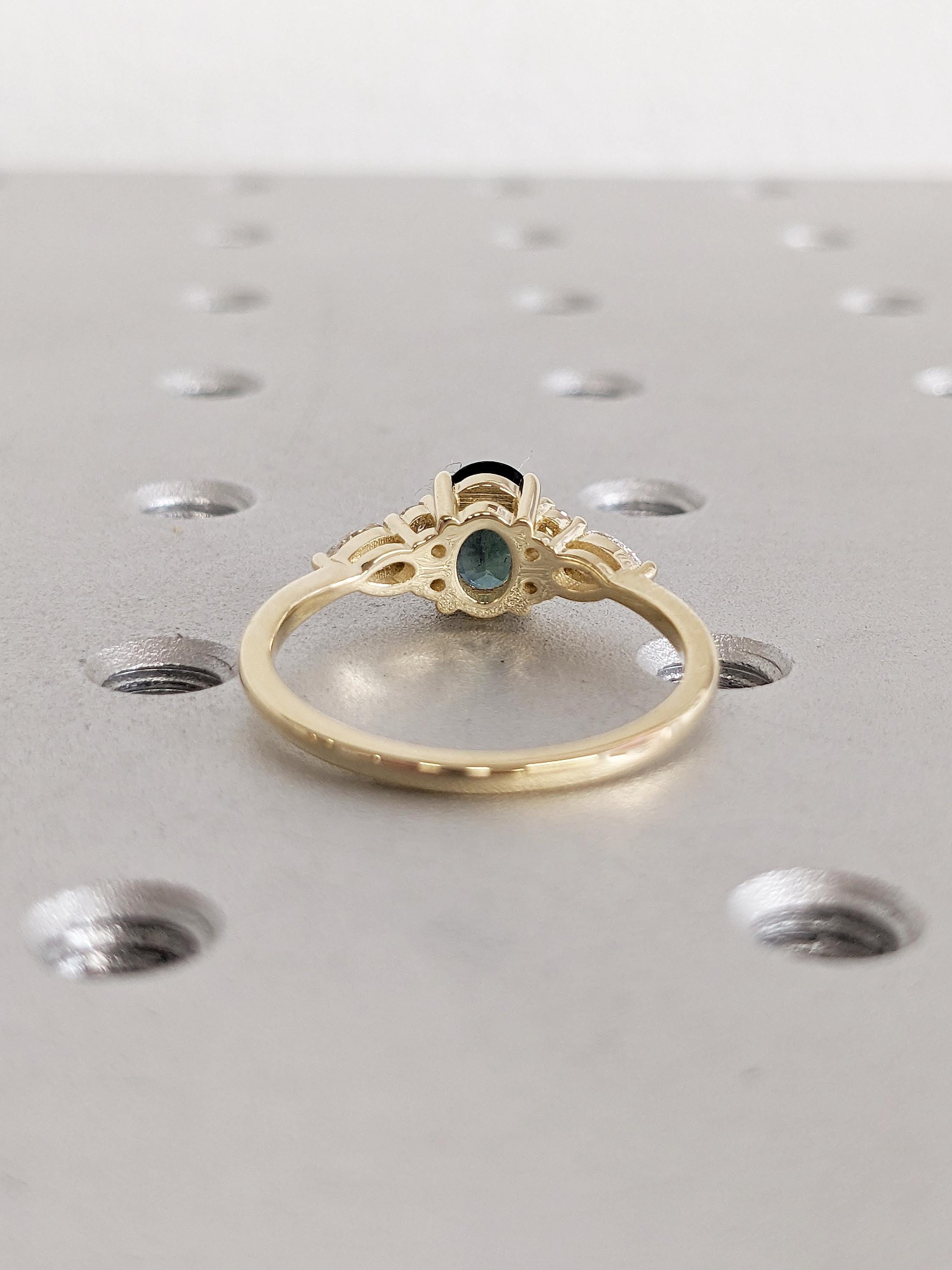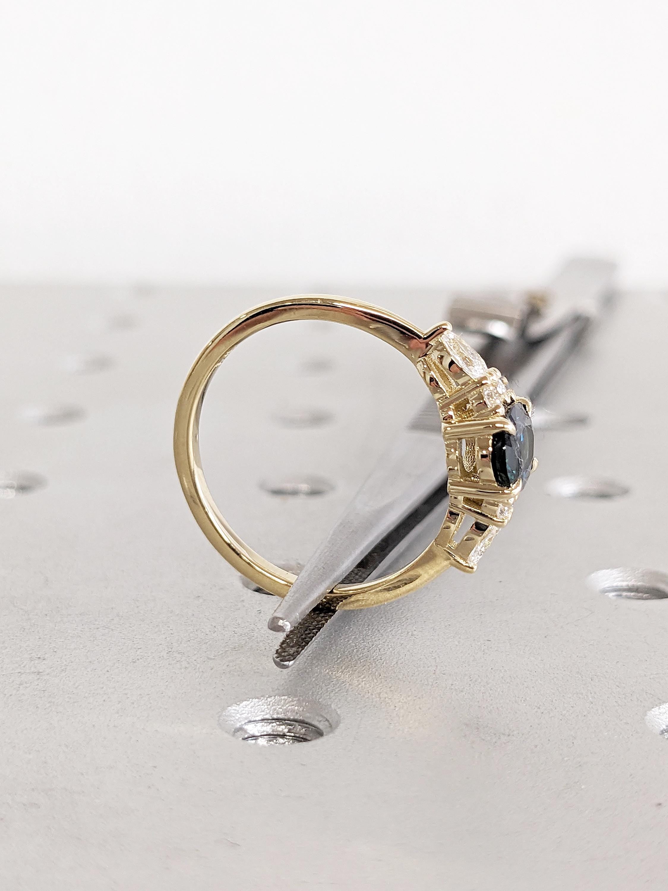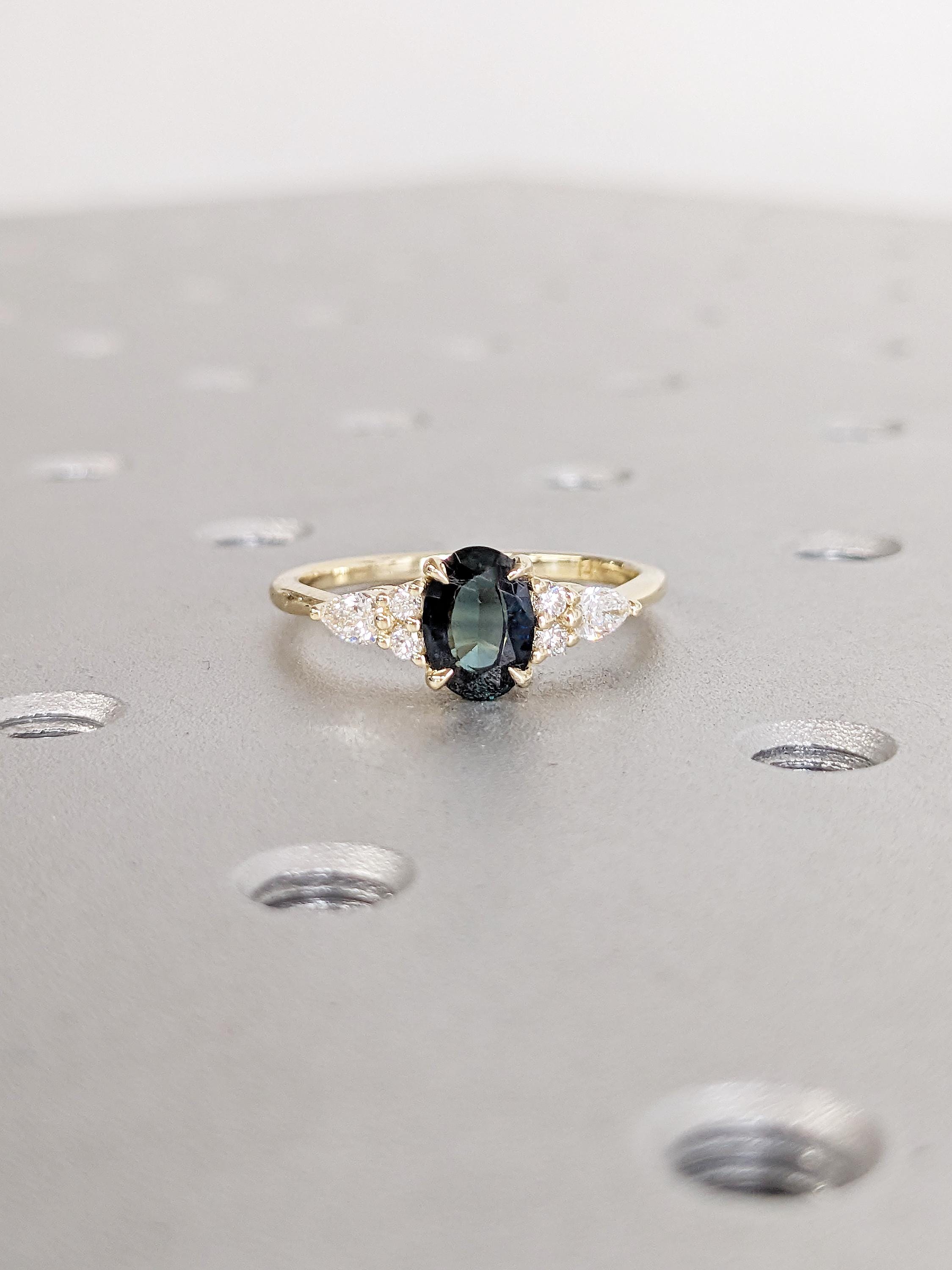Blue Green Sapphire Ring, 14k Gold Ring, Unique Moissanite Cluster Ring, Gold Engagement Ring, Vintage Wedding Band, Promise Ring for Her