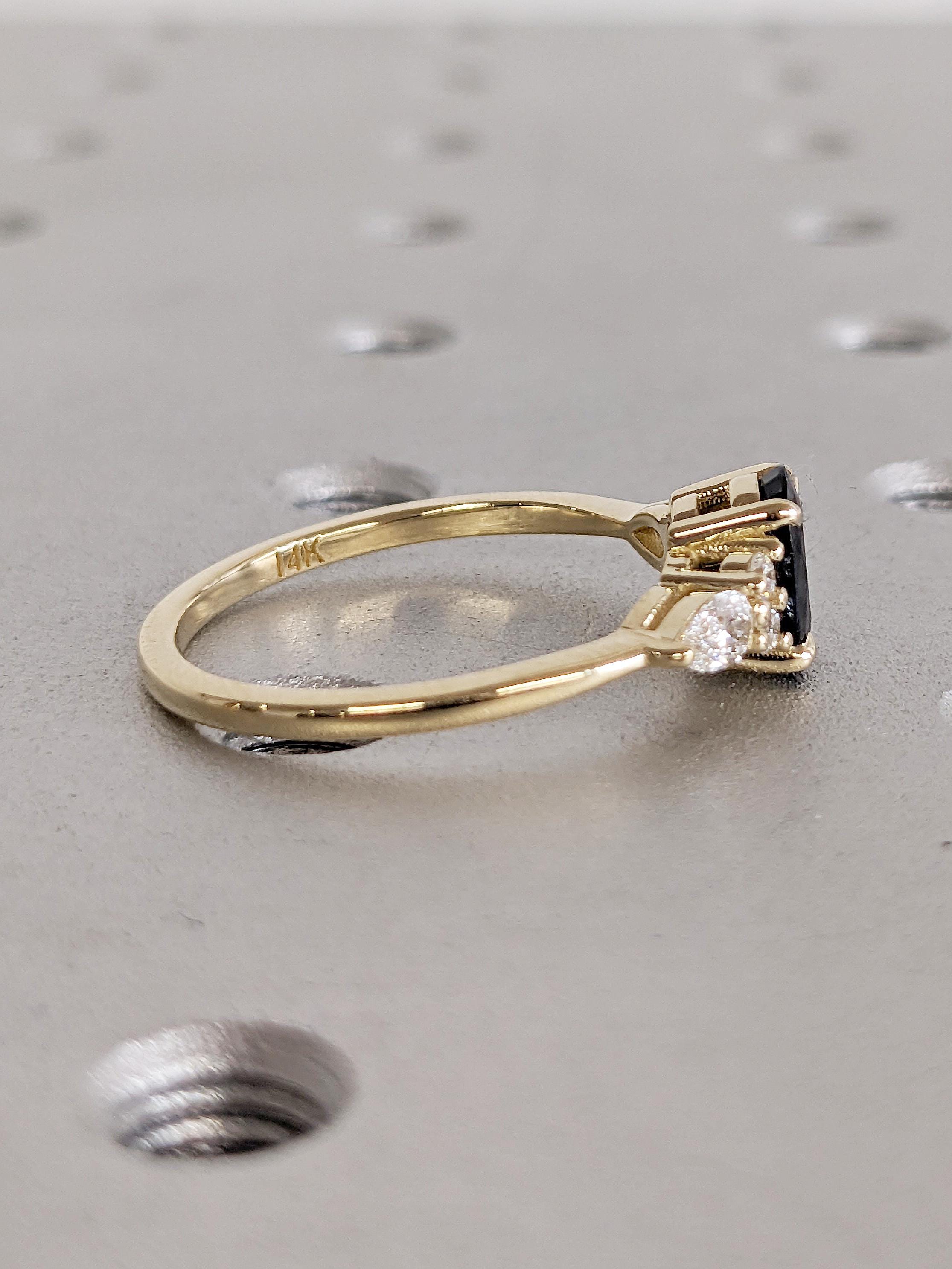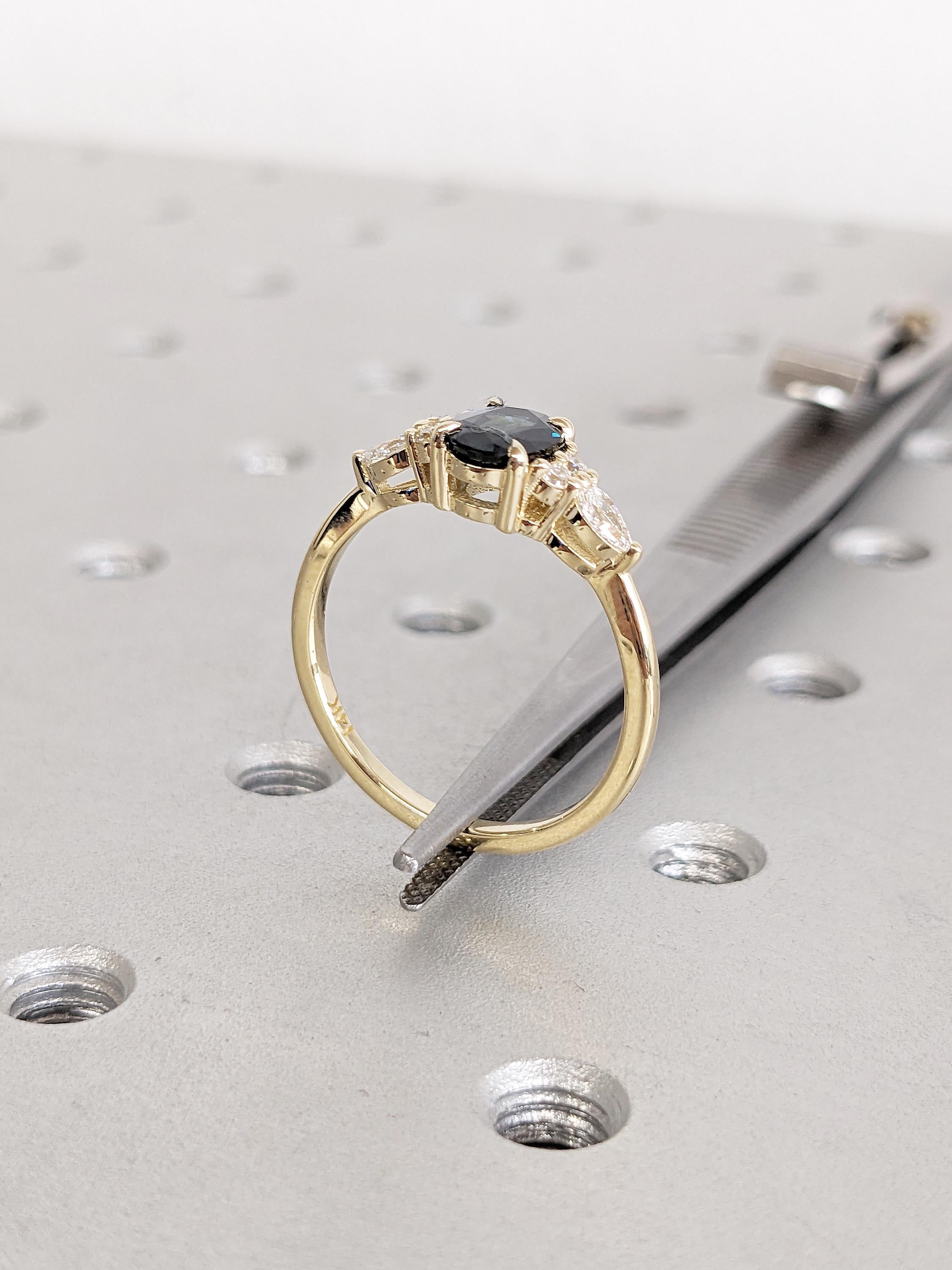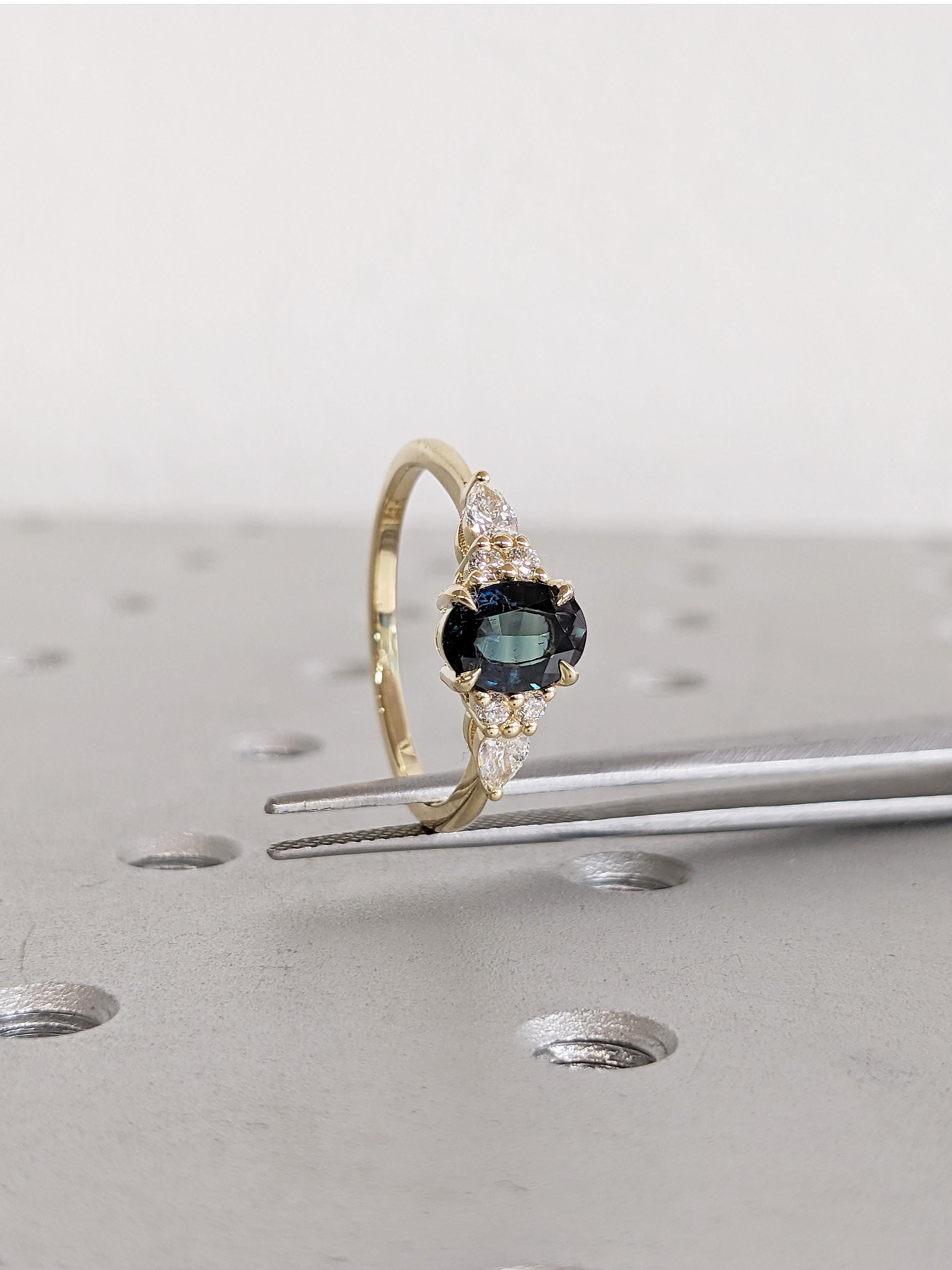 Blue Green Sapphire Ring, 14k Gold Ring, Unique Moissanite Cluster Ring, Gold Engagement Ring, Vintage Wedding Band, Promise Ring for Her