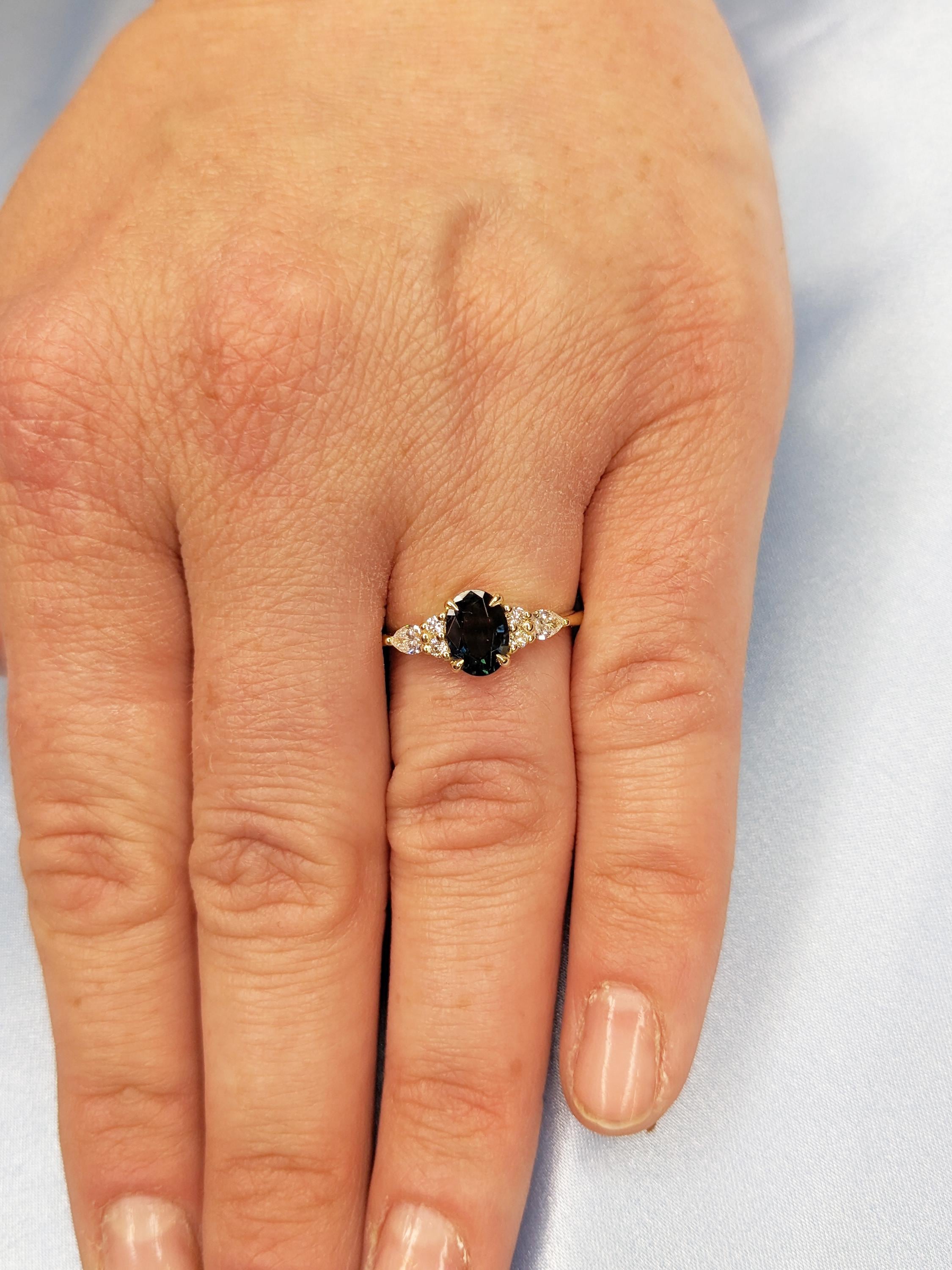 Discover our stunning vintage-inspired ring, featuring a gracefully prong-set oval Peacock Sapphire at its center. Enhanced by your choice of prong-set Natural Diamonds, Lab Grown Diamonds, or Moissanite, this exquisite piece radiates timeless elegance. The delicate gold band beautifully highlights the Peacock Sapphire’s distinctive green-blue hue, making it a truly mesmerizing treasure.
