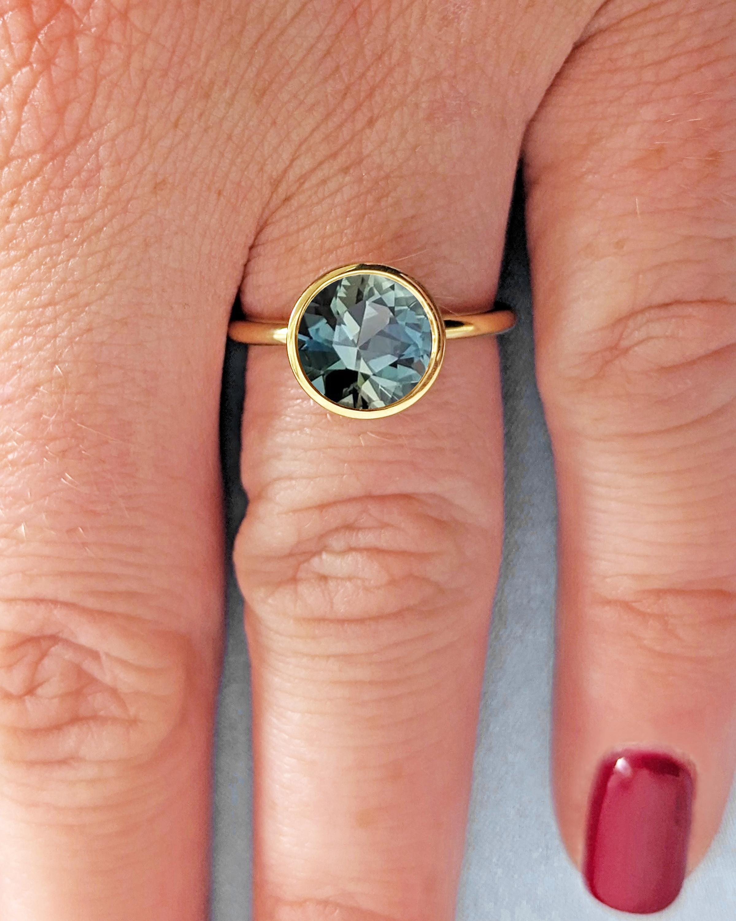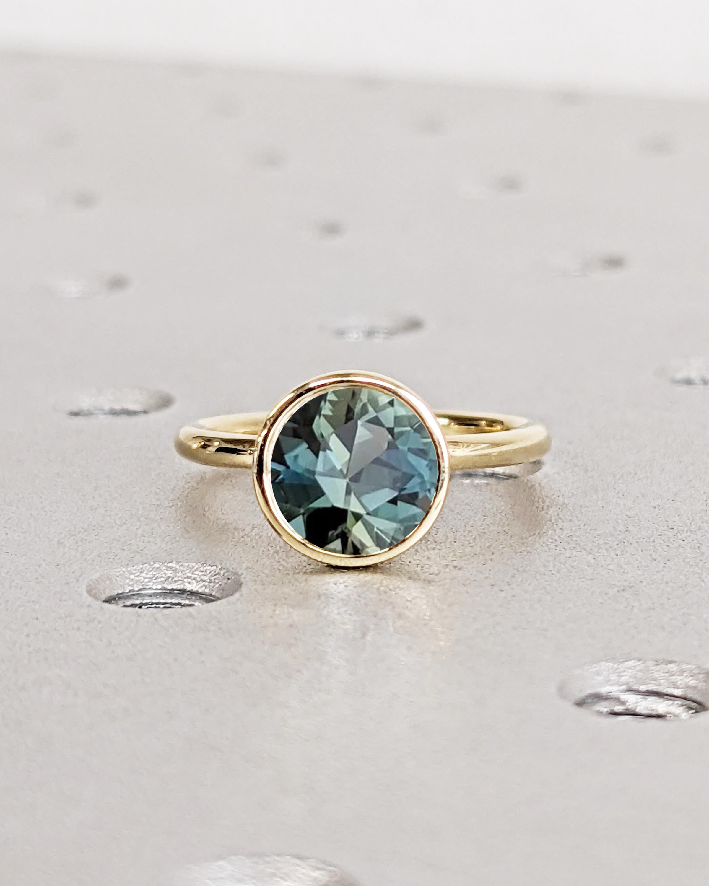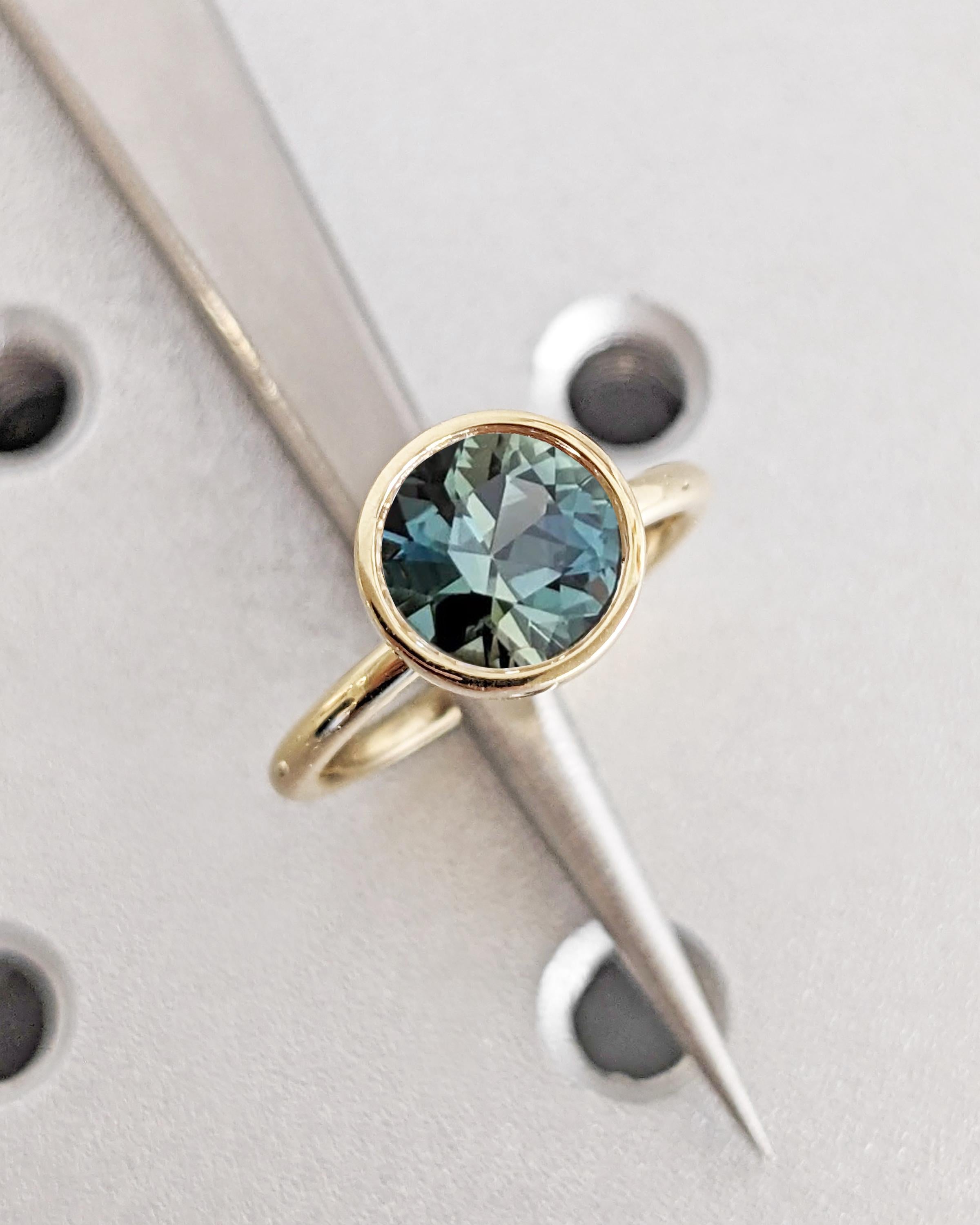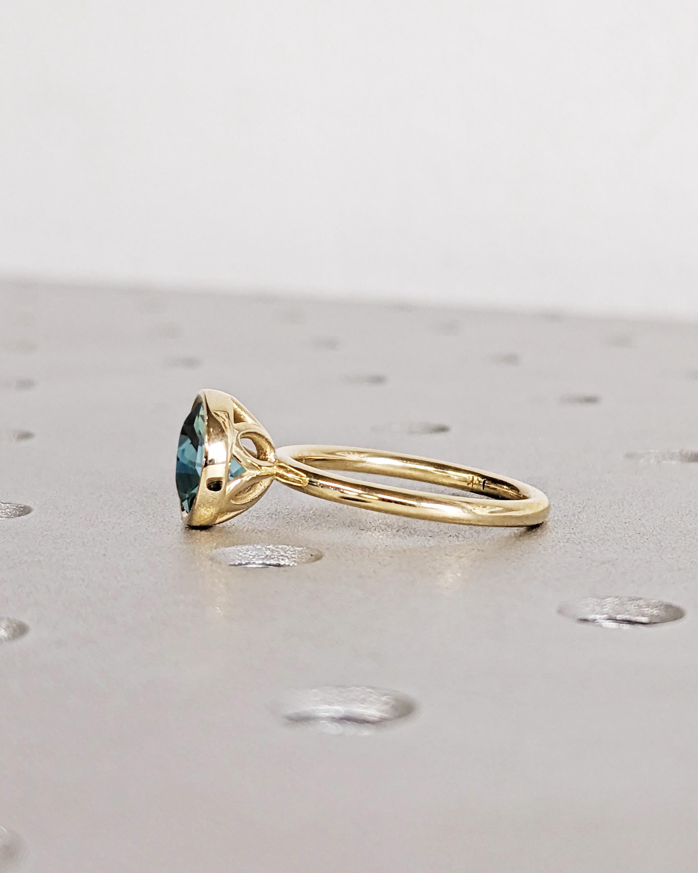 Blue Green Teal Sapphire Ring: Tulip Petal Lotus Basket, Bezel Setting, 14K Yellow Gold