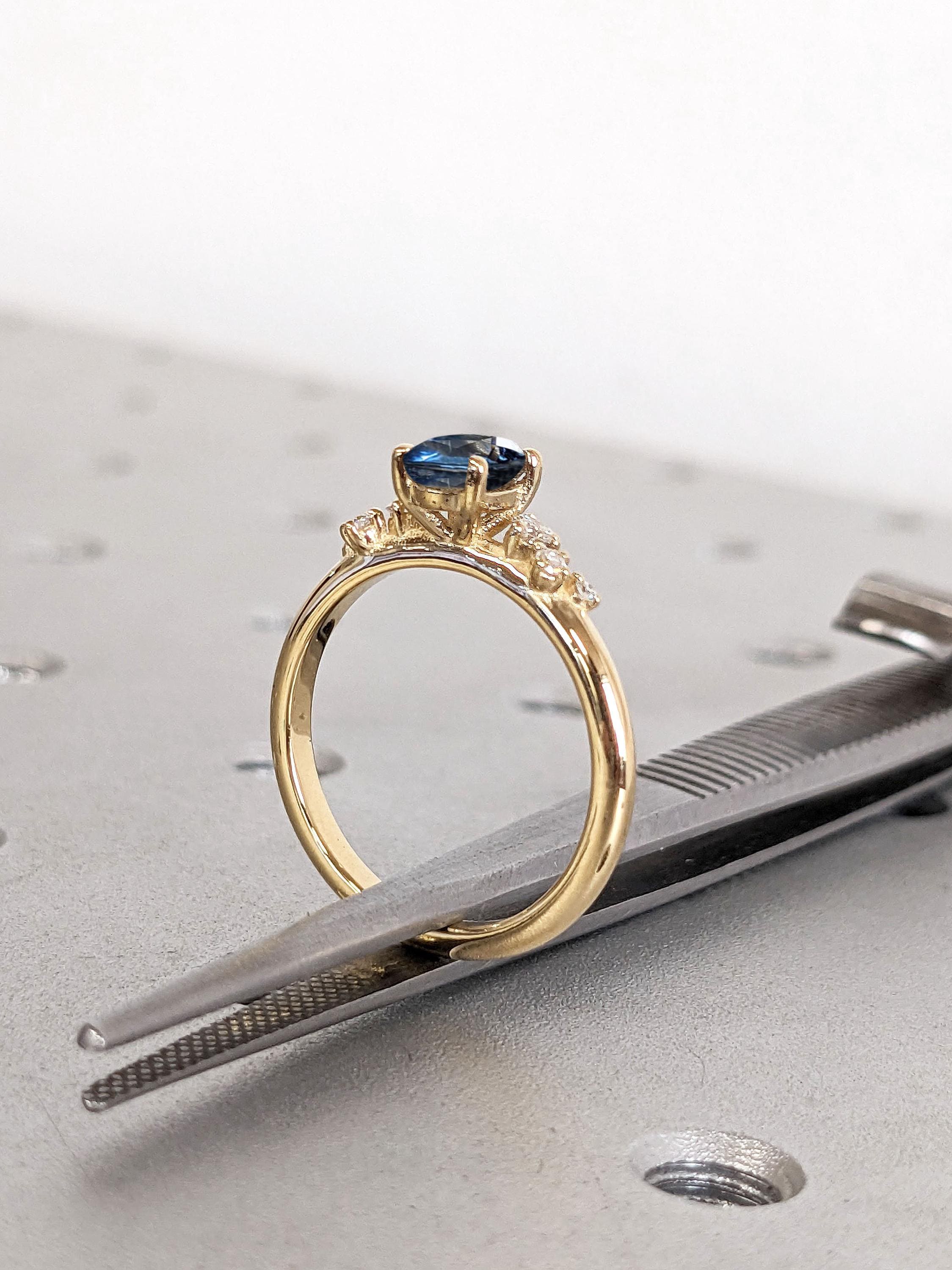 A timeless design featuring an oval cut Sapphire focal stone, accented by round cut side stones cluster, elegantly set in a snowdrift pattern on a 2mm width band. The tiny side stones are available in either natural diamonds, lab diamonds or moissanites. This unique handmade jewelry is a wonderful gift for any special occasion such as engagement, wedding anniversary or birthday.