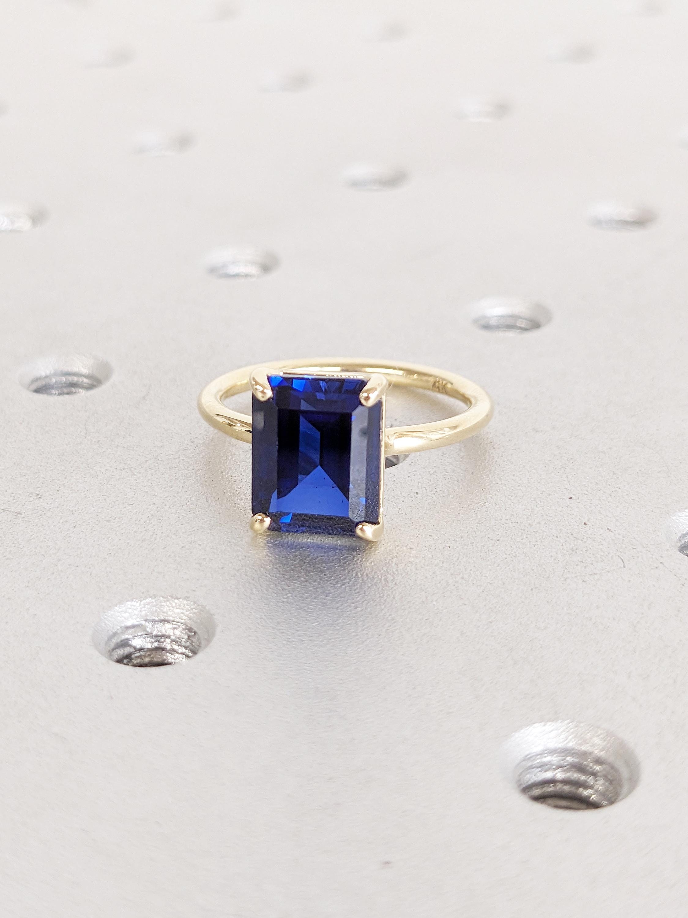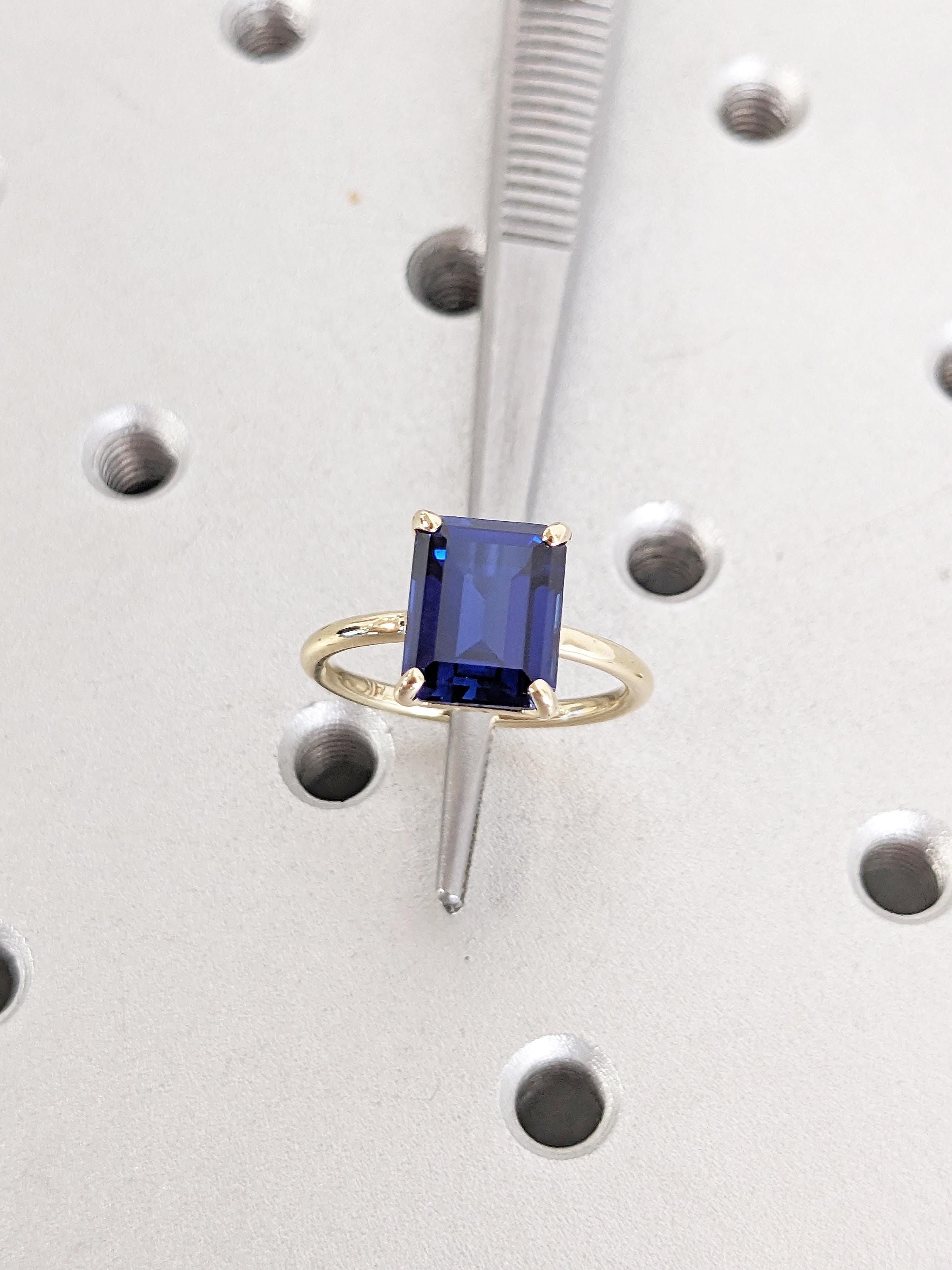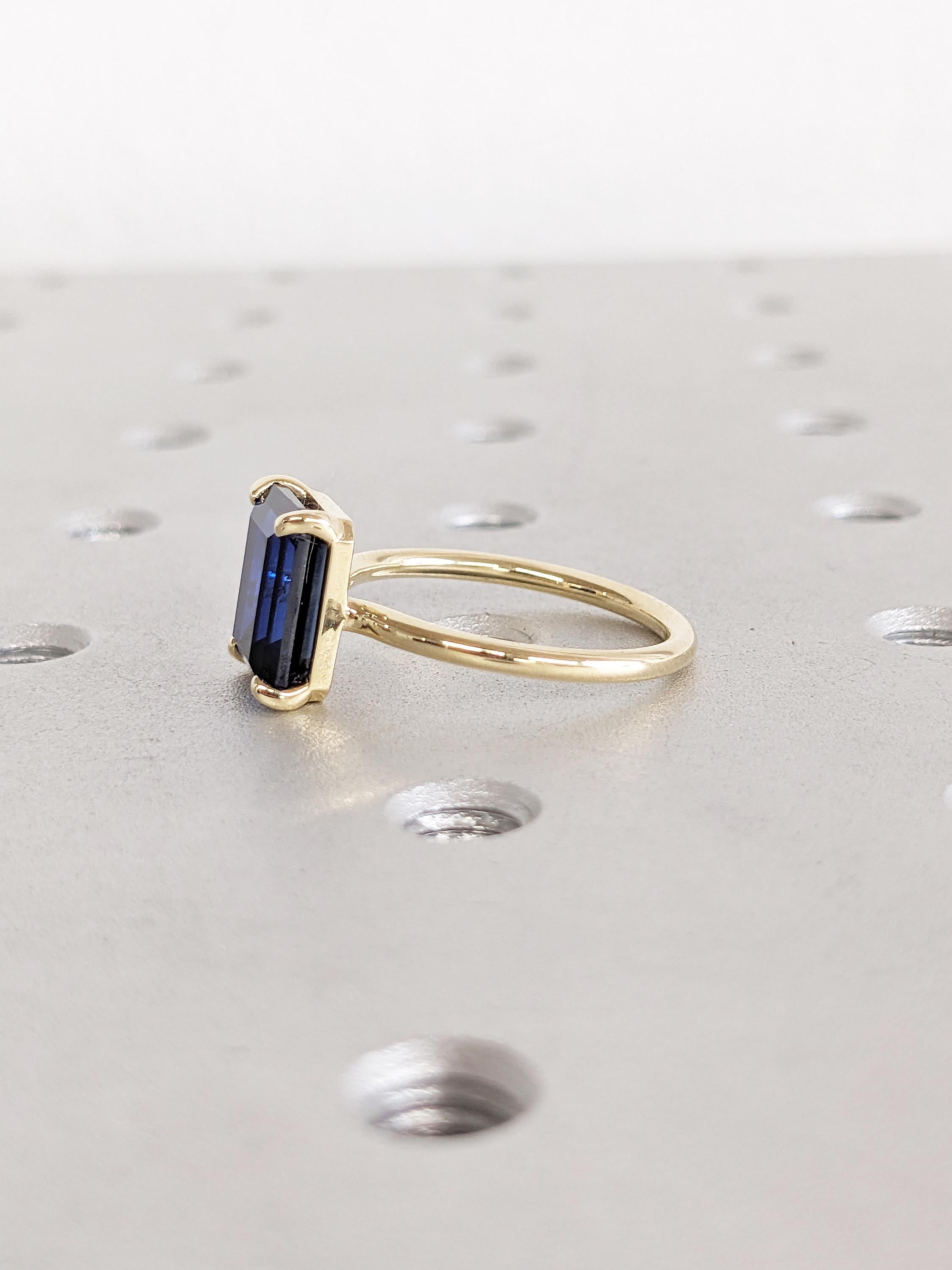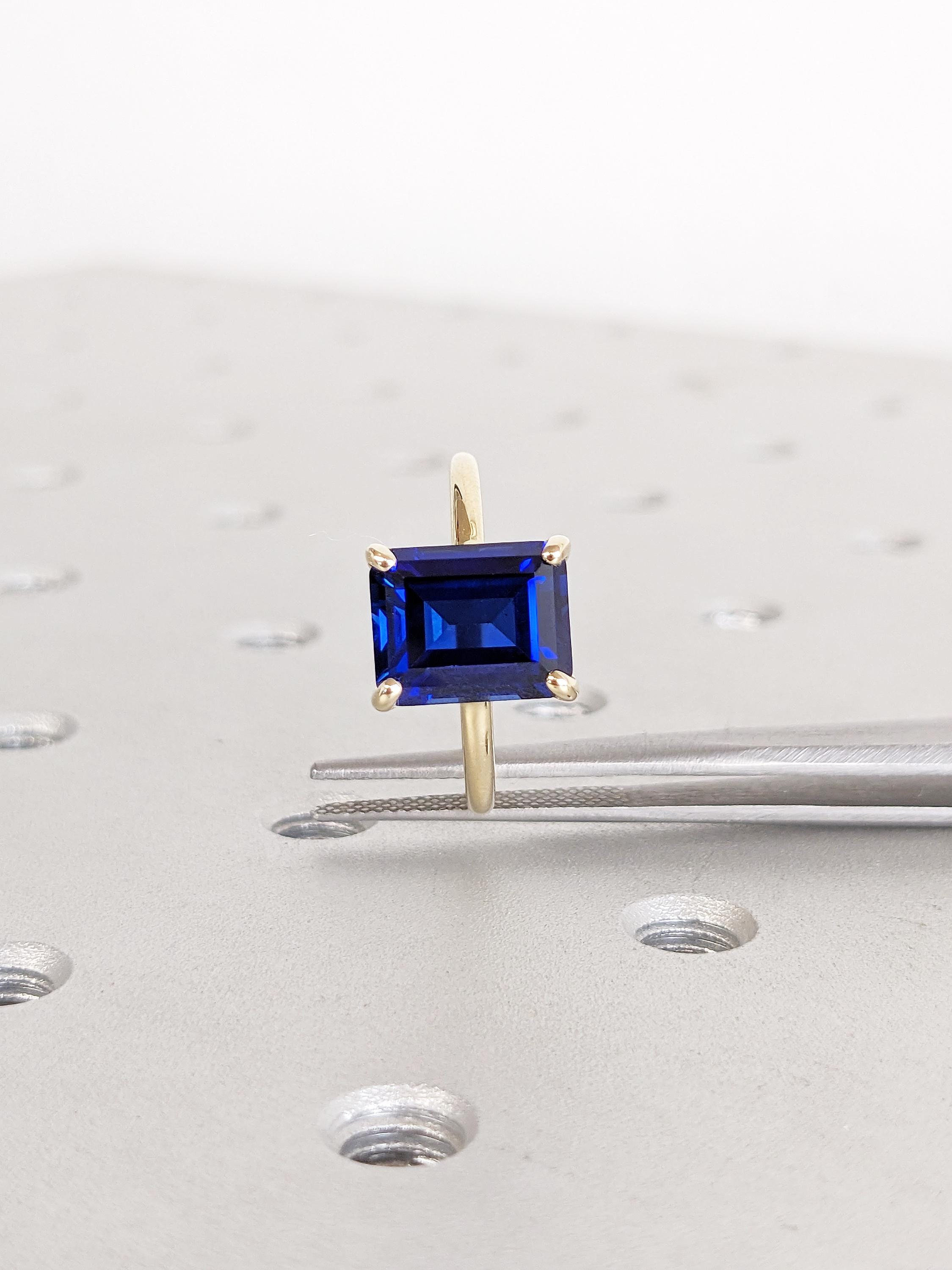 Minimalist and bold, this statement jewelry features a timeless emerald cut Lab Grown Sapphire center, with a low profile, open gallery setting on a rounded dainty thin band of 1.8mm width. This solitaire ring dazzles from all angles and wears comfortably, makes it the perfect accessory or gift for any occasion.
