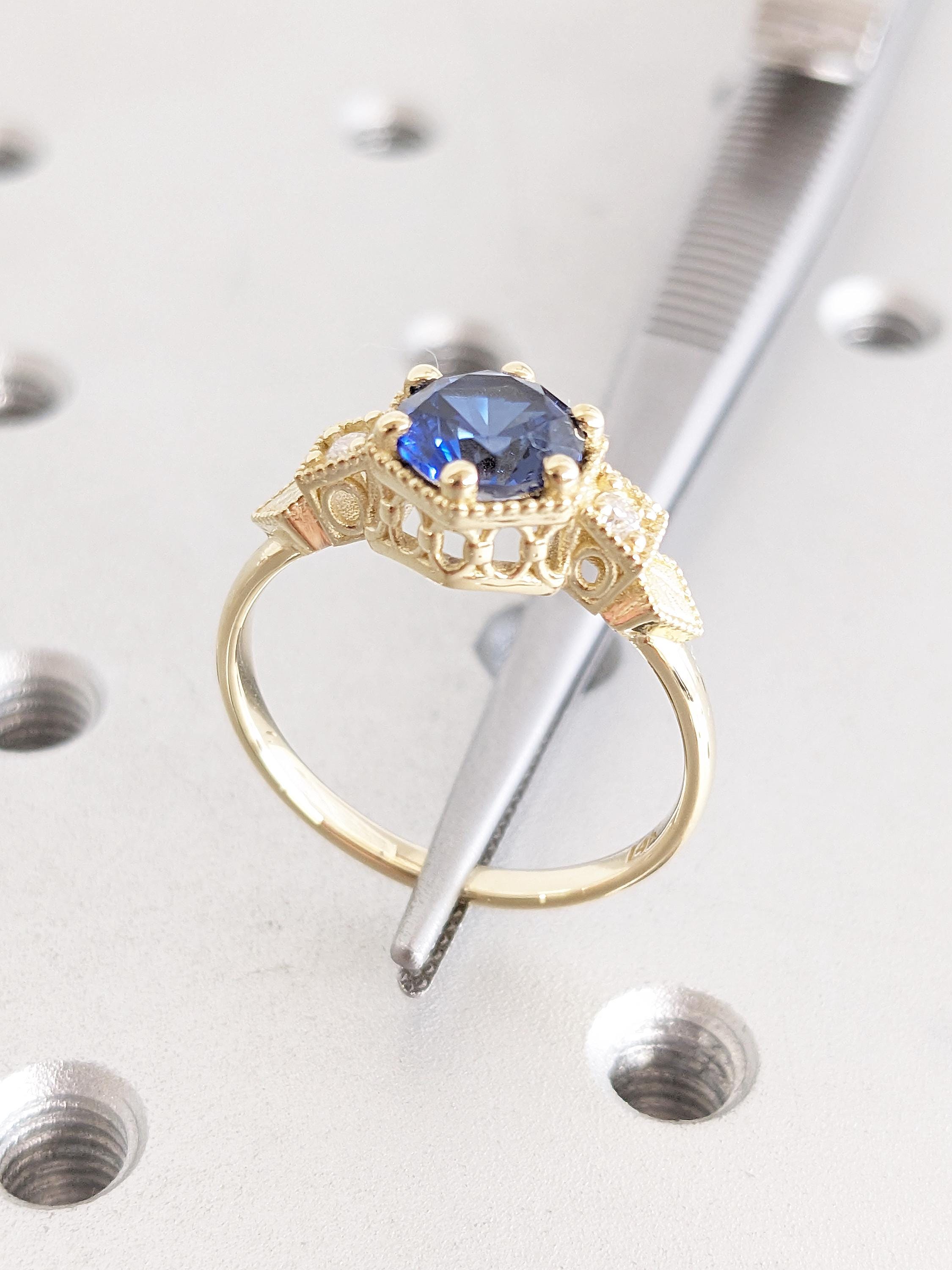 Blue Sapphire Ring, Milgrain Solid Gold Ring, Lab Sapphire Engagement Ring, Art Deco Round Sapphire Ring, Birthstone Jewelry, Bridal Ring