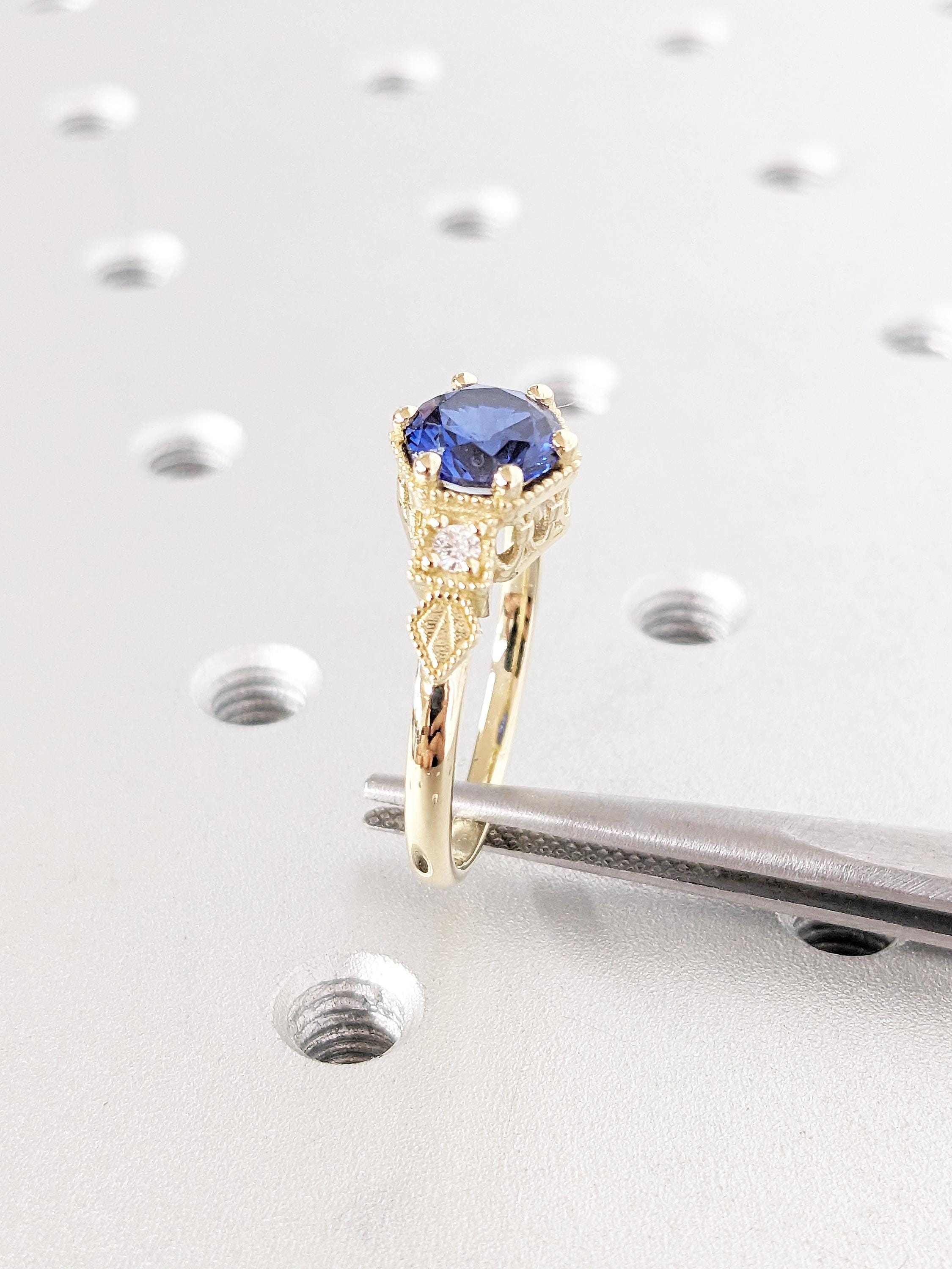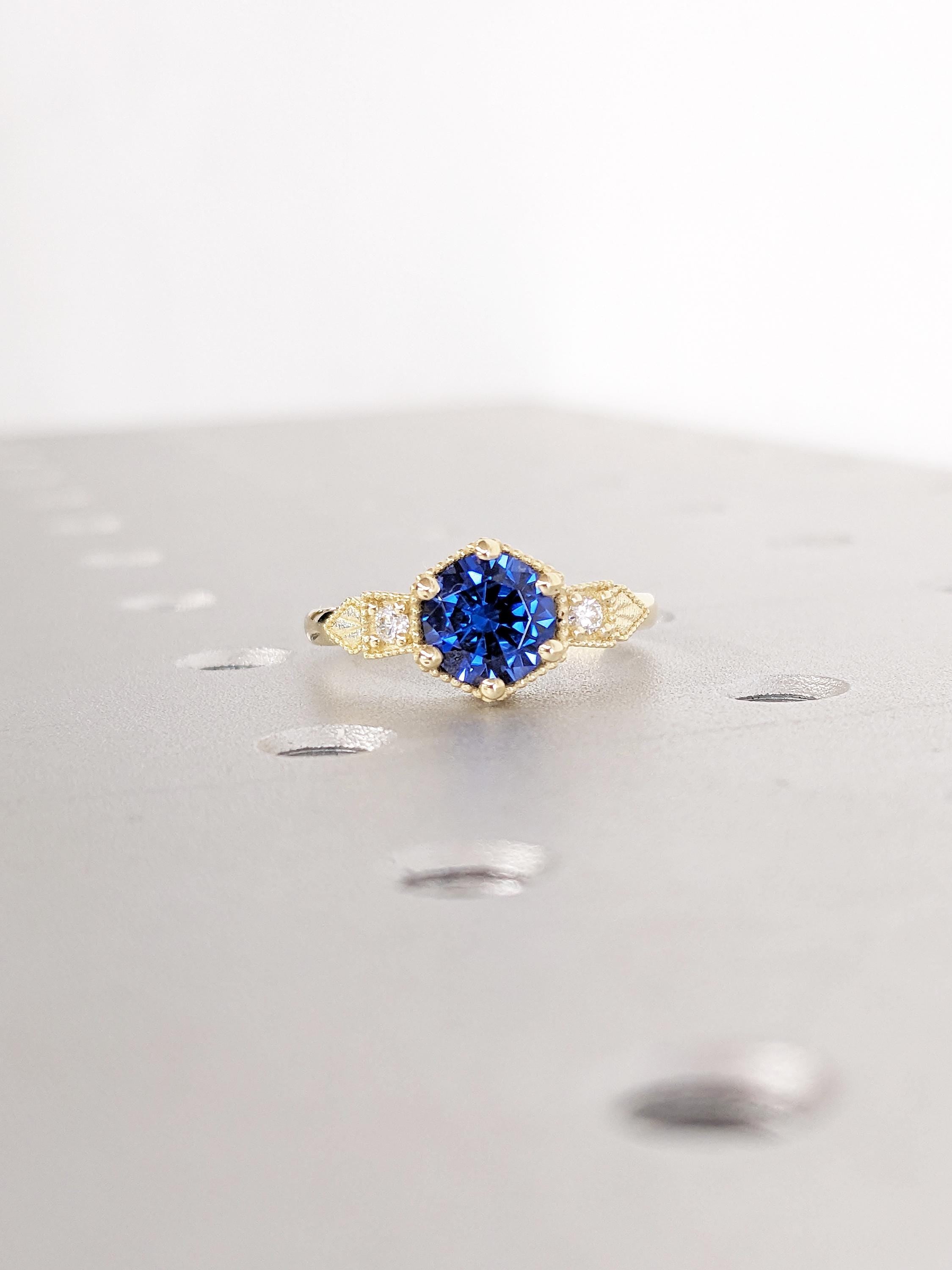 Celebrate the beginning of forever with our exquisite engagement ring. This piece features a round cut Lab Sapphire as the center stone, elegantly set in a refined hexagonal setting. Delicate milgrain detailing lends a touch of timeless vintage charm, while shimmering Natural Diamonds, Lab Grown Diamonds or Moissanites side stones amplify its brilliance. Perfect for symbolizing a love that lasts a lifetime.