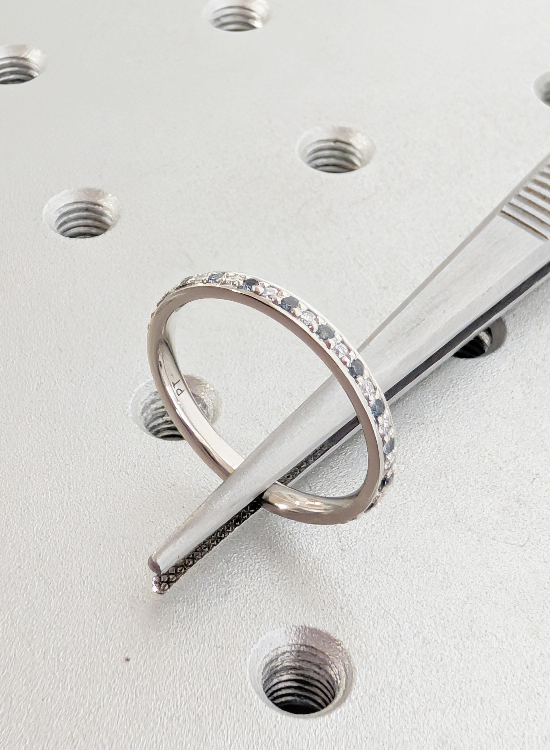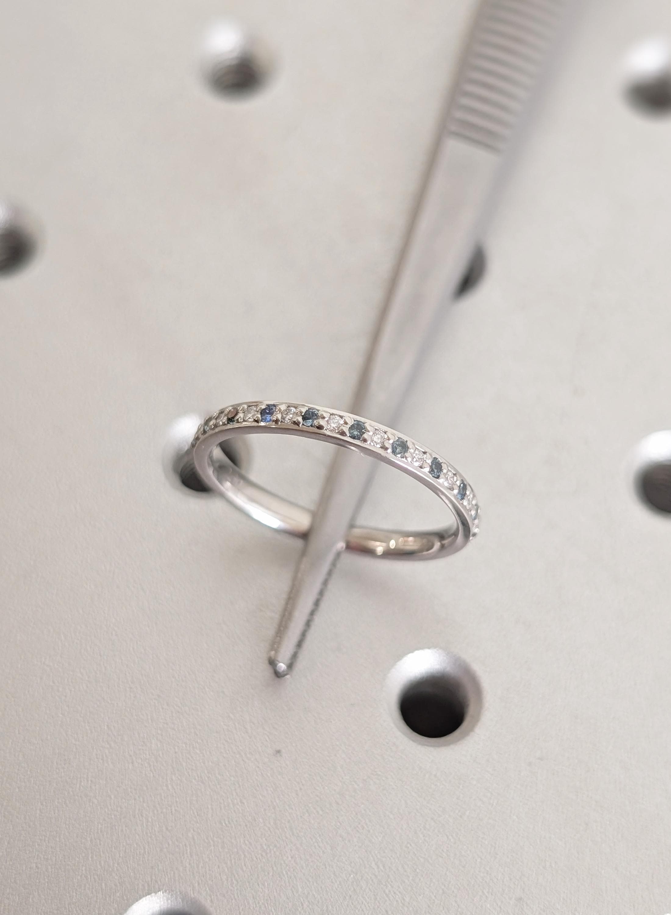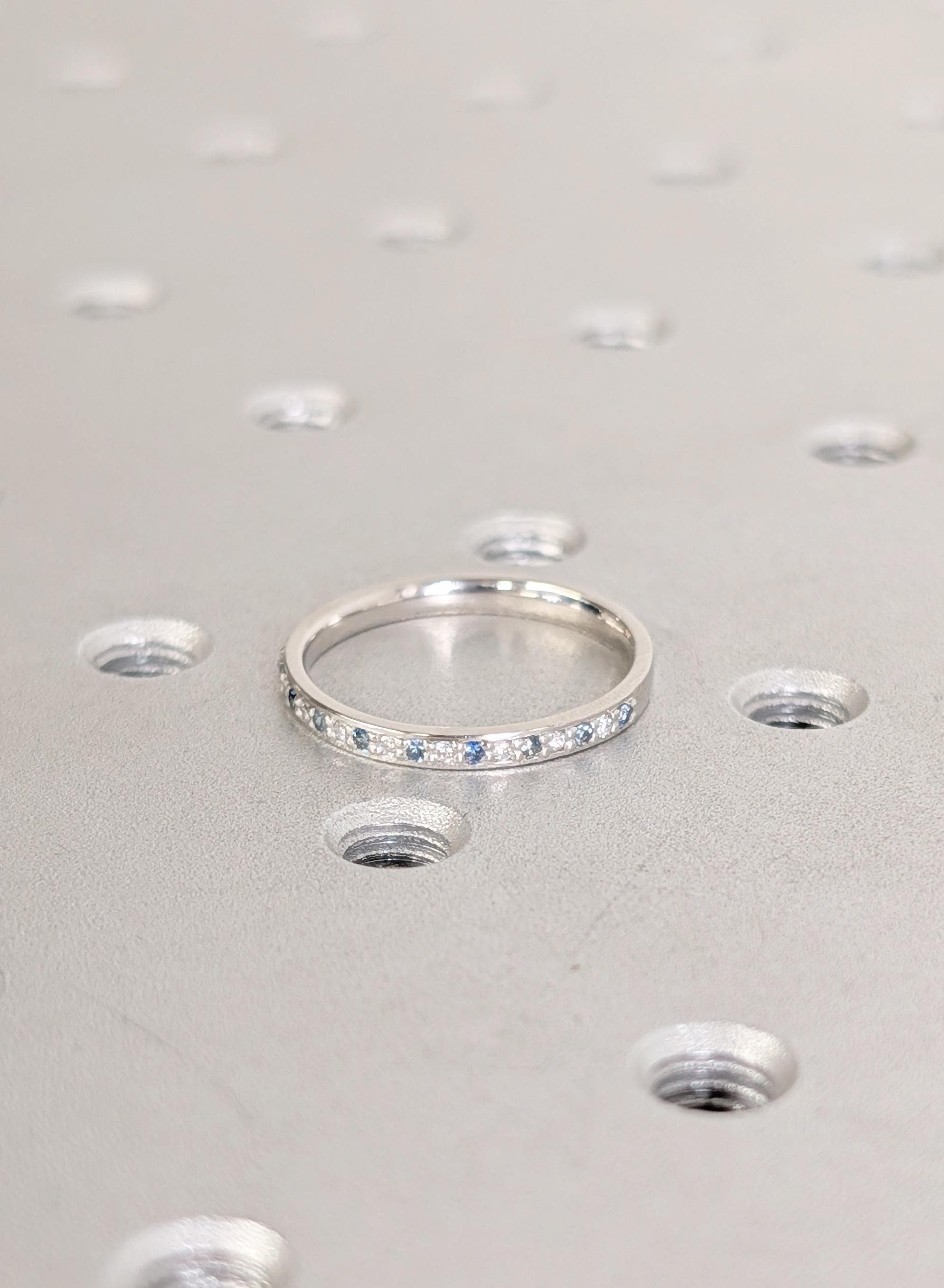 This elegant matching ring features round pave-set Diamond, Moissanite or Lab Diamond paired with soft blue Sapphire accents, creating a gentle contrast along the band. The slim profile keeps the look refined while adding subtle color and sparkle. Designed to sit beautifully beside an engagement ring, it also works well as a wedding band, anniversary ring, or a meaningful everyday piece.