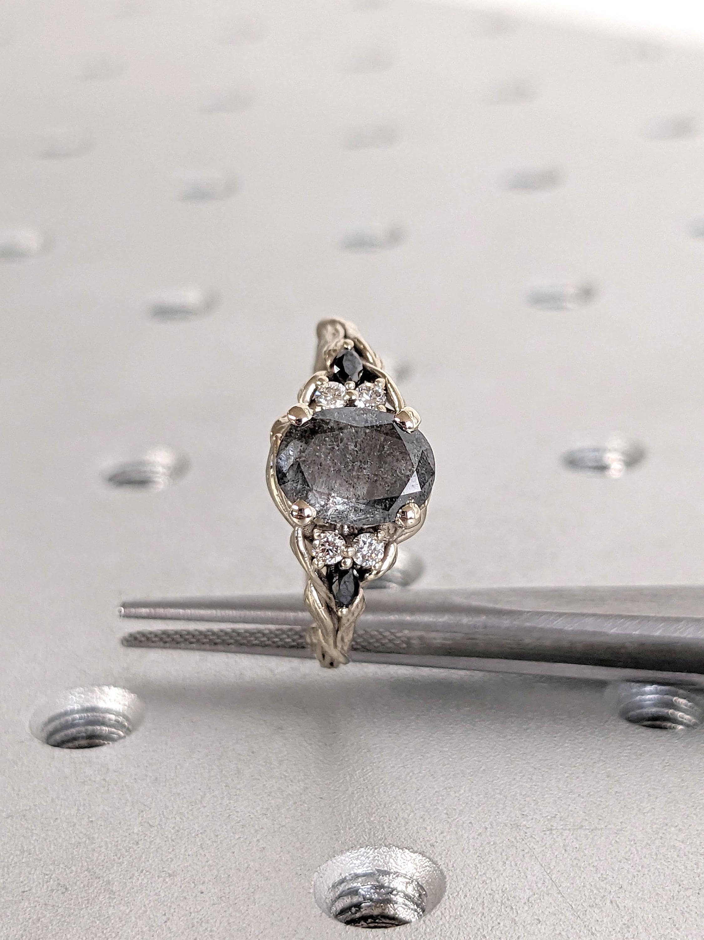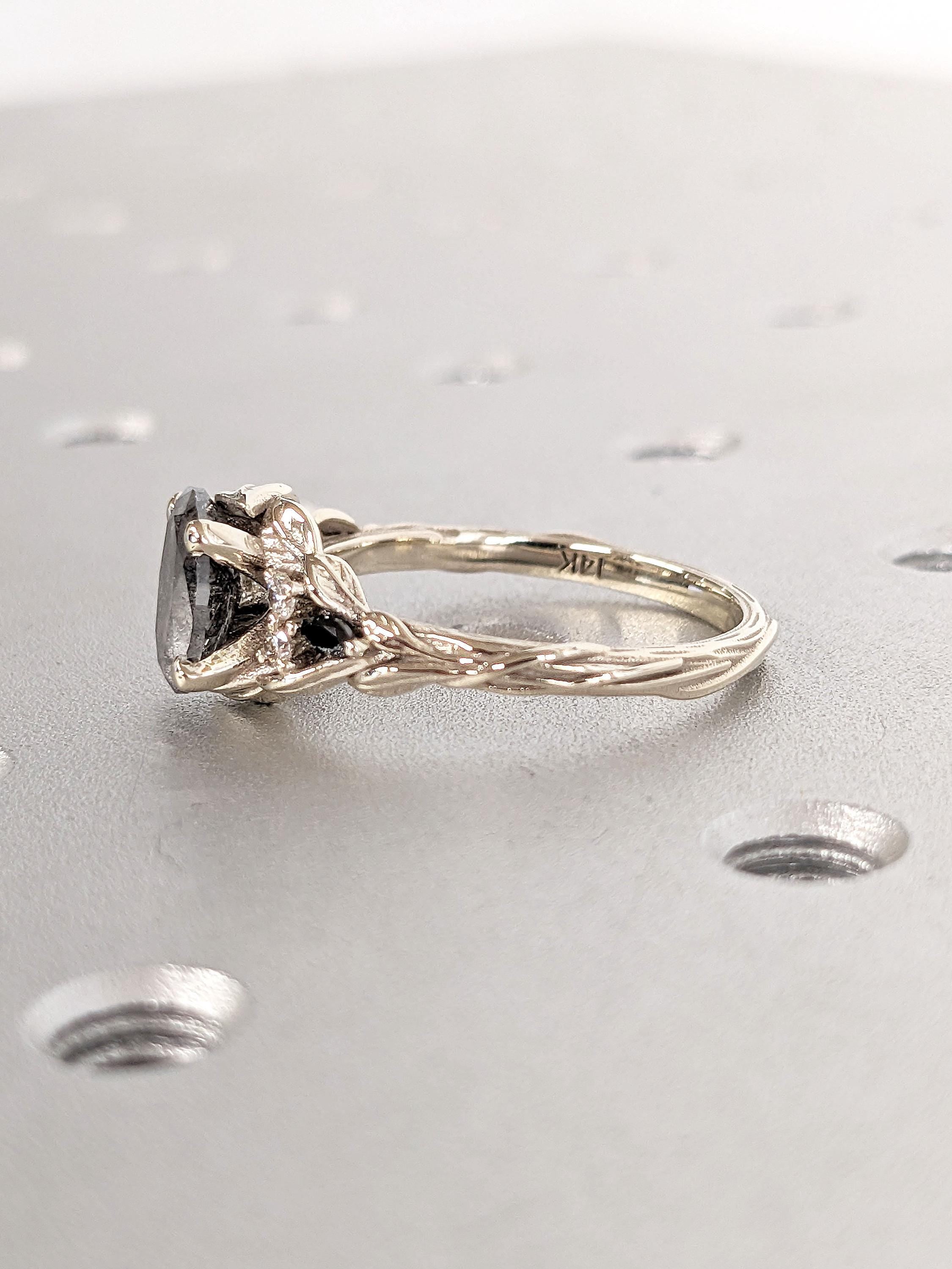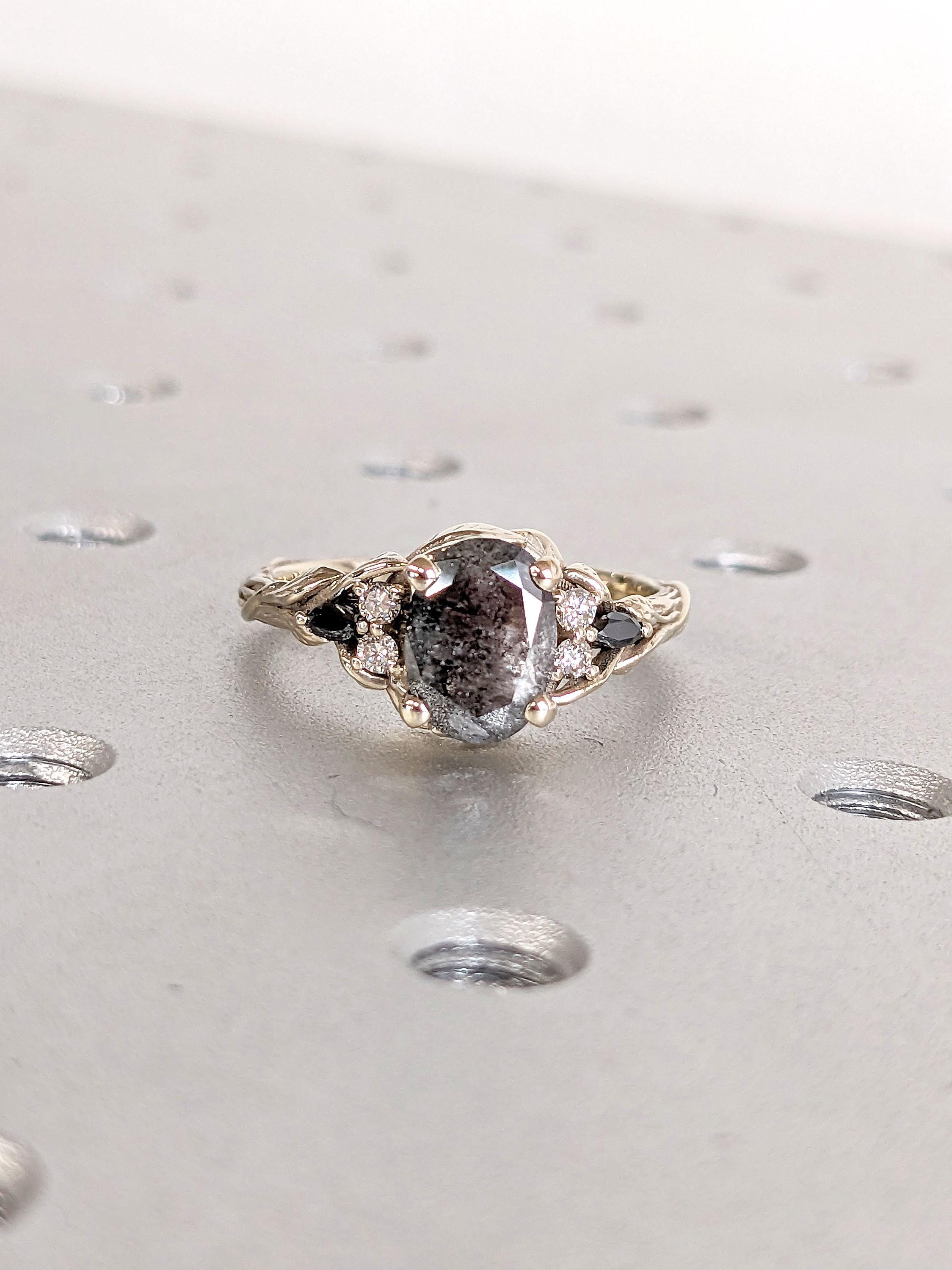 A rustic handmade ring features an oval cut Salt and Pepper Diamond focal stone, accented by round cut white gemstones and marquise cut black diamond side stones. With twig and branches engraved band and graceful leaves embracing the seven gemstones, this nature inspired jewelry is the perfect timeless gift for any occasion.
