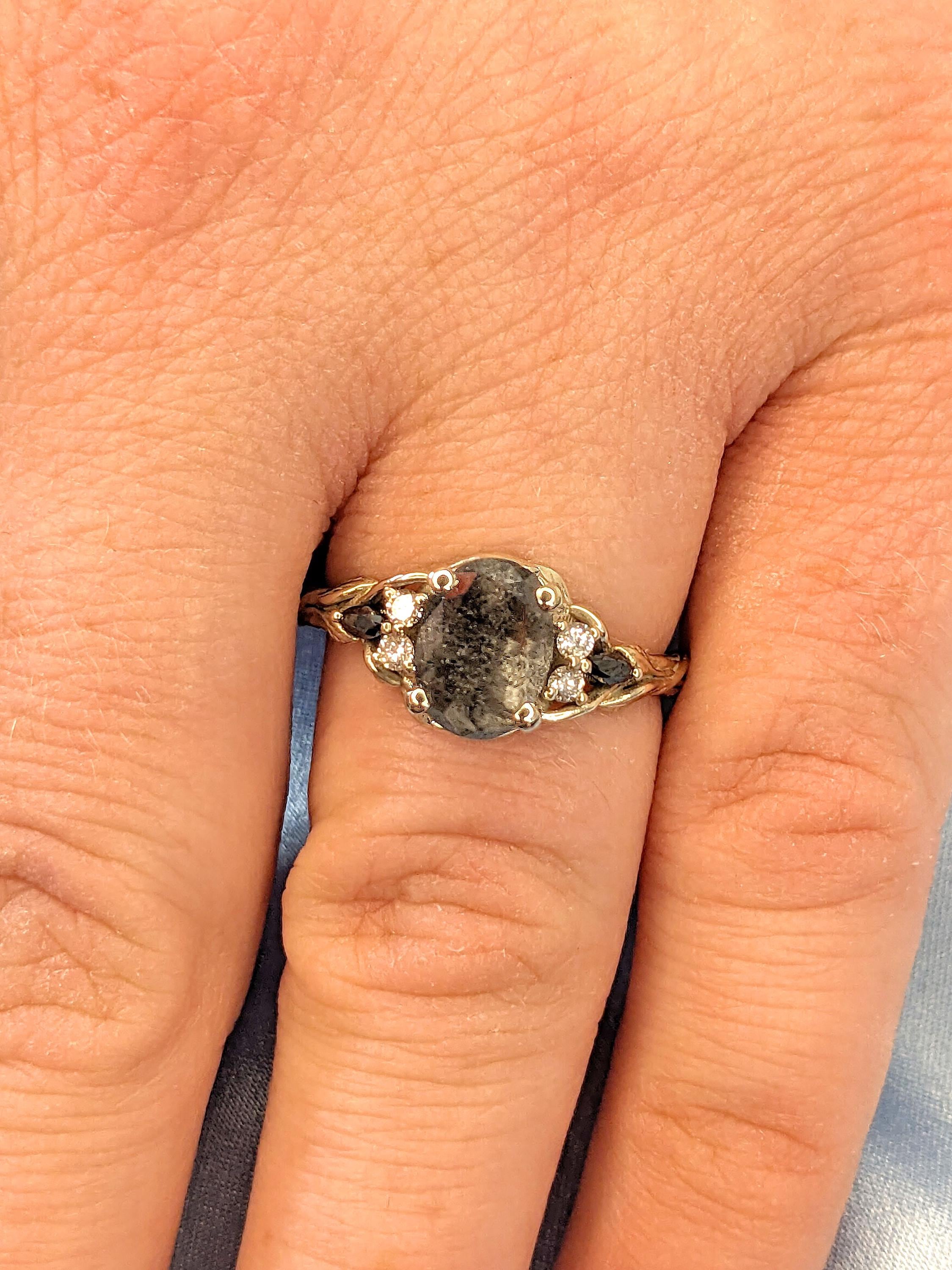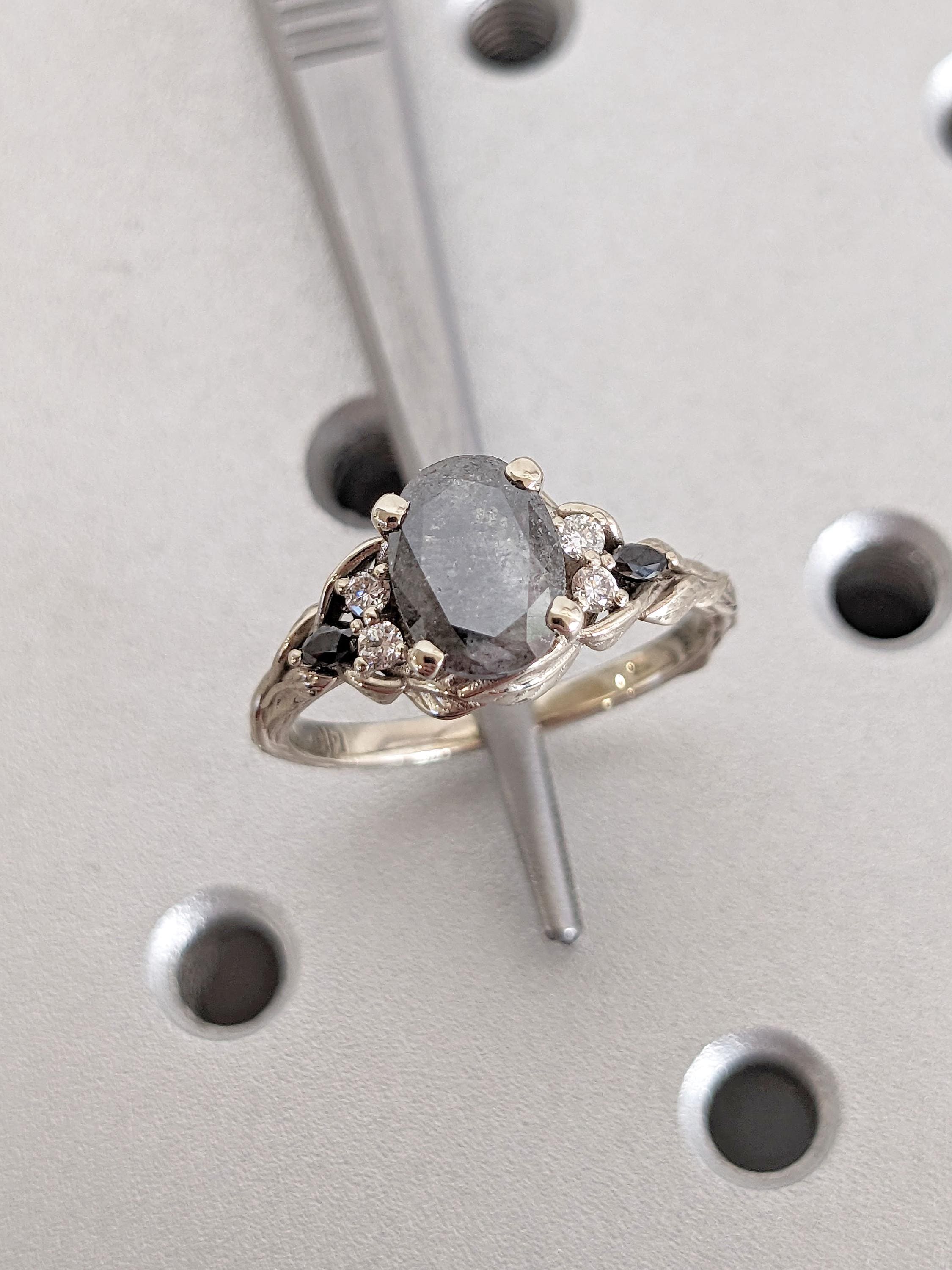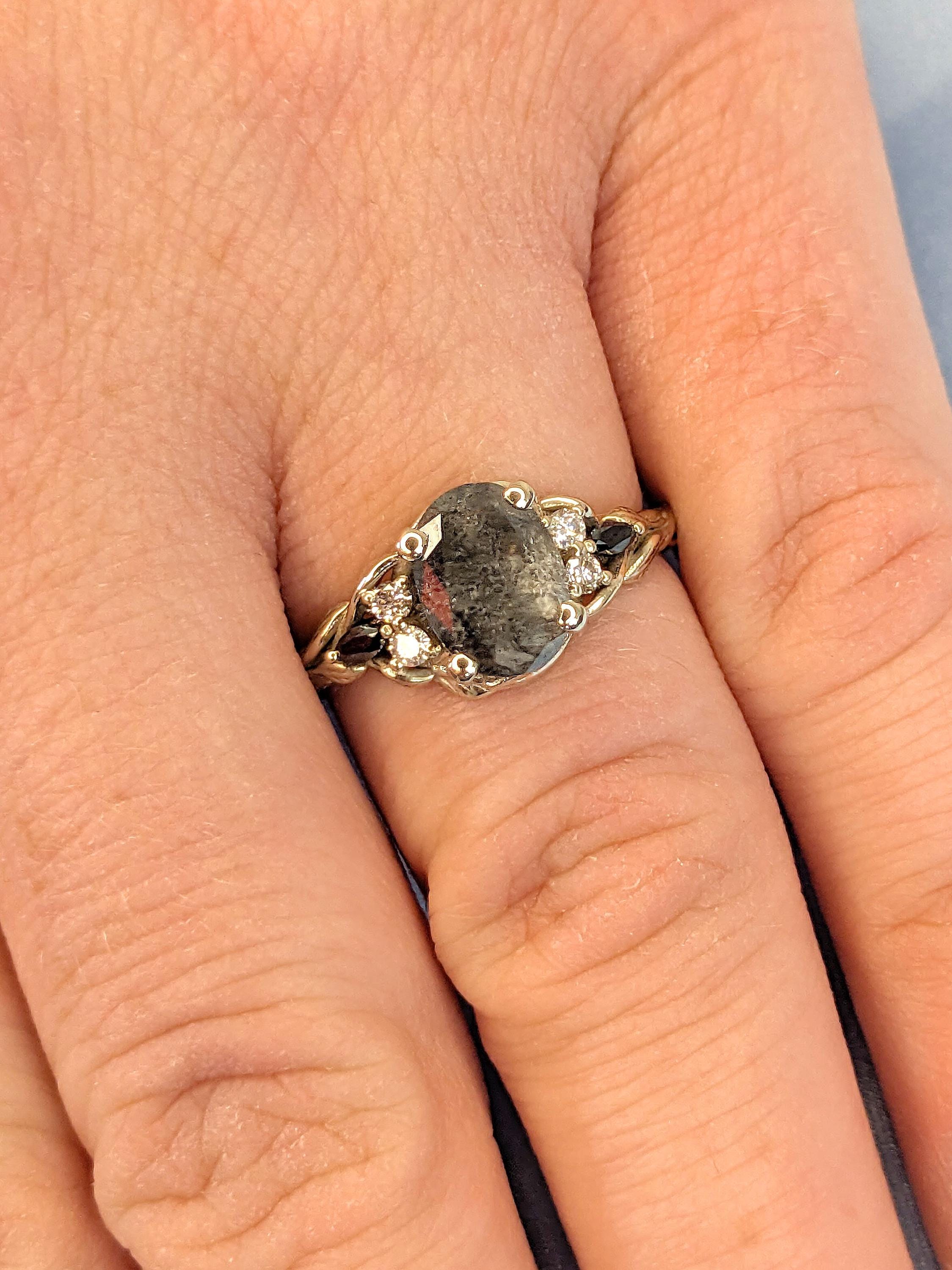A rustic handmade ring features an oval cut Salt and Pepper Diamond focal stone, accented by round cut white gemstones and marquise cut black diamond side stones. With twig and branches engraved band and graceful leaves embracing the seven gemstones, this nature inspired jewelry is the perfect timeless gift for any occasion.