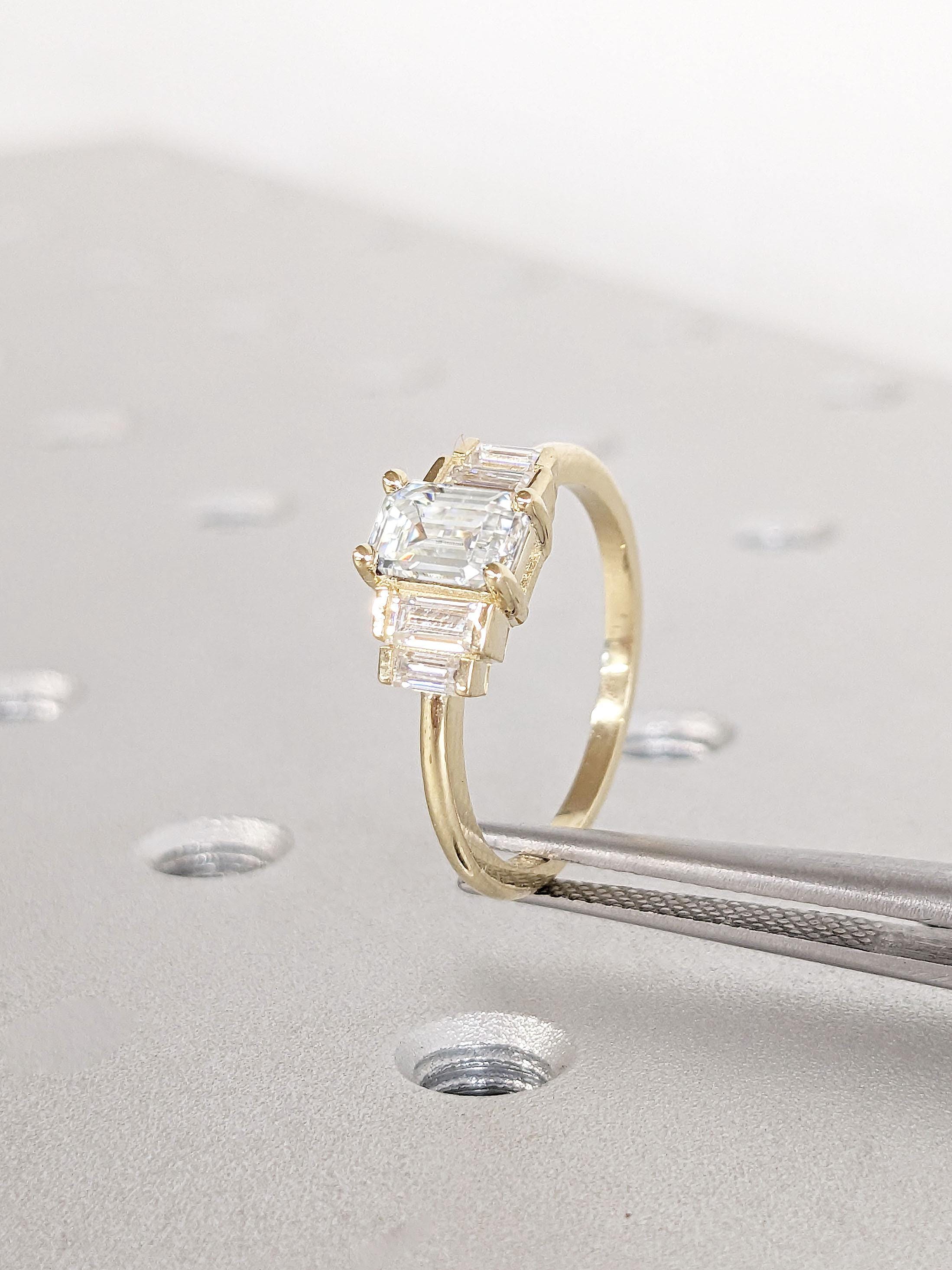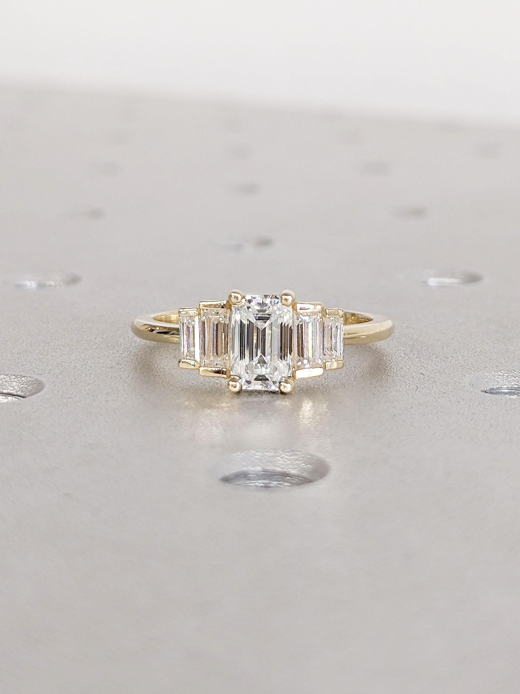 A classy geometrical statement piece, this five stone ring features an emerald cut Lab Created Diamond focal stone, accented by baguette cut side stones in your choice of natural diamonds, lab diamonds or moissanites. Set on a delicate thin band of 1.6mm width, this multi stone ring effortlessly adds a flair of sophistication to your style for any occasion. It's the perfect gift for engagement, wedding anniversary or birthday.