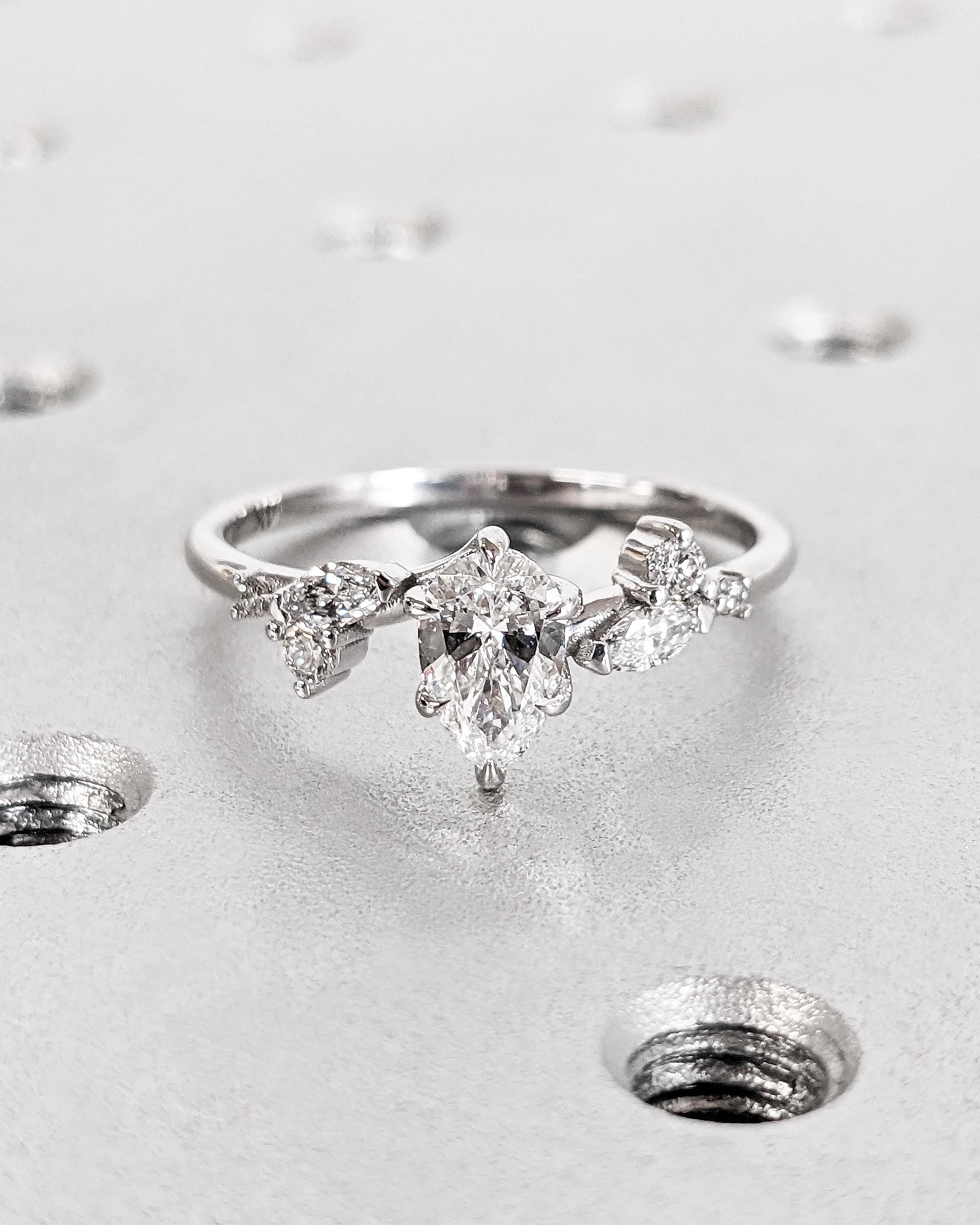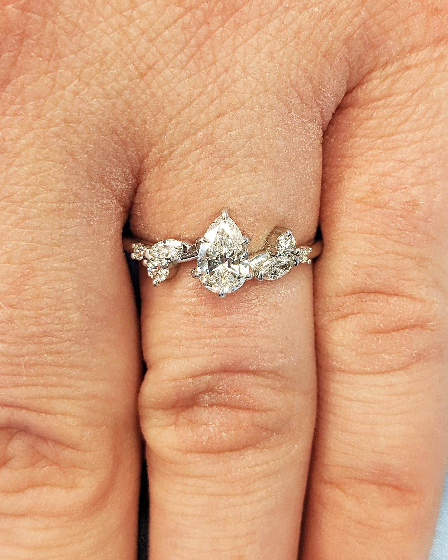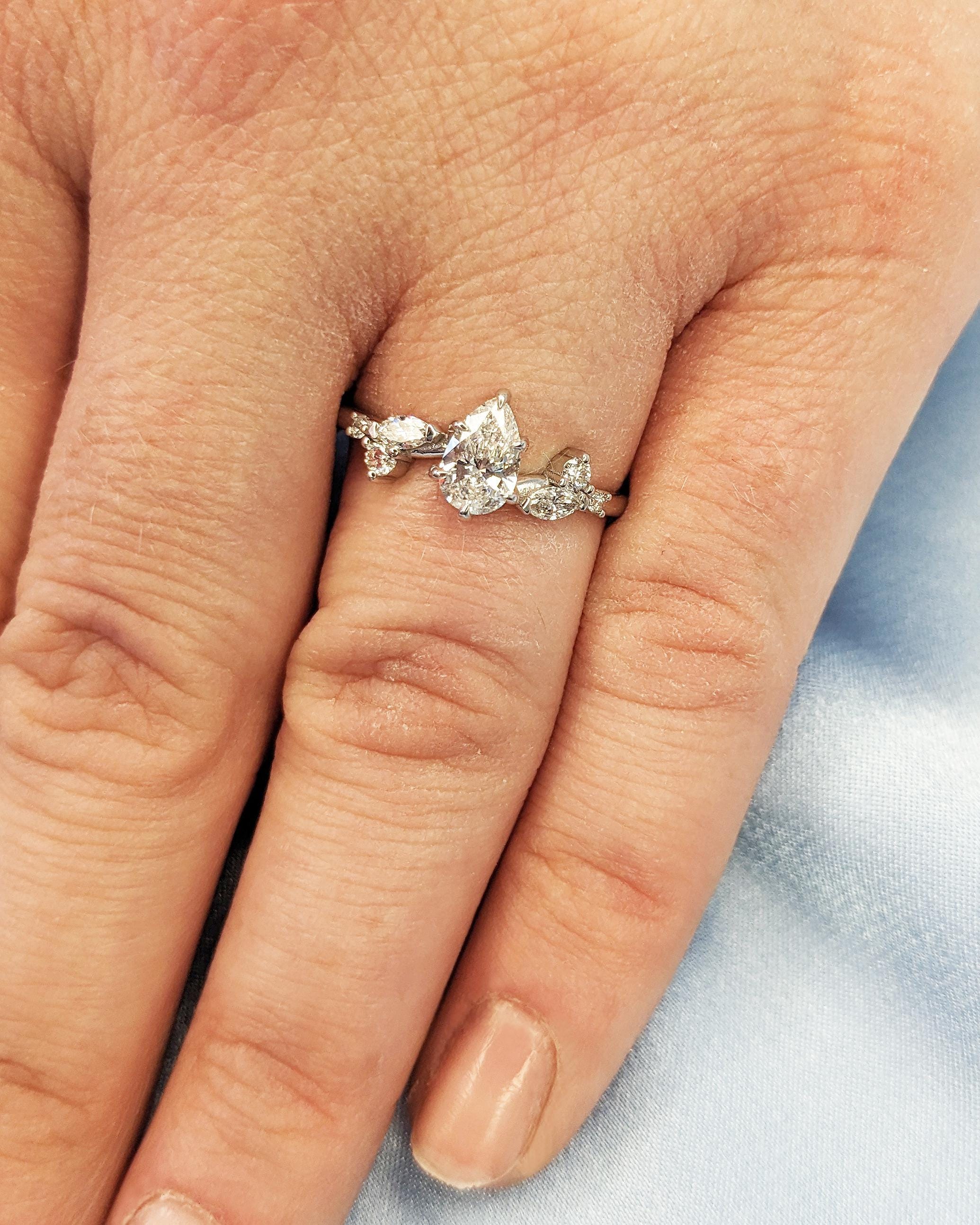 At the heart of this enchanting engagement ring lies a pear-cut lab diamond, secured by six graceful talon prongs for a classic and durable design. The band features round and marquise accent stones resembling the shape of delicate leaves, blending natural beauty with timeless elegance. Personalize your ring with side stones of natural diamonds, lab diamonds, or Moissanites for a unique touch. Perfect for an ethereal wedding, this design beautifully captures the essence of nature and the magic of everlasting love.