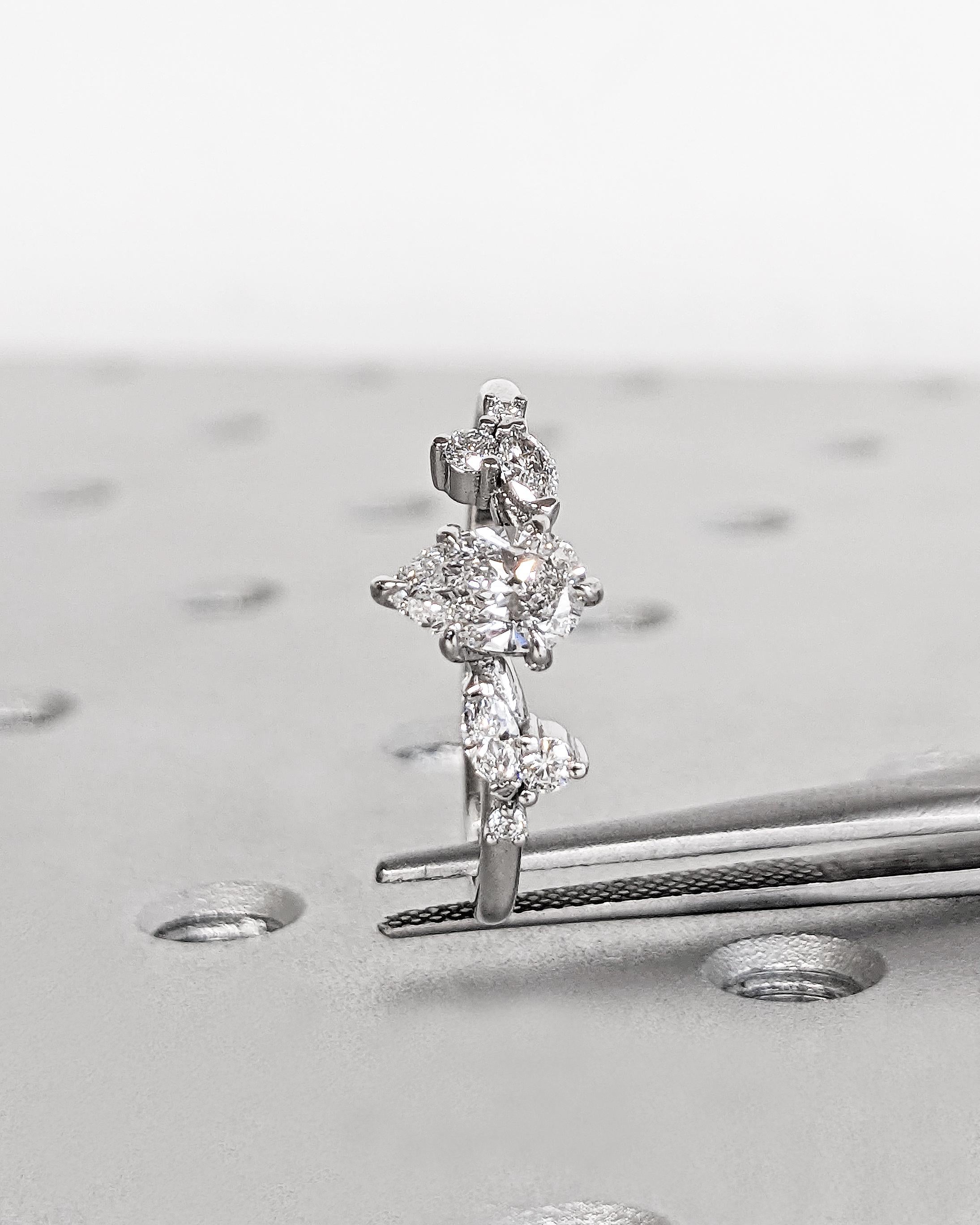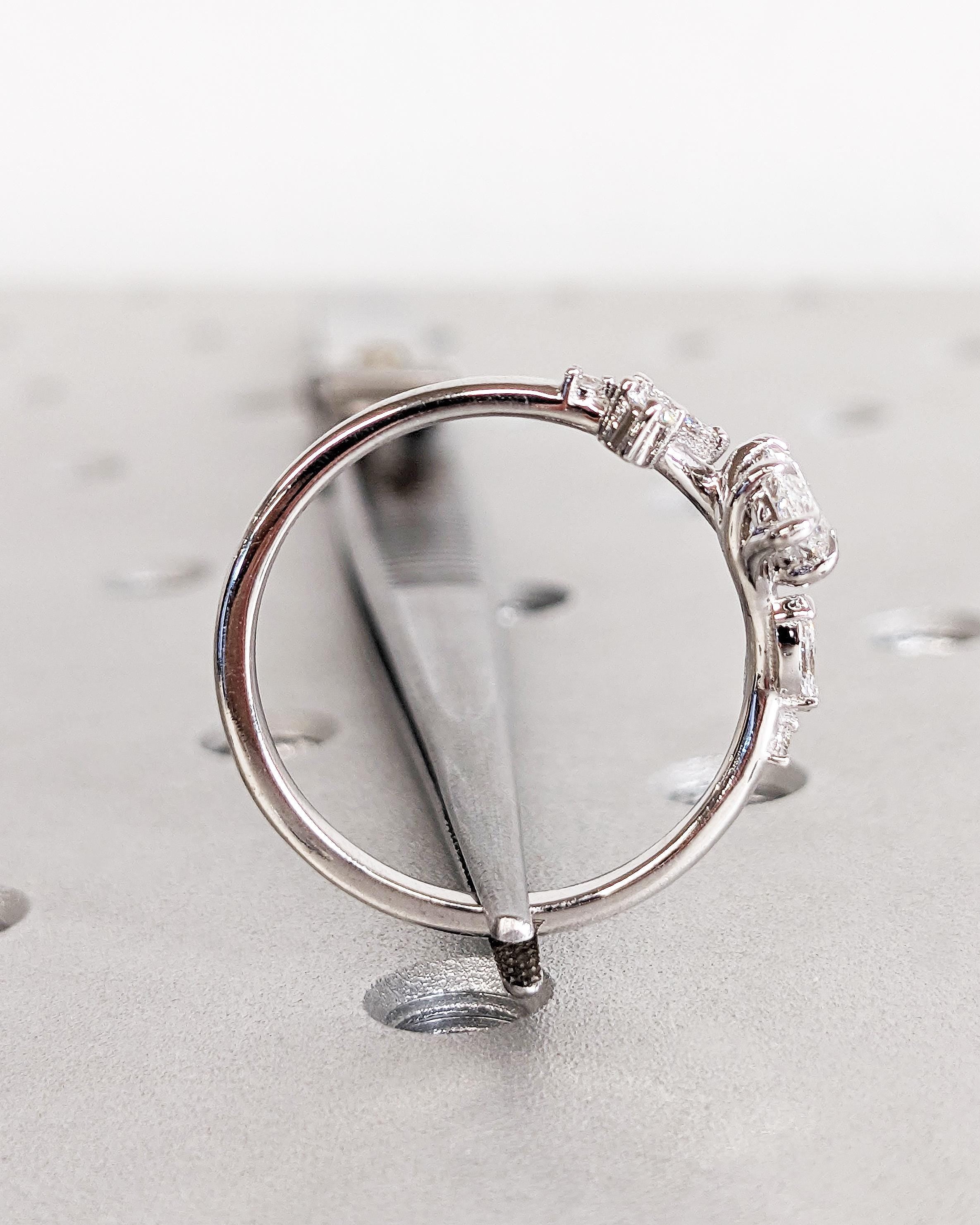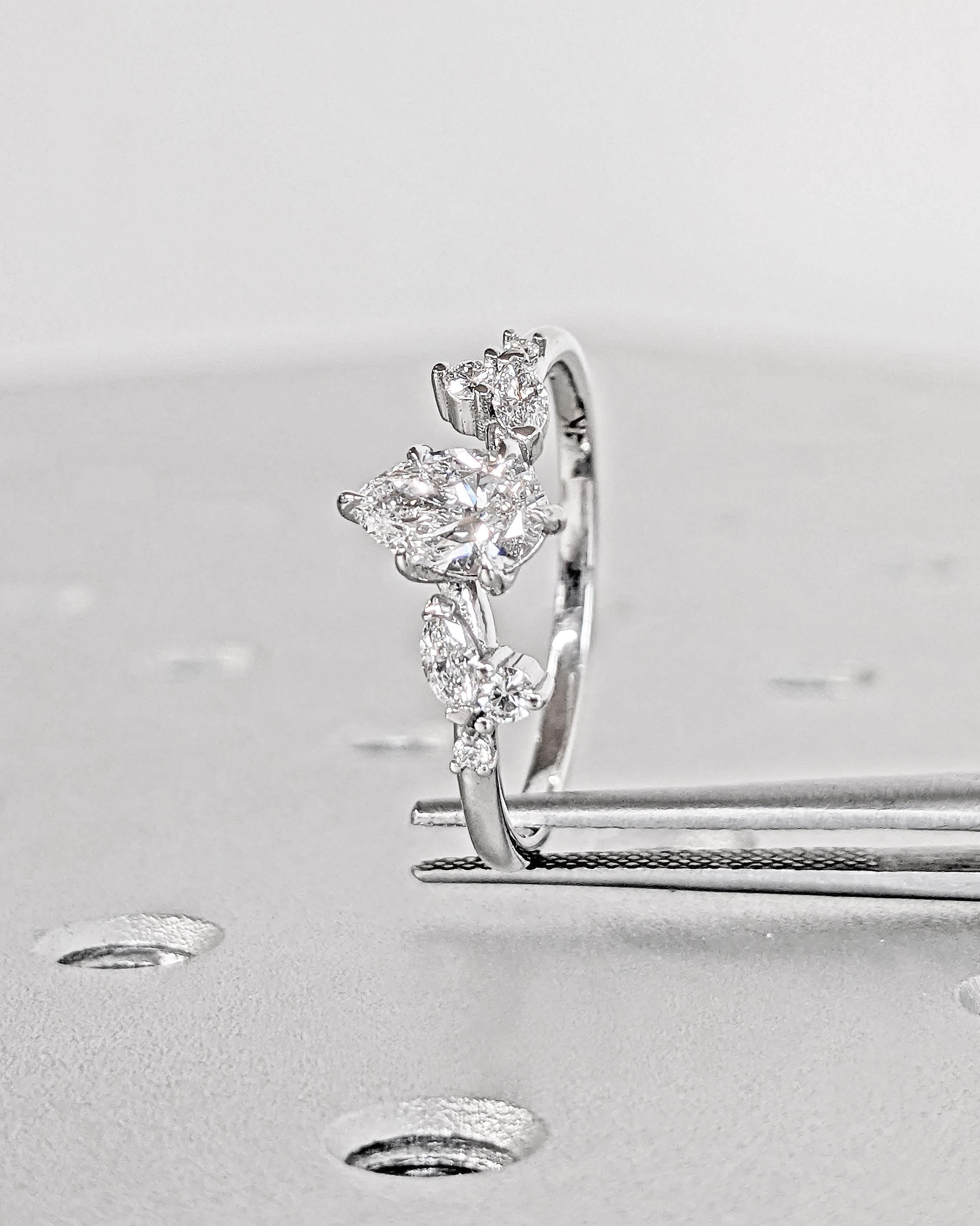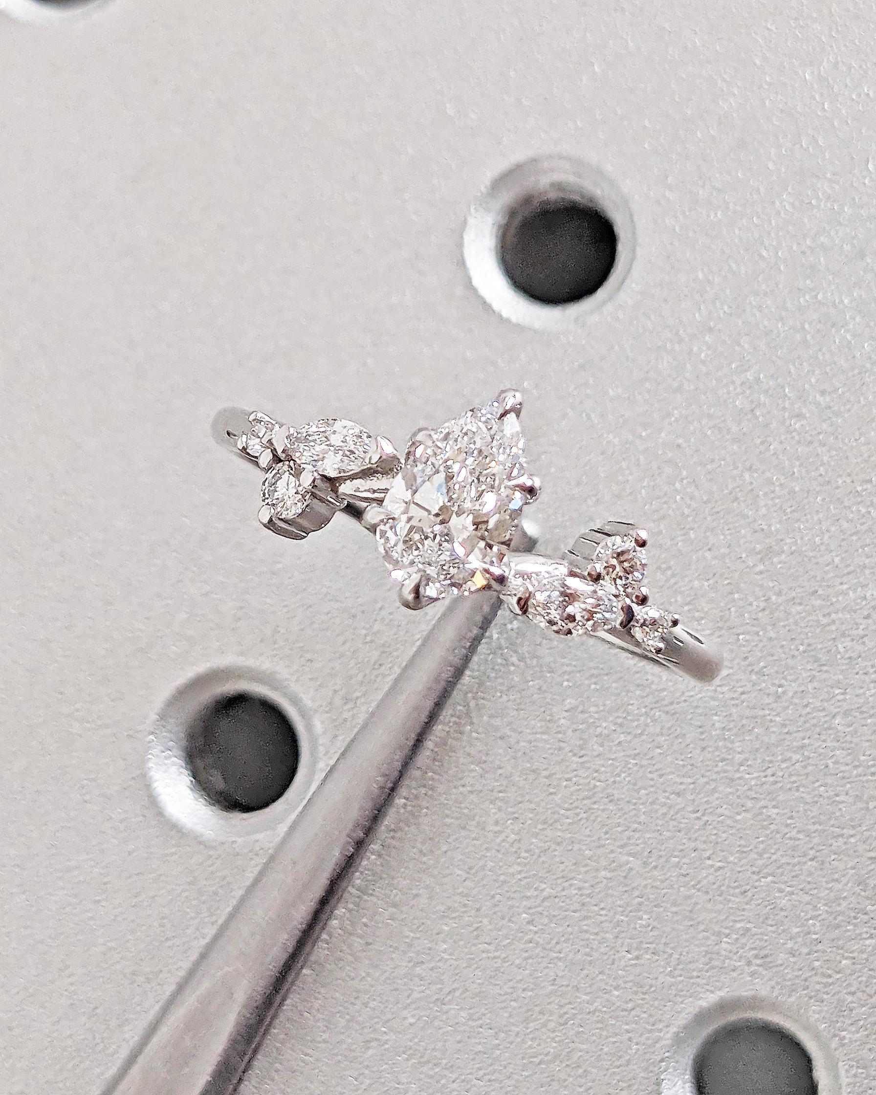 At the heart of this enchanting engagement ring lies a pear-cut lab diamond, secured by six graceful talon prongs for a classic and durable design. The band features round and marquise accent stones resembling the shape of delicate leaves, blending natural beauty with timeless elegance. Personalize your ring with side stones of natural diamonds, lab diamonds, or Moissanites for a unique touch. Perfect for an ethereal wedding, this design beautifully captures the essence of nature and the magic of everlasting love.