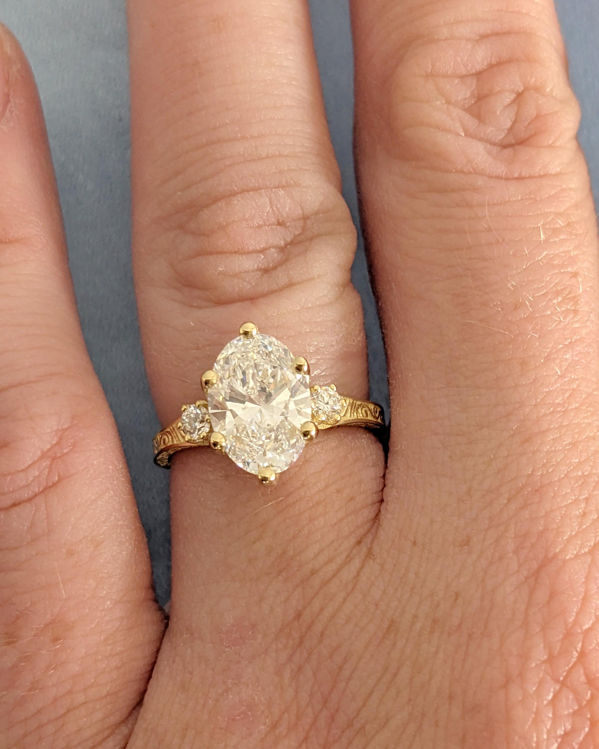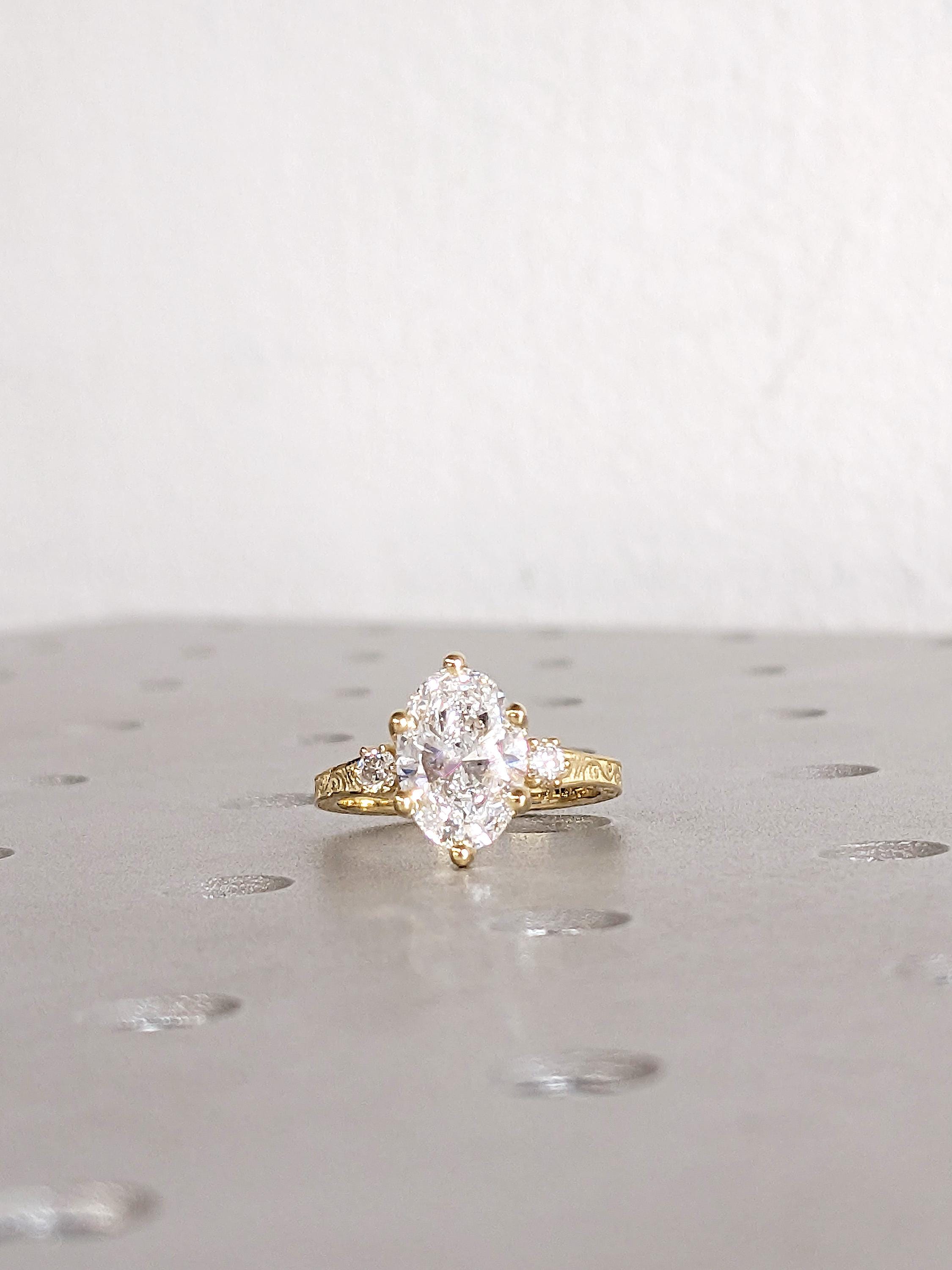 This Oval Lab Diamond engagement ring has a brilliant Lab Diamond center stone in a prong setting, accented by round side stones in Natural Diamond, Lab Grown Diamond, or Moissanite. The elegant sparkle and timeless design make it ideal for engagement, bridal, anniversary, or everyday wear, symbolizing pure love and lasting beauty.