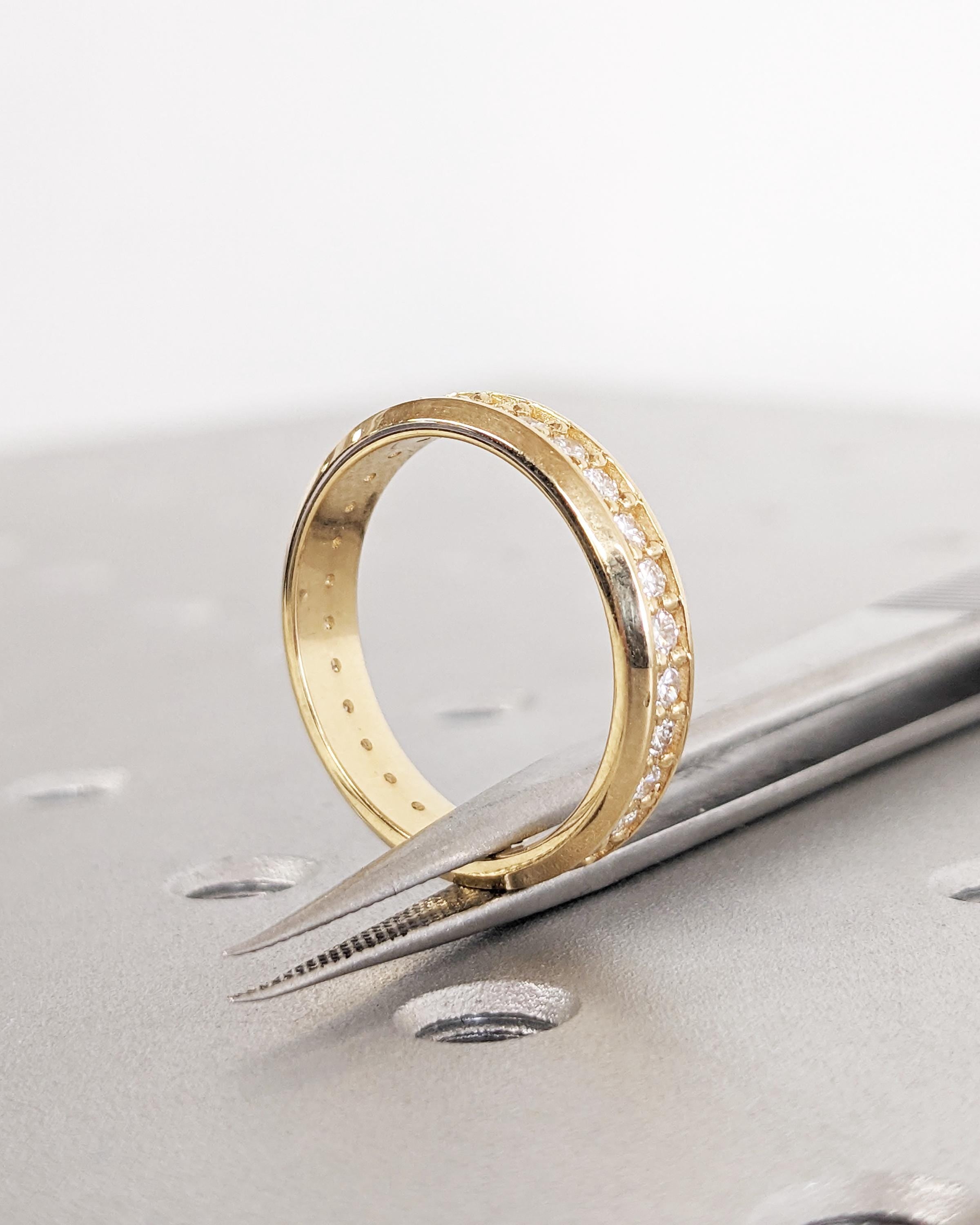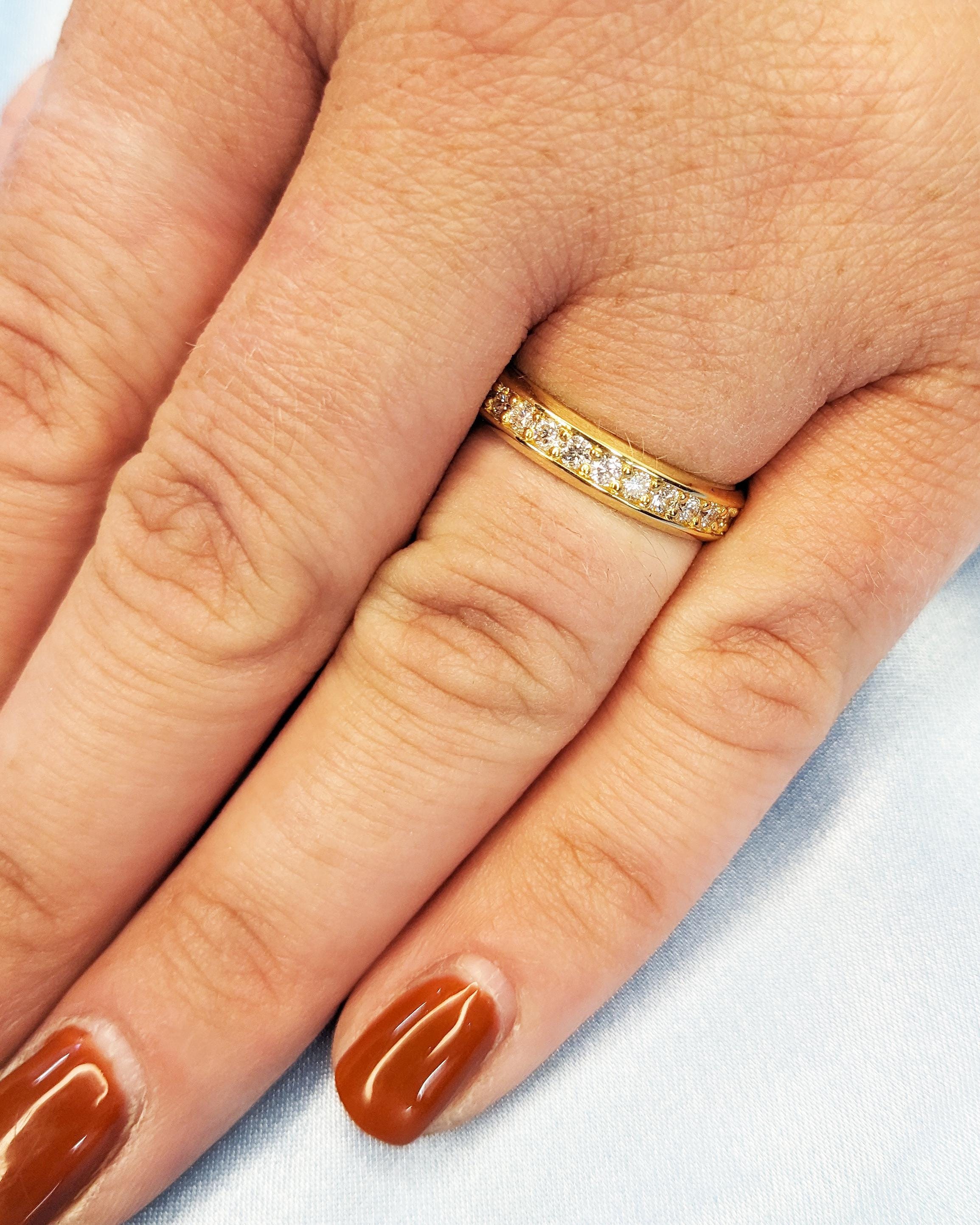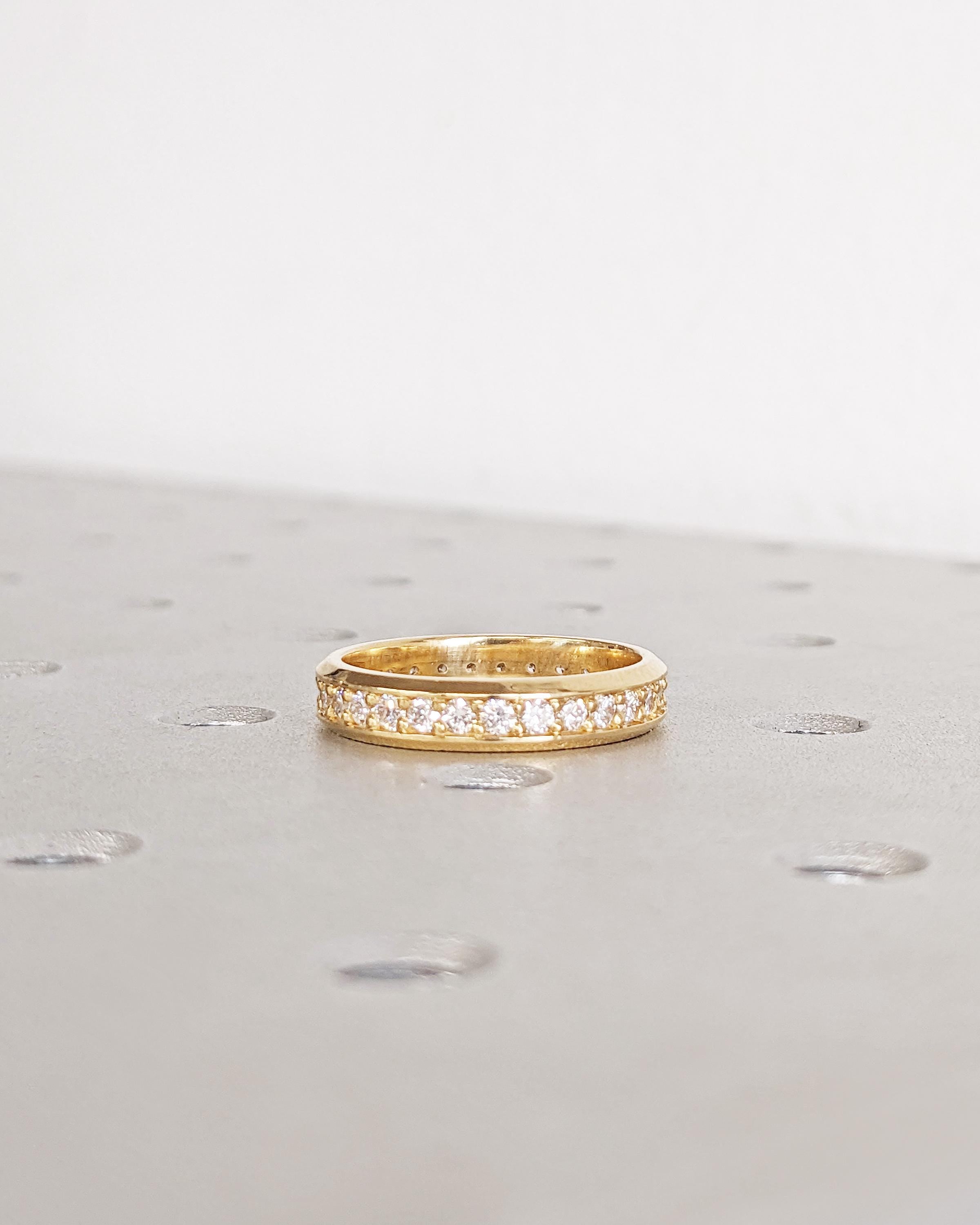 An elegant 4mm full eternity wedding band with channel-set diamonds or moissanites. Its smooth edges make it comfortable for everyday wear. A versatile stacking band or wedding ring for both men and women. Customize in gold or platinum to fit your style.