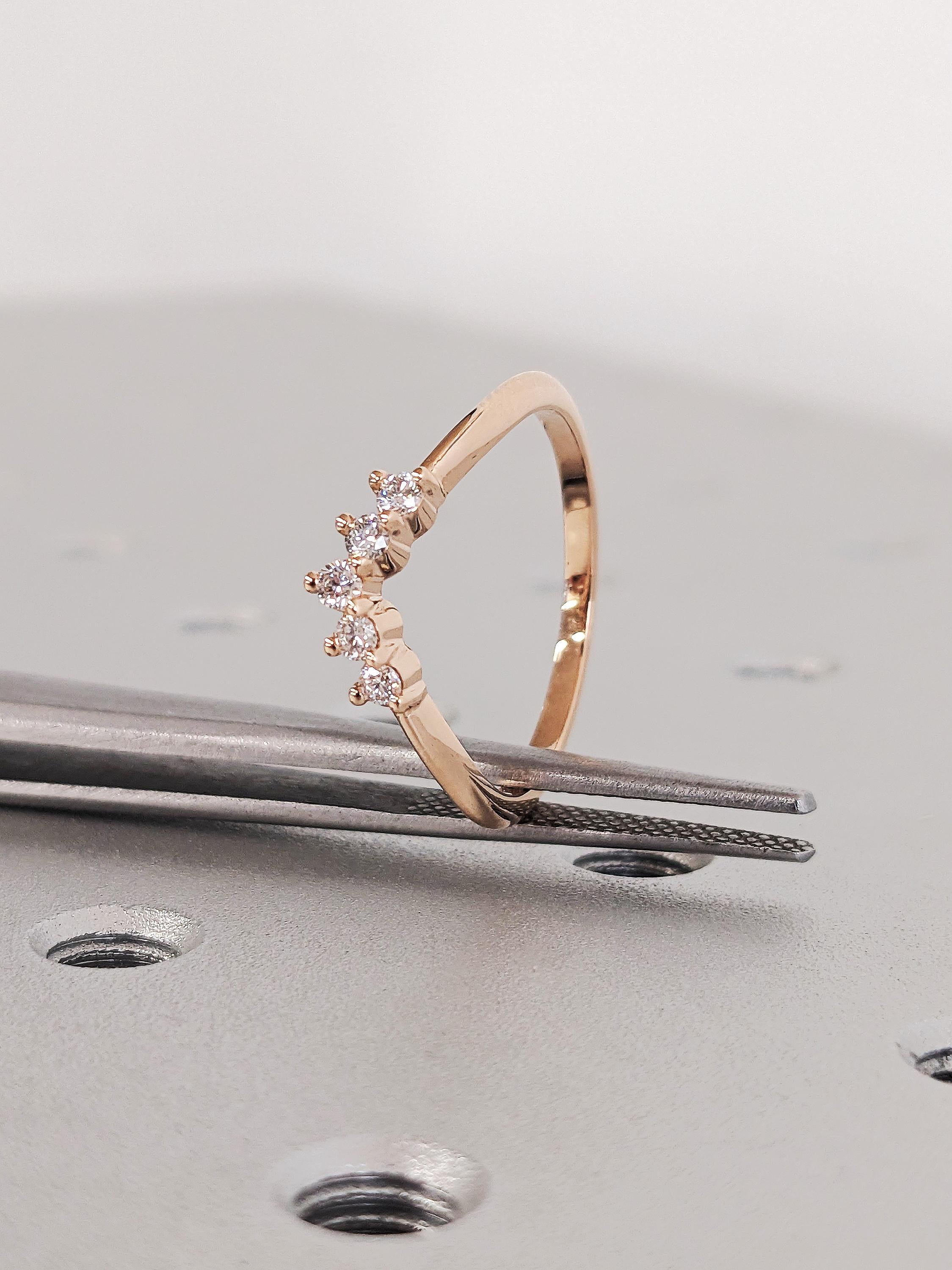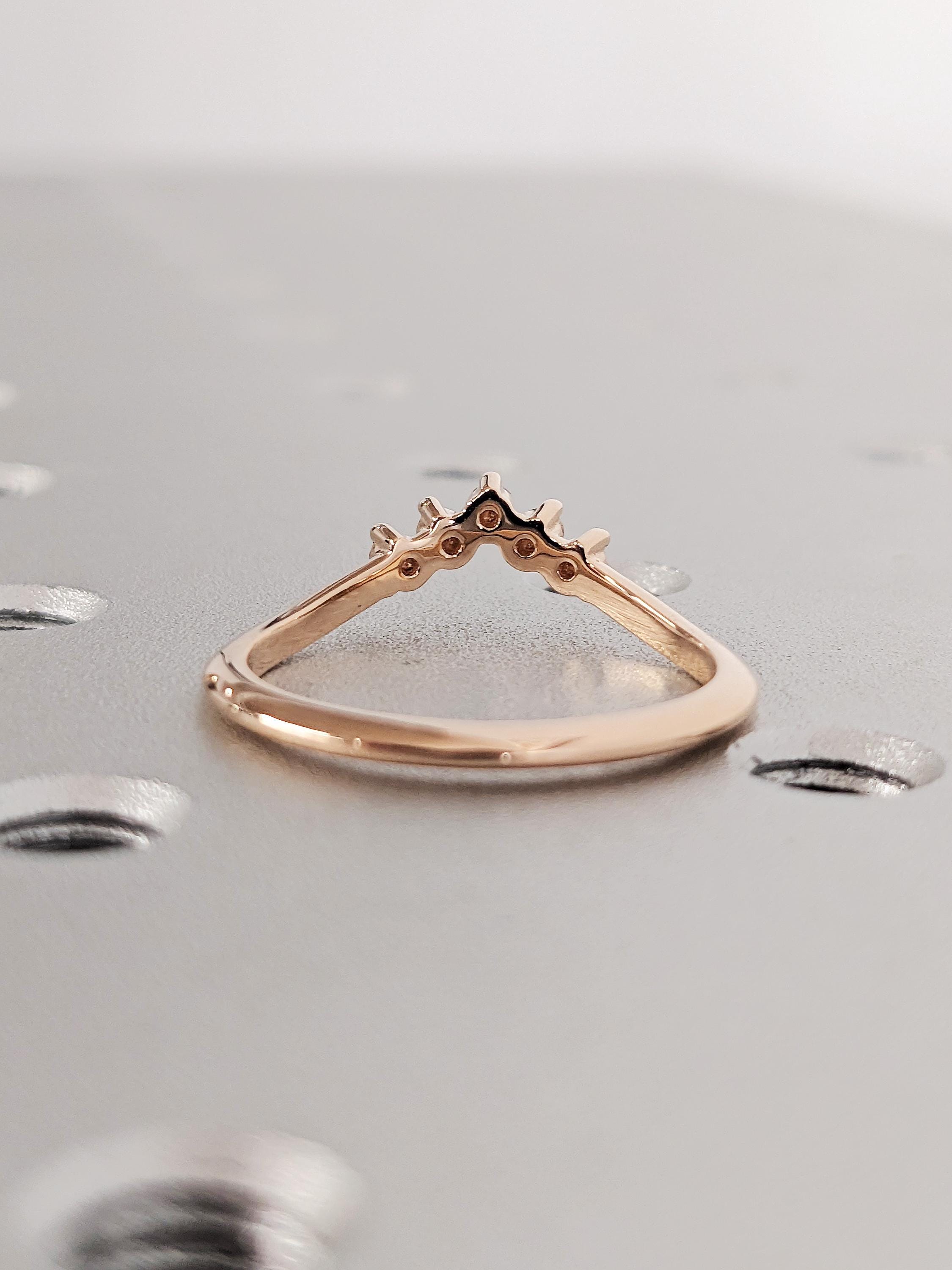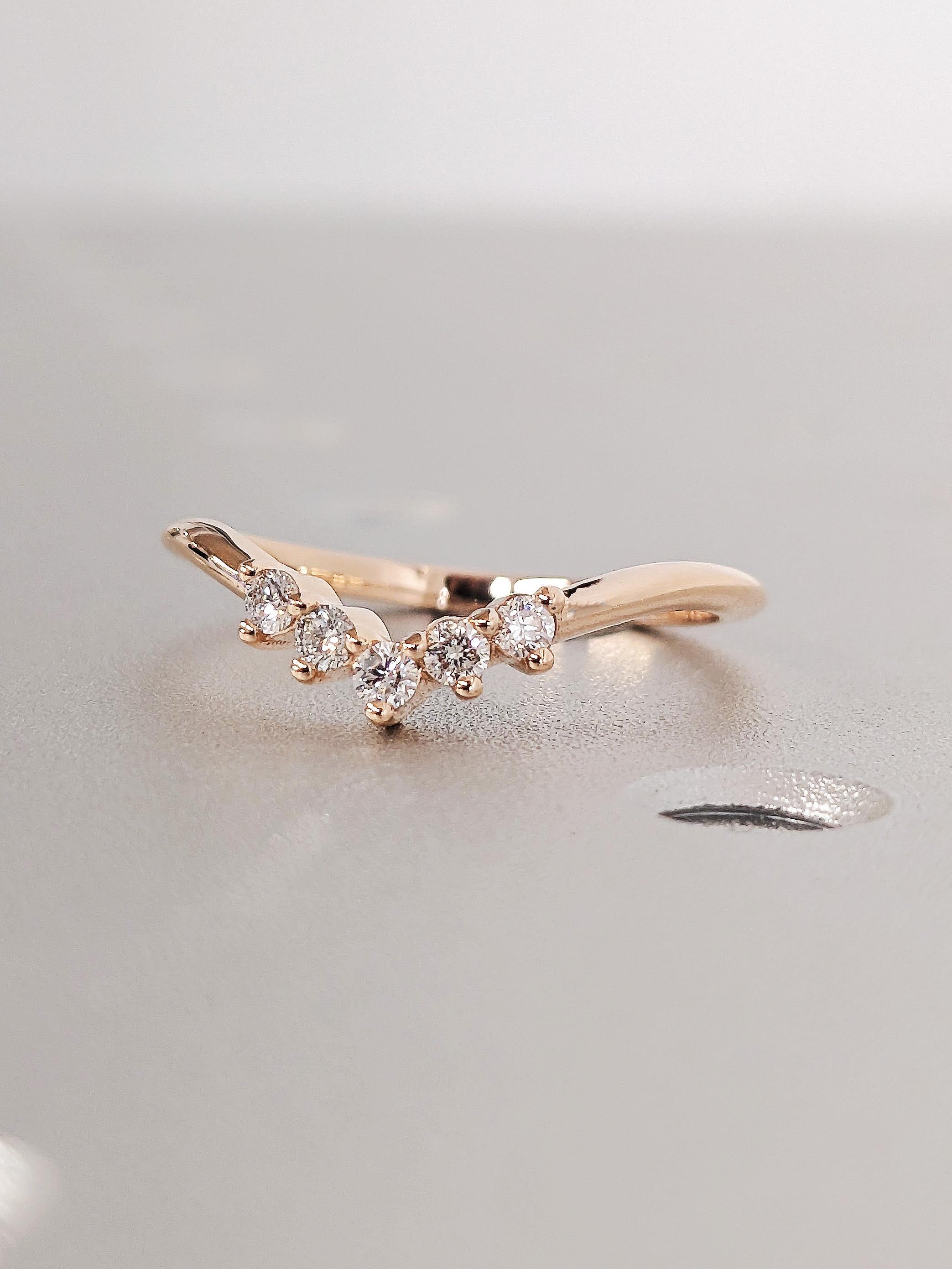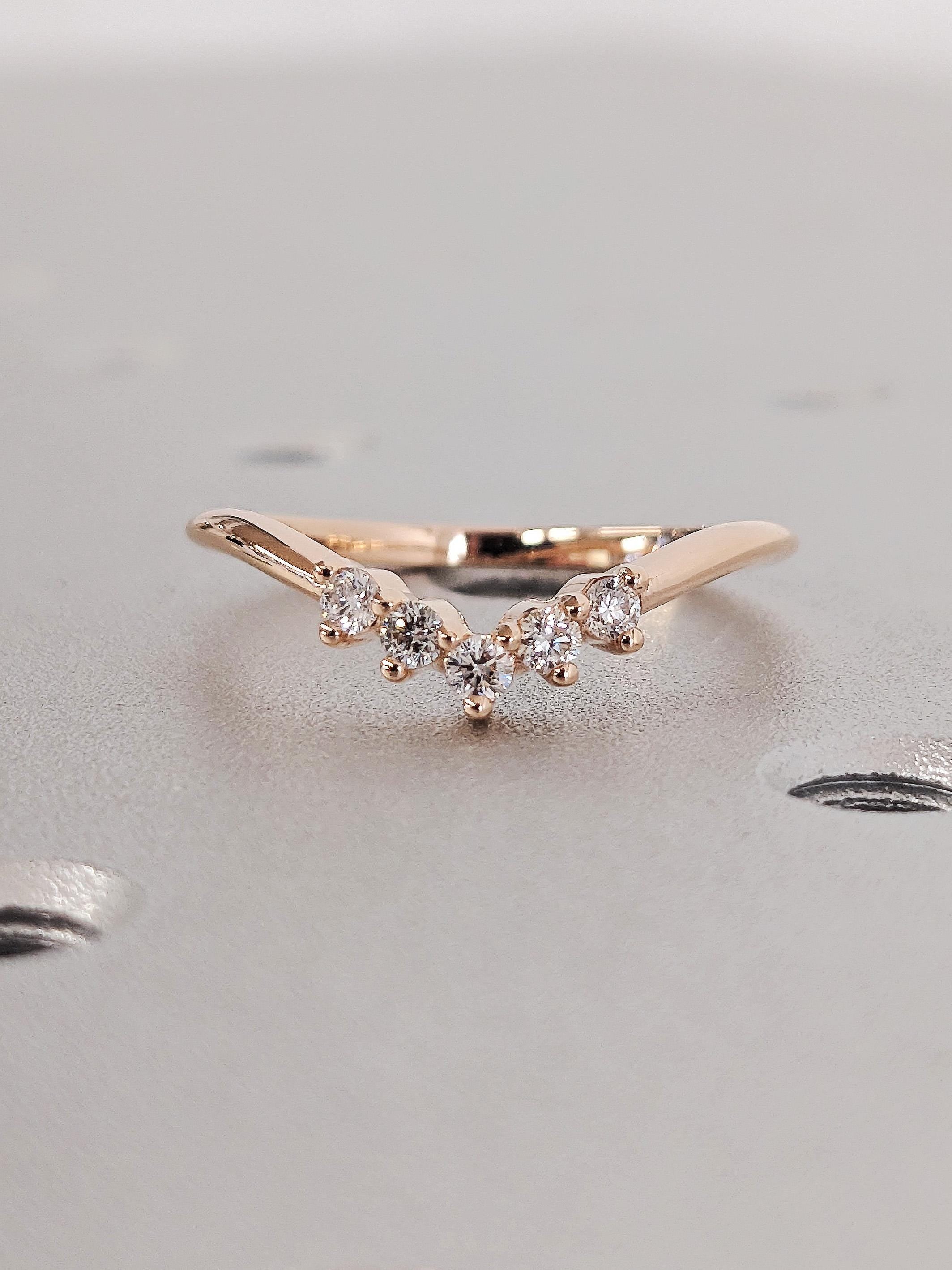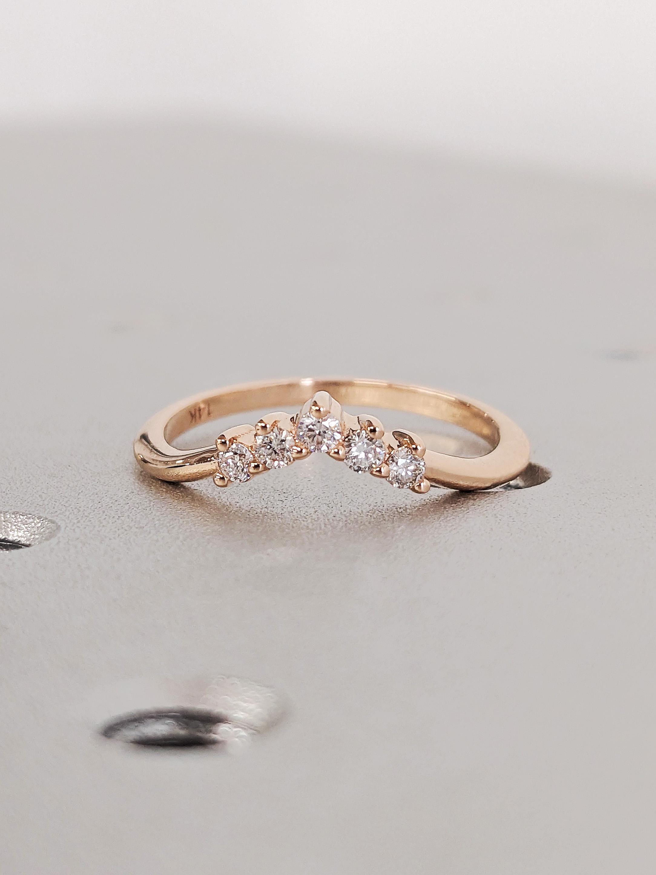 This chevron matching engagement ring features a graceful V shaped design adorned with round diamonds that add a subtle sparkle. Available in Natural Diamond, Lab Diamond and Moissanite options, this dainty ring pairs beautifully with engagement rings or shines on its own as a timeless stacking piece.