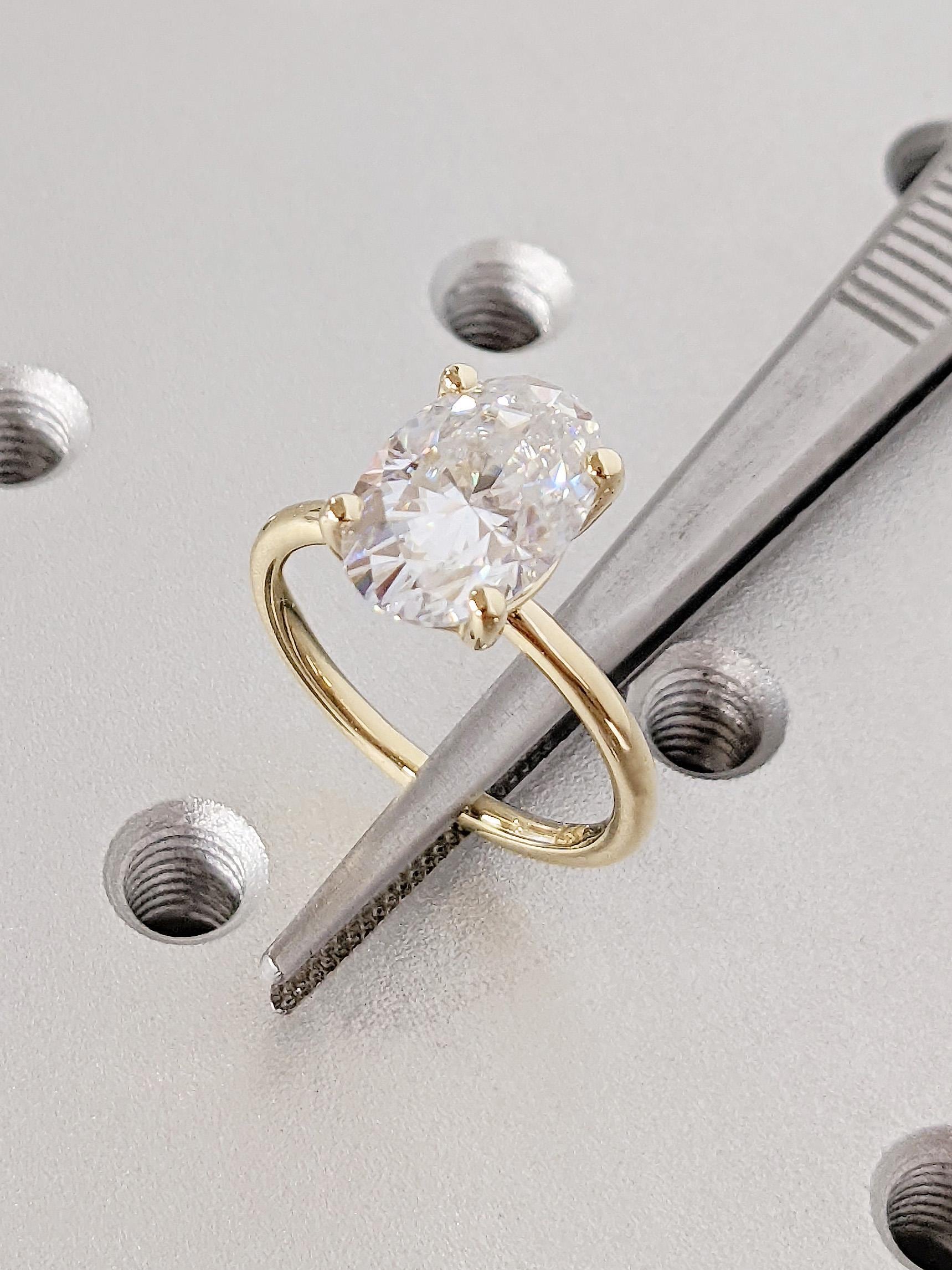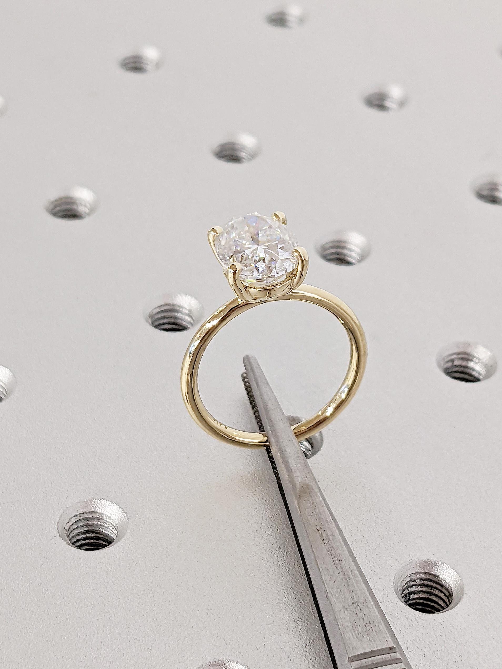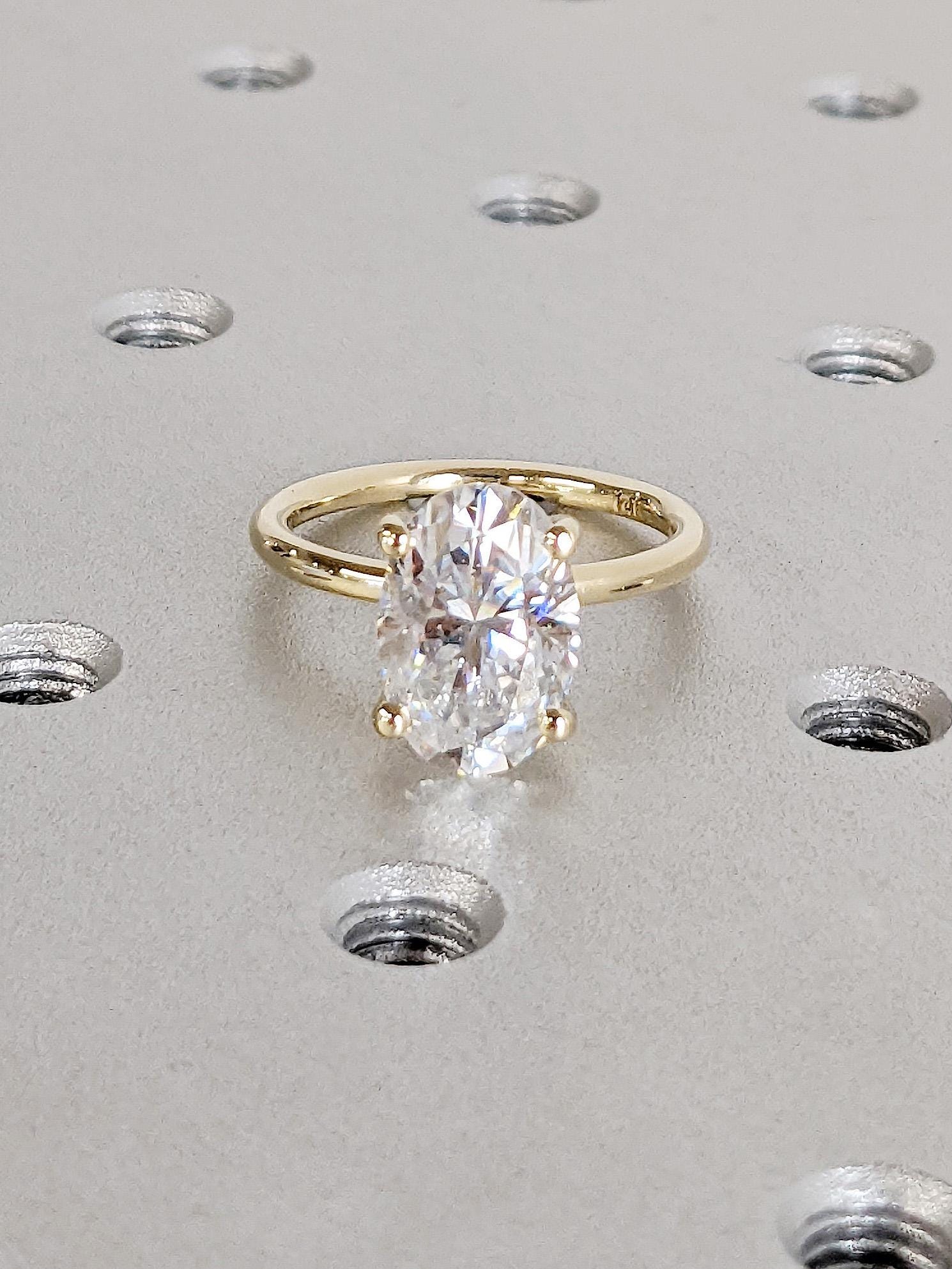 This classic solitaire ring features an oval cut lab grown diamond set in yellow gold. Designed with a slim, petite band, it offers a simple and timeless look that puts the focus on the center stone. Perfect as an engagement ring, a promise ring, or a meaningful gift, this piece brings together elegance and everyday wearability in a clean, understated way.