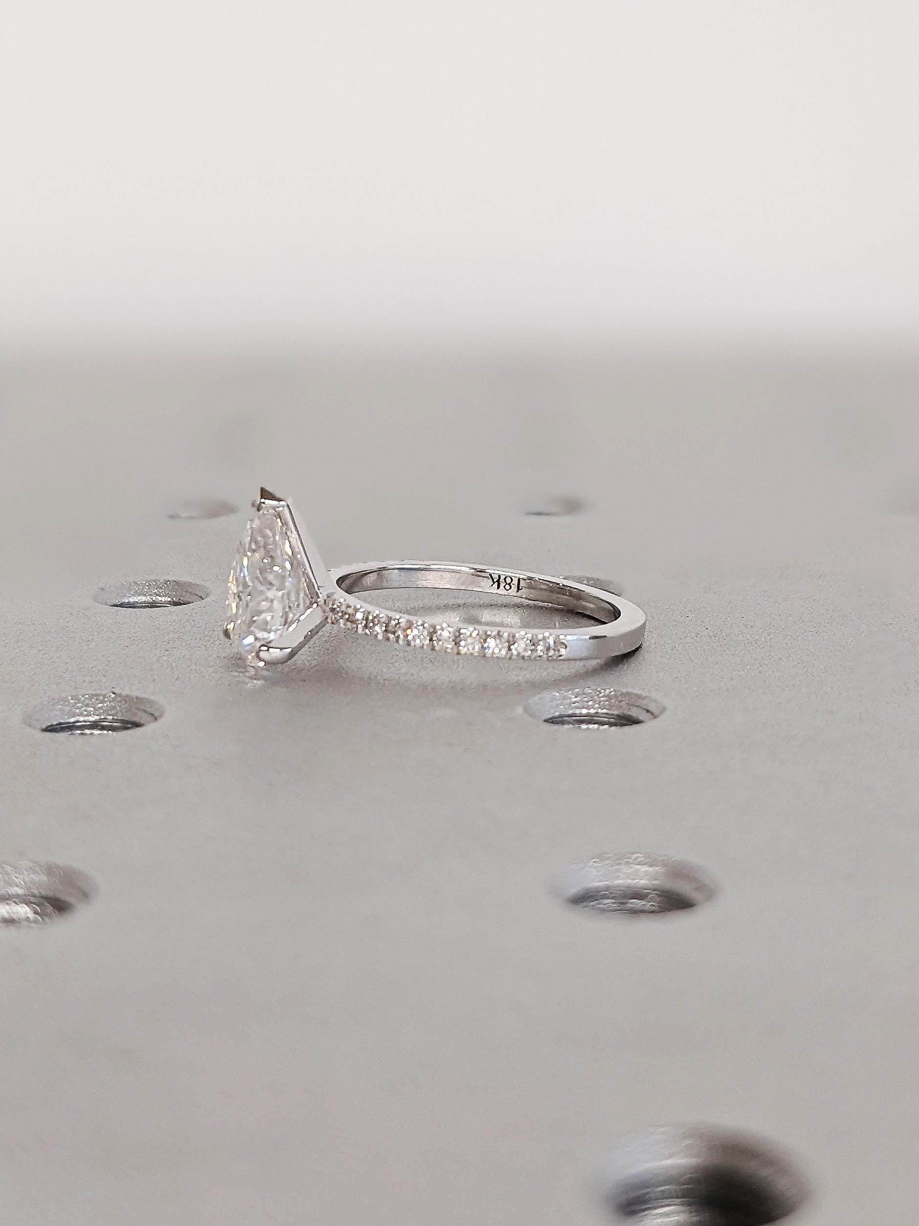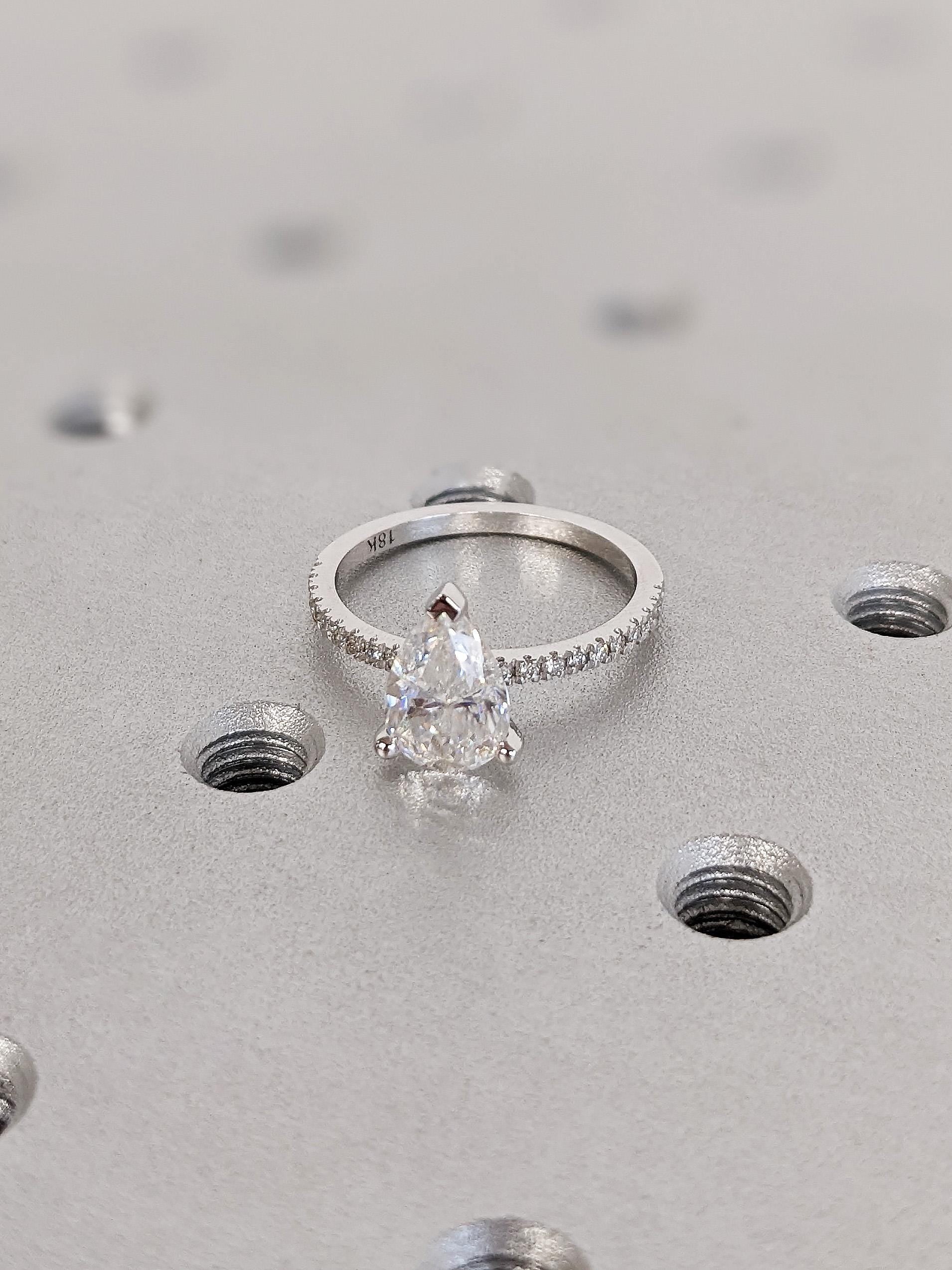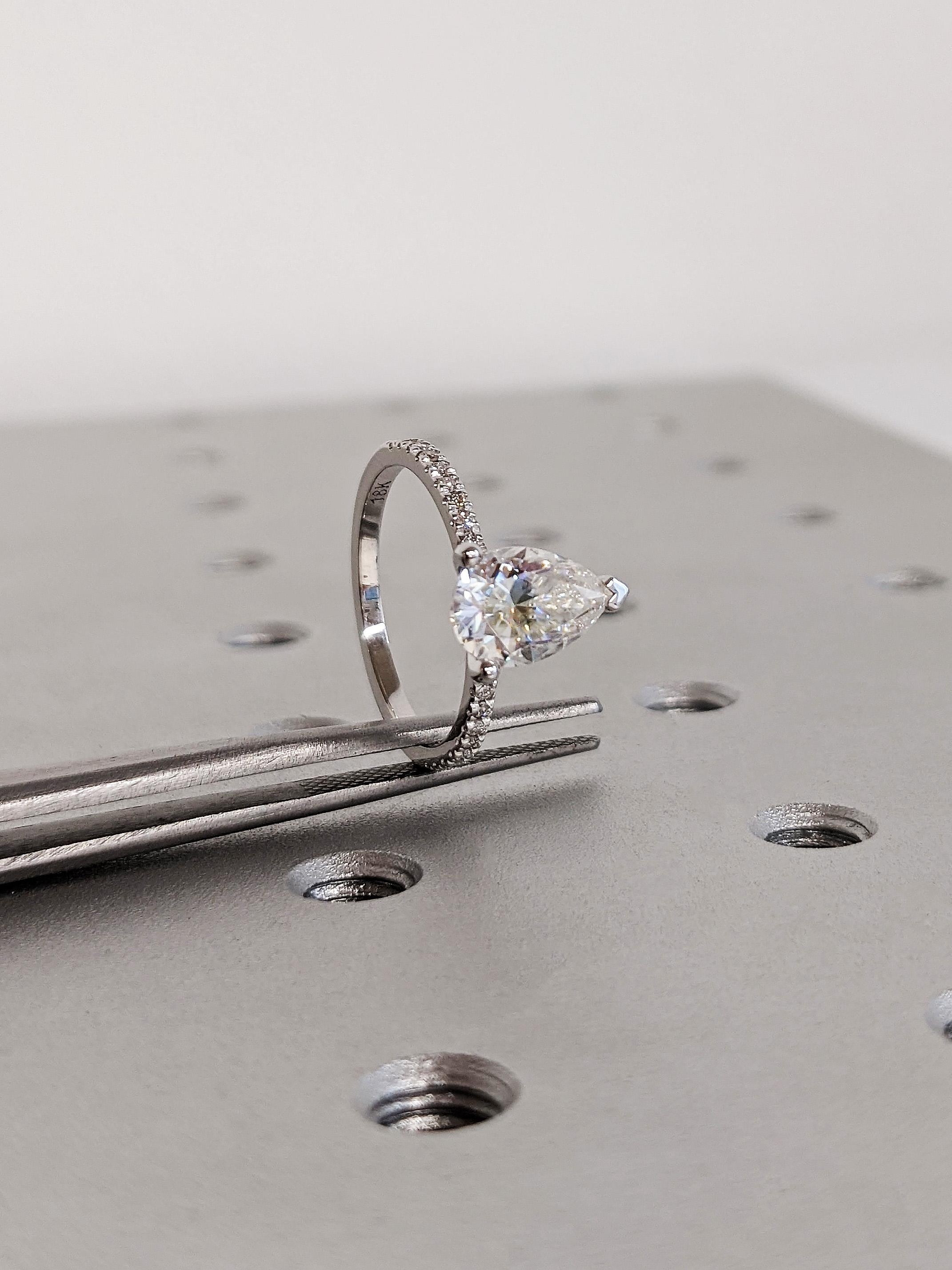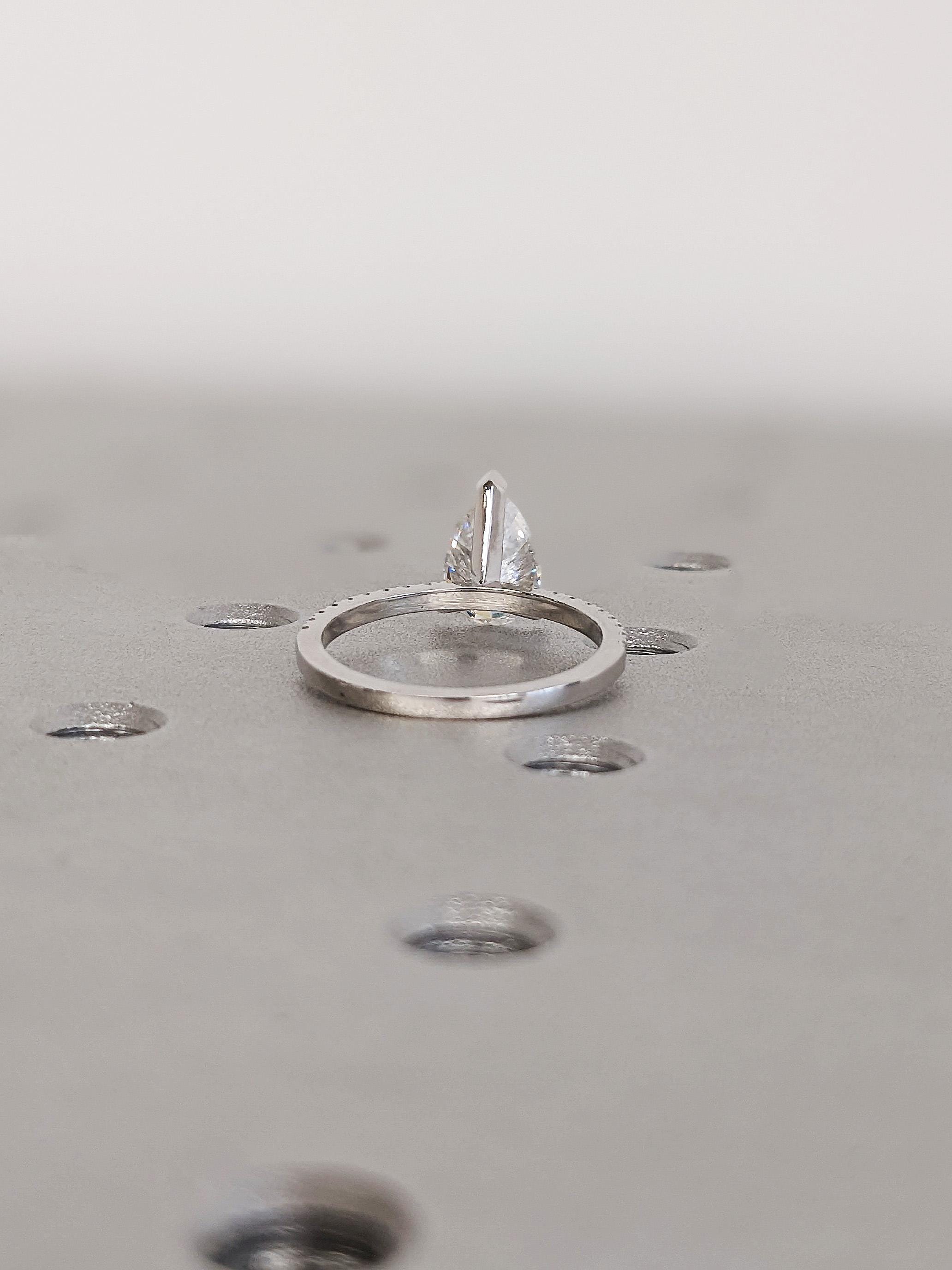 Celebrate everlasting love with this stunning pear cut Moissanite engagement ring, beautifully crafted for timeless elegance. The center showcases a brilliant pear cut Moissanite, expertly faceted to radiate fire and sparkle. Its sleek silhouette is complemented by a delicate pavé band, customizable with either Natural Diamond, Lab Diamond or Moissanite. Designed for comfort and durability, perfect as an engagement ring, wedding keepsake or anniversary gift.