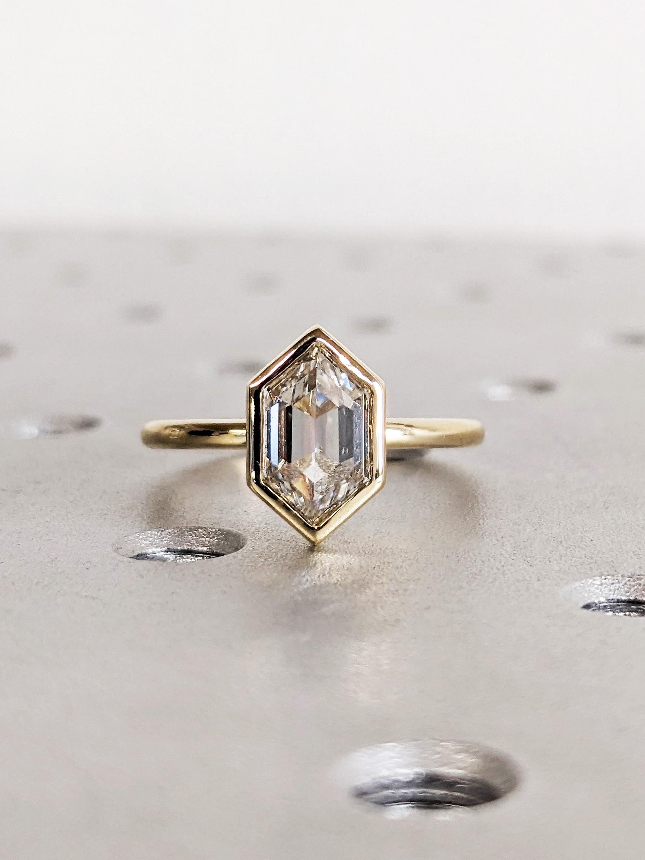 Classic Solitaire Lab Diamond Wedding Ring, 14K Yellow Gold Hexagon Cut Diamond Bezel Setting Band, Women Gold Engagement Ring, Promise Ring