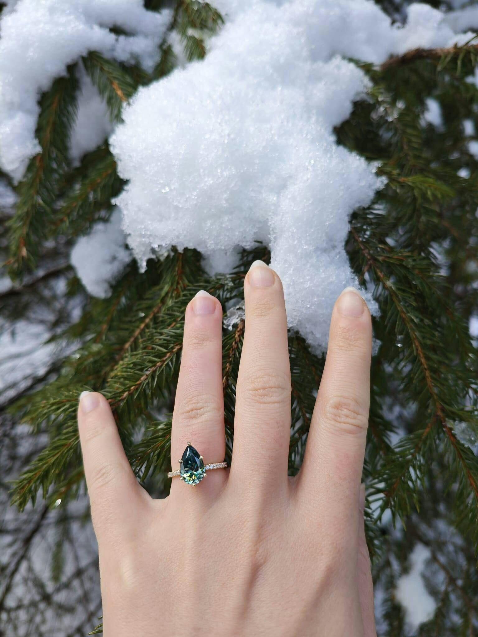 Colored Moissanite Engagement, Green Moissanite Ring, Vintage blue-green pear engagement ring, Green Color Moissanite hidden halo ring.