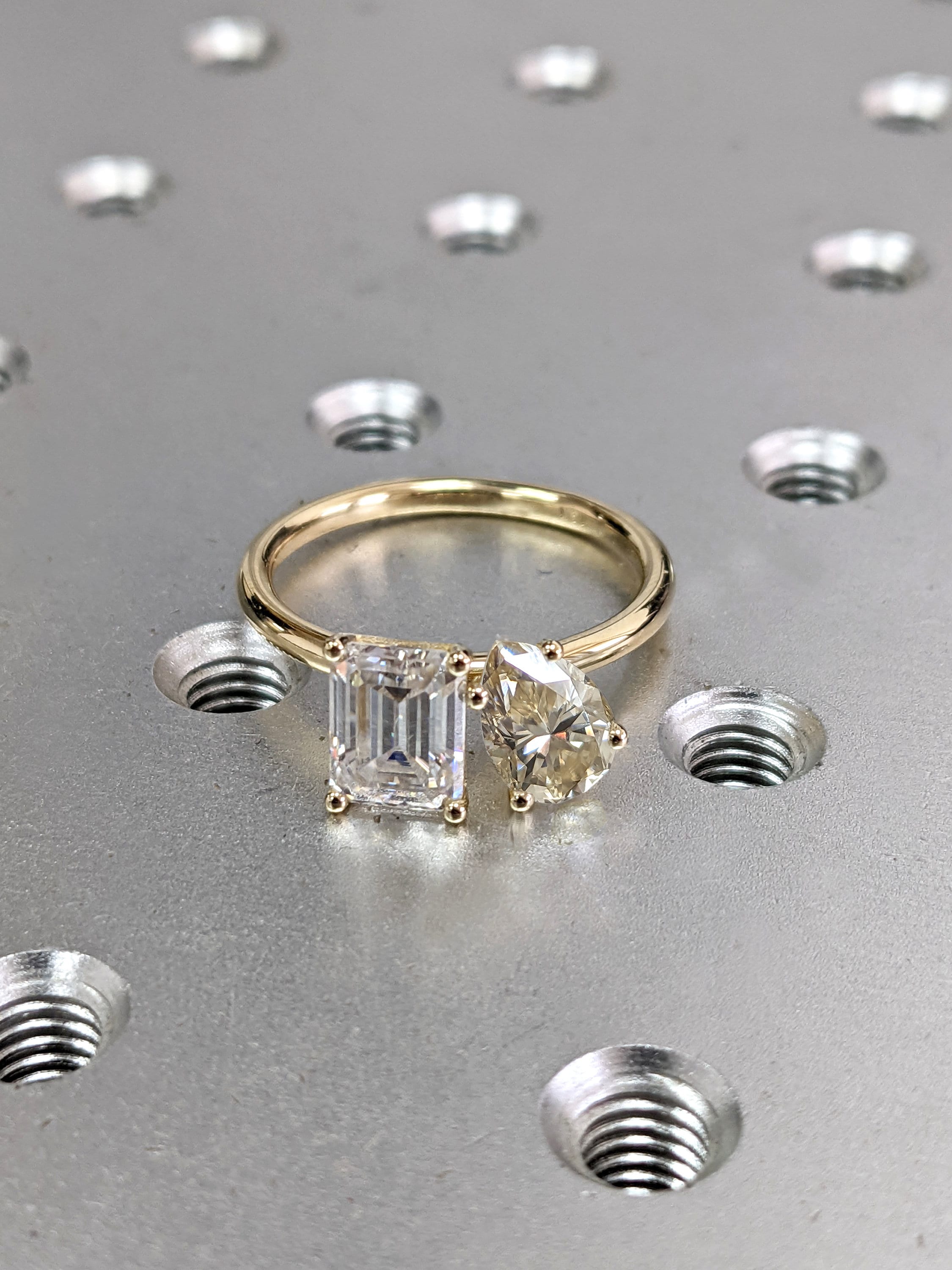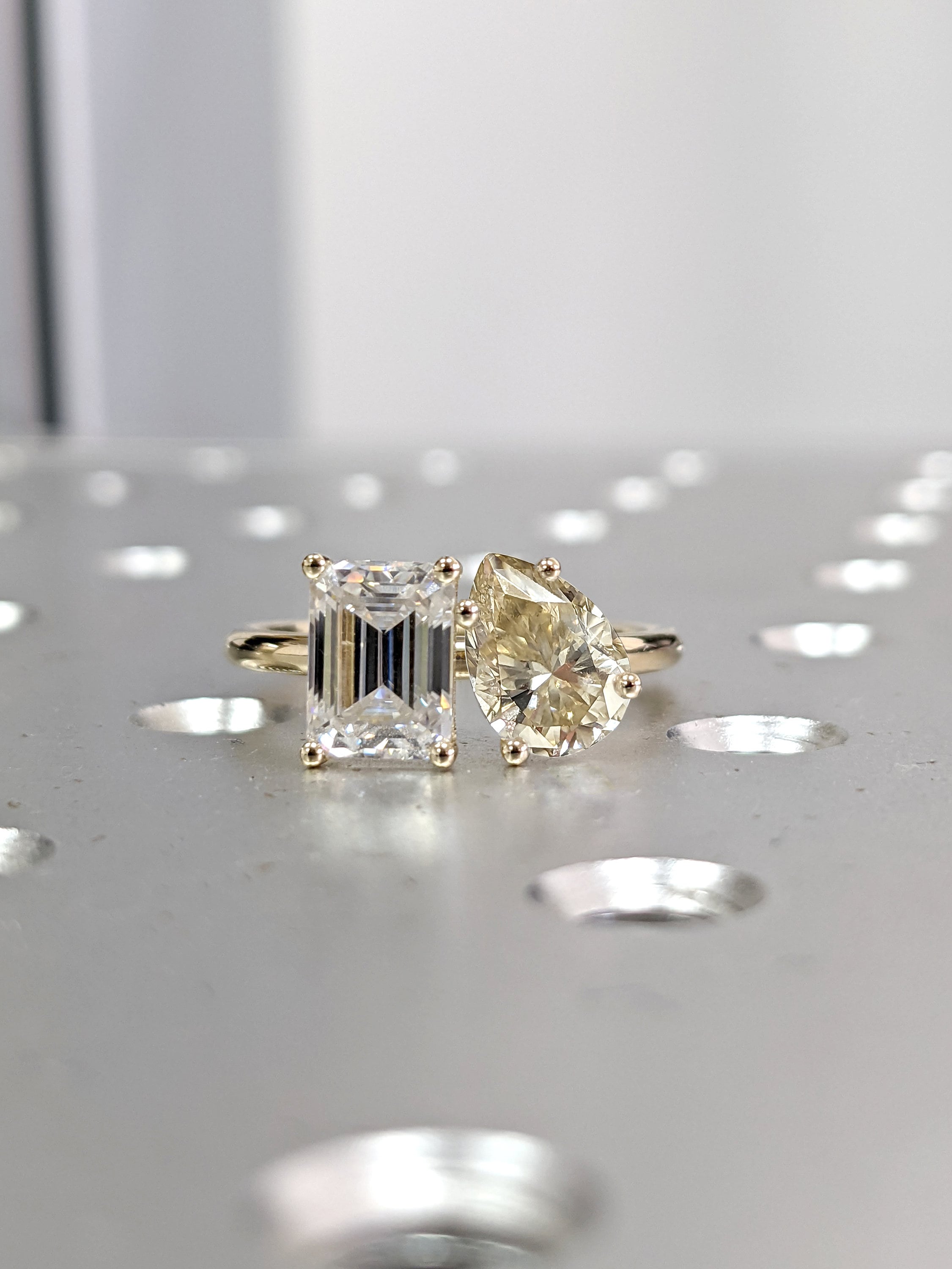 Colorless & Champagne Moissanite Toi Et Moi Ring / Emerald And Fancy Colored Pear Moissanite Ring / 14K Gold Engagement Ring / Gift For Her