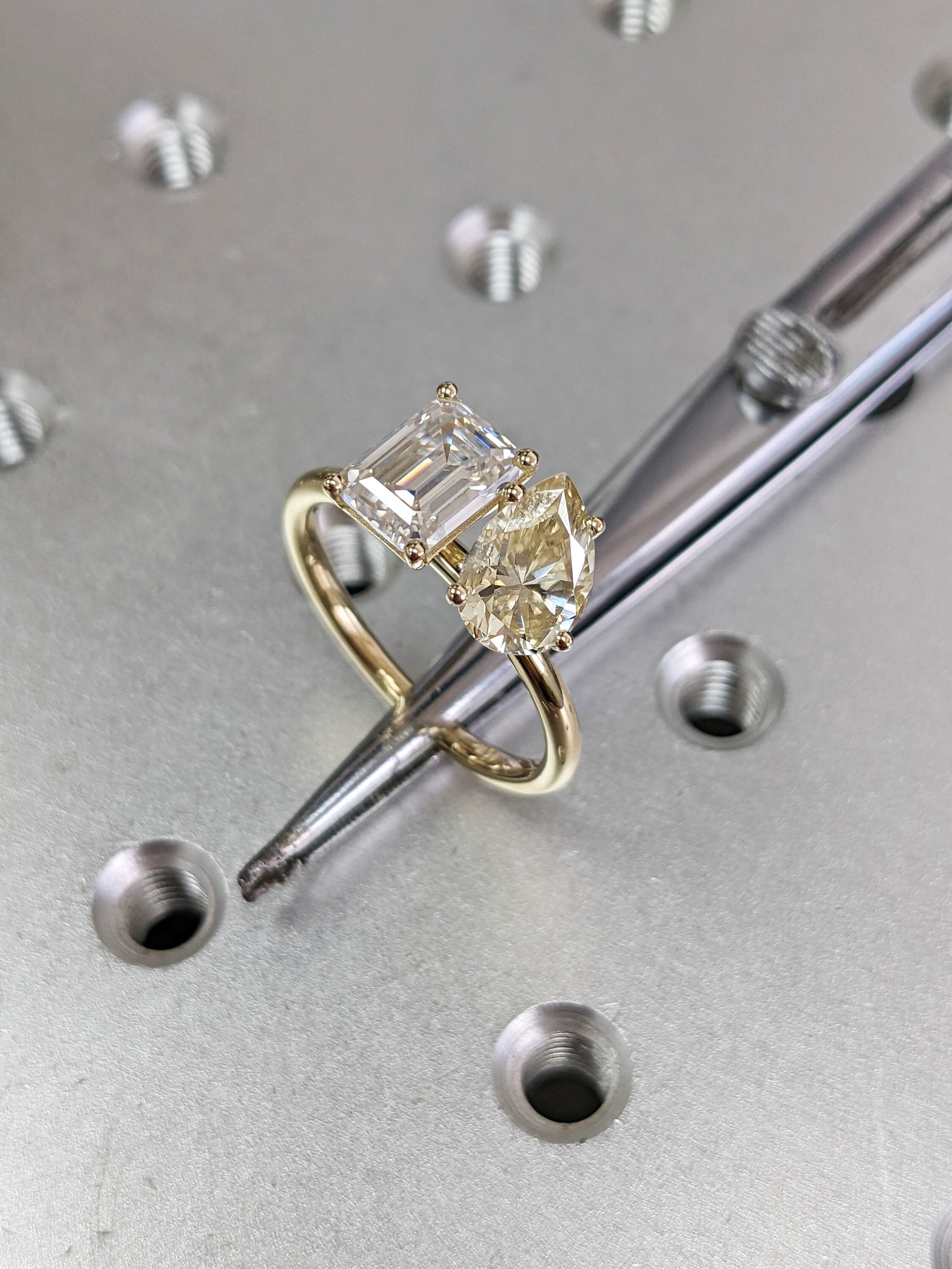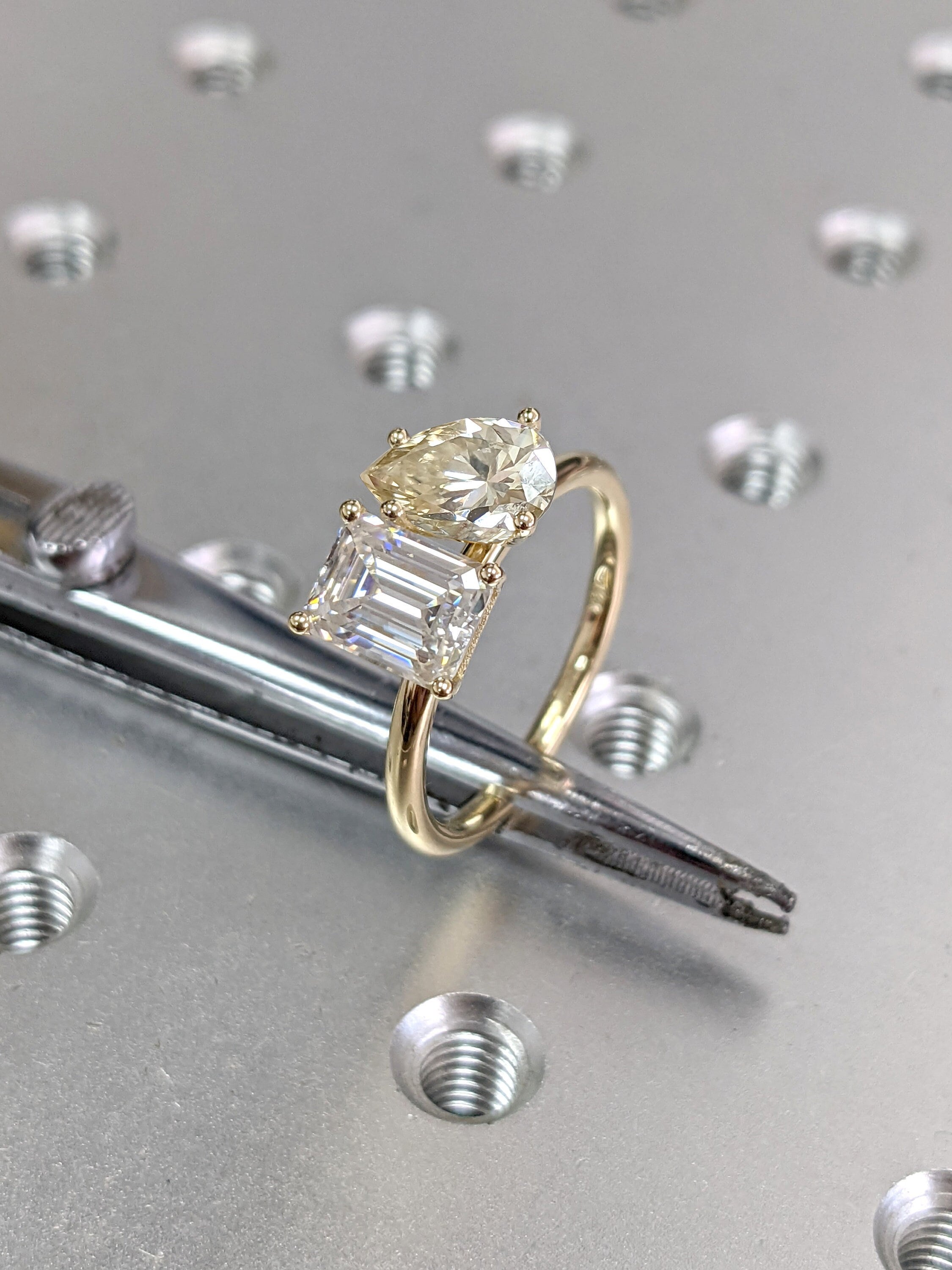 A beautiful dual emerald and pear shaped moissanites, set with a super delicate and thin setting the unique and delicate