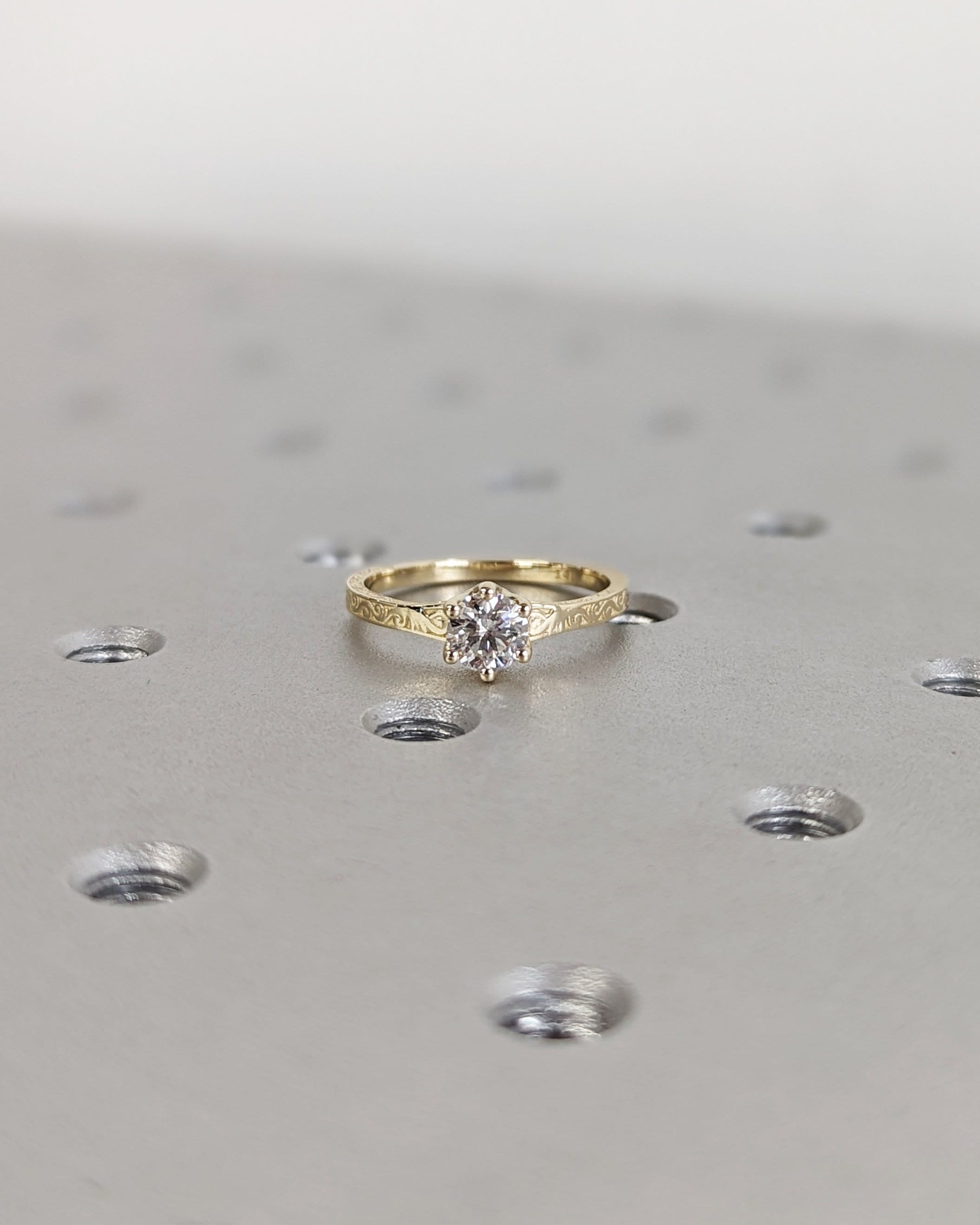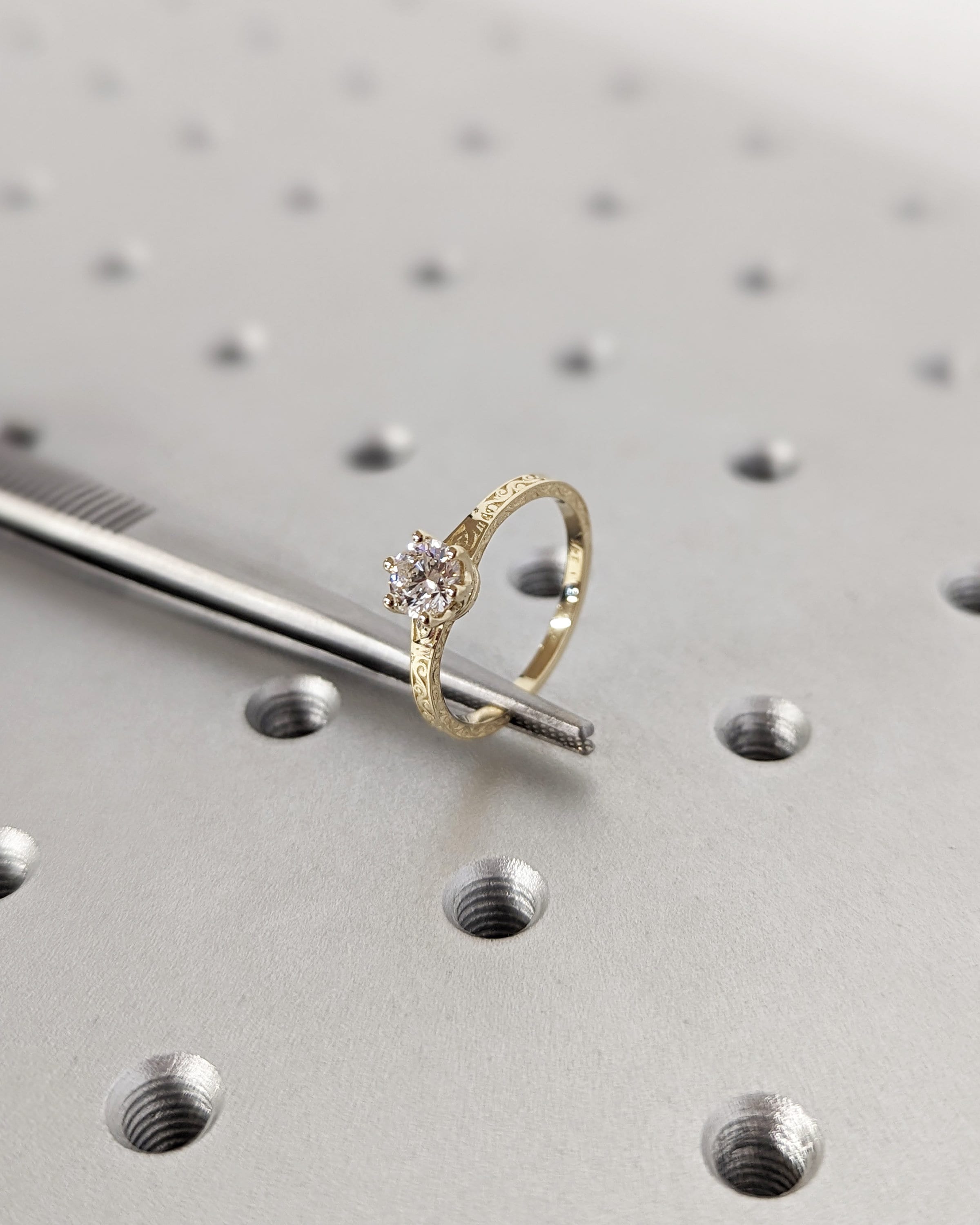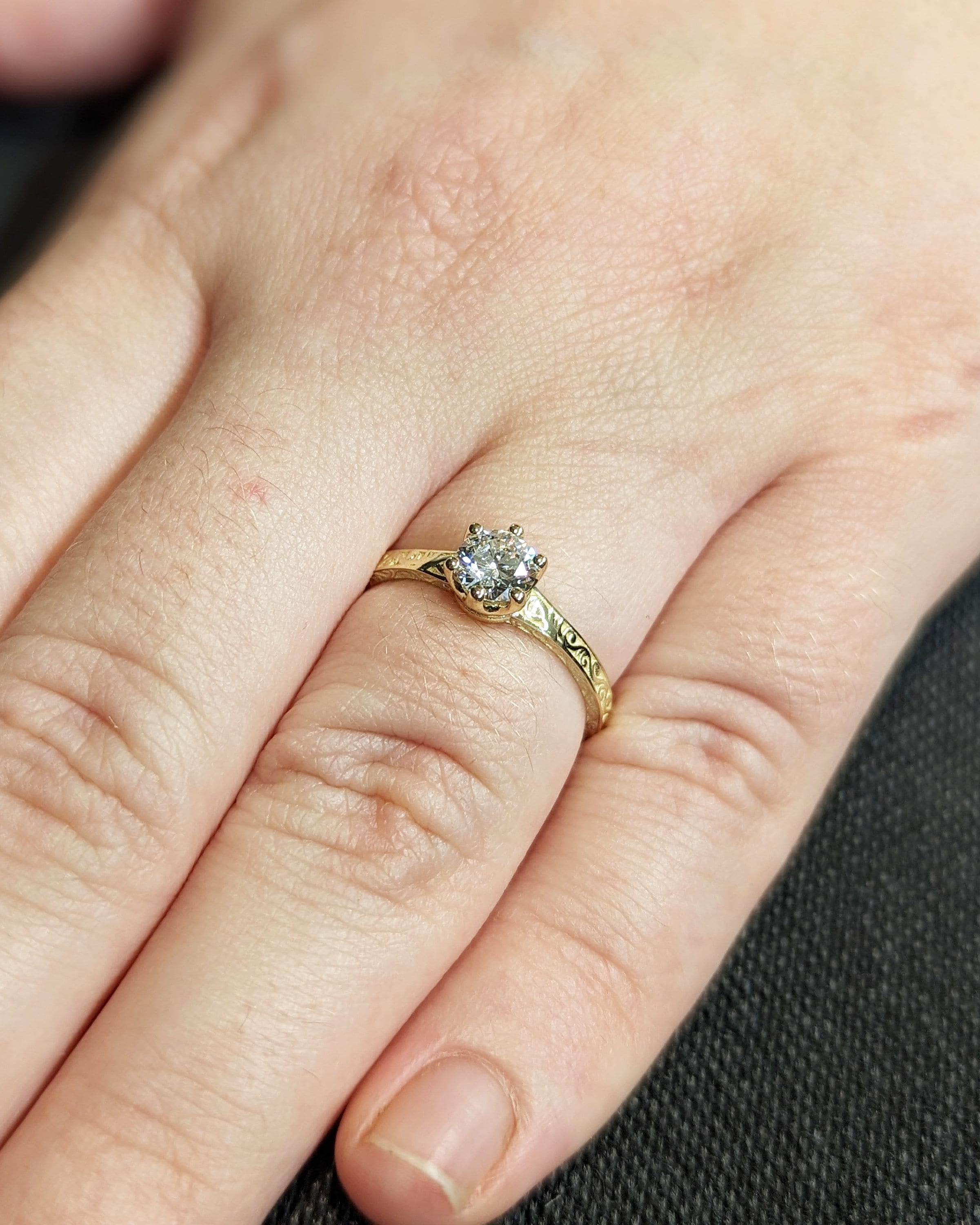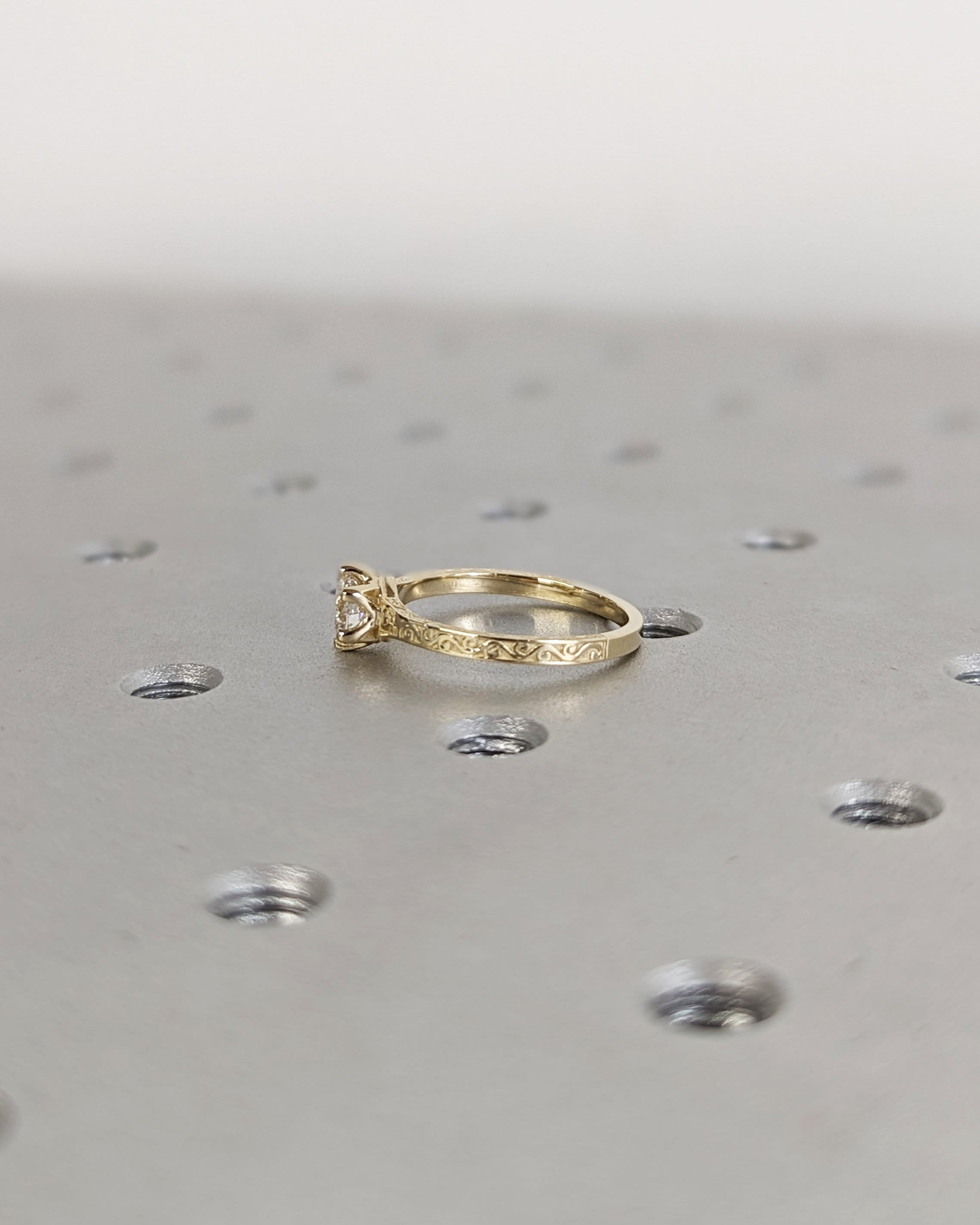 Unveil the timeless allure of your commitment with our antique-inspired moissanite engagement ring. Its intricate design showcases a basket setting delicately placed on a square-shaped band, adorned with undulating wave filigree for a touch of vintage elegance.