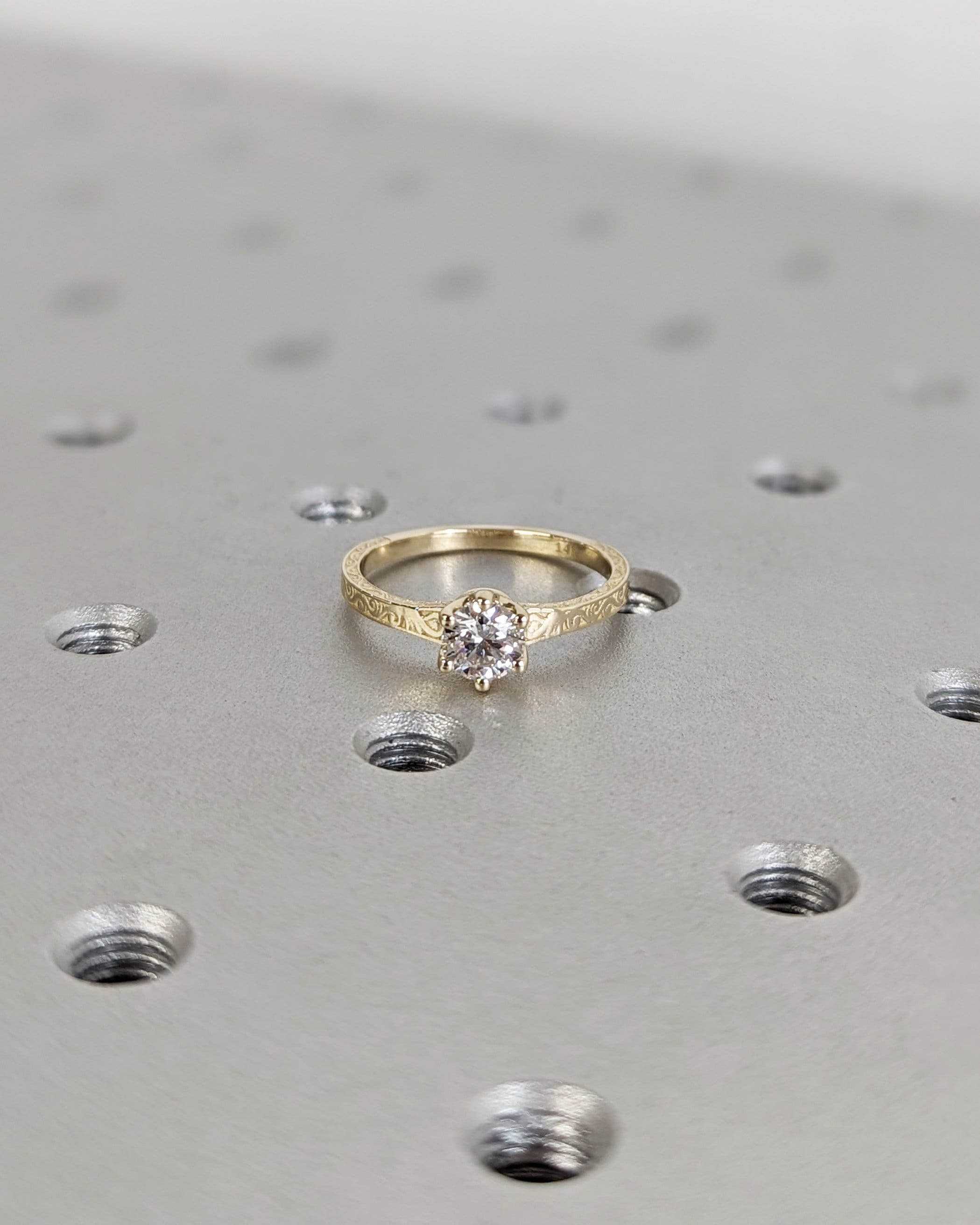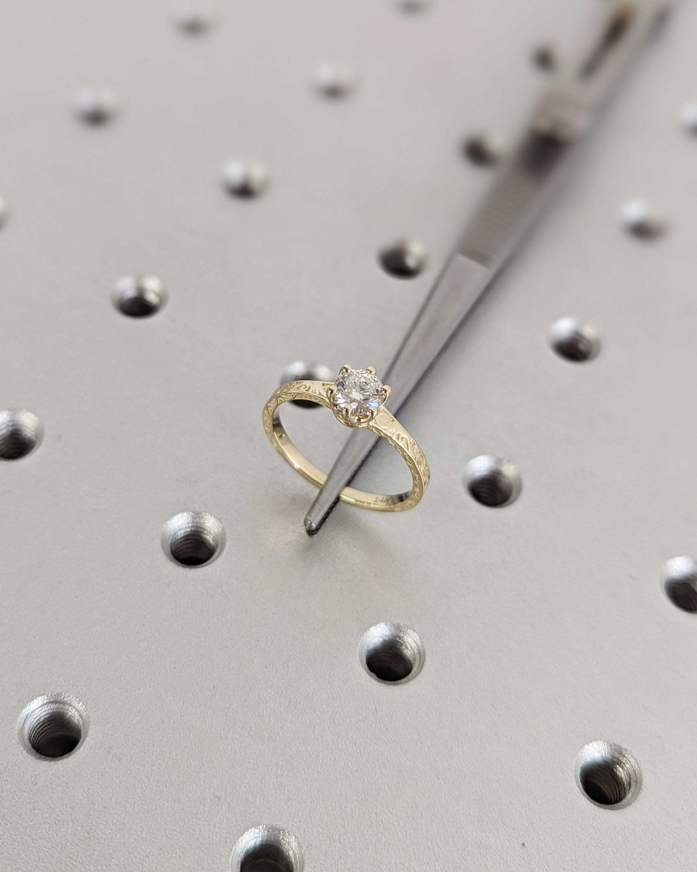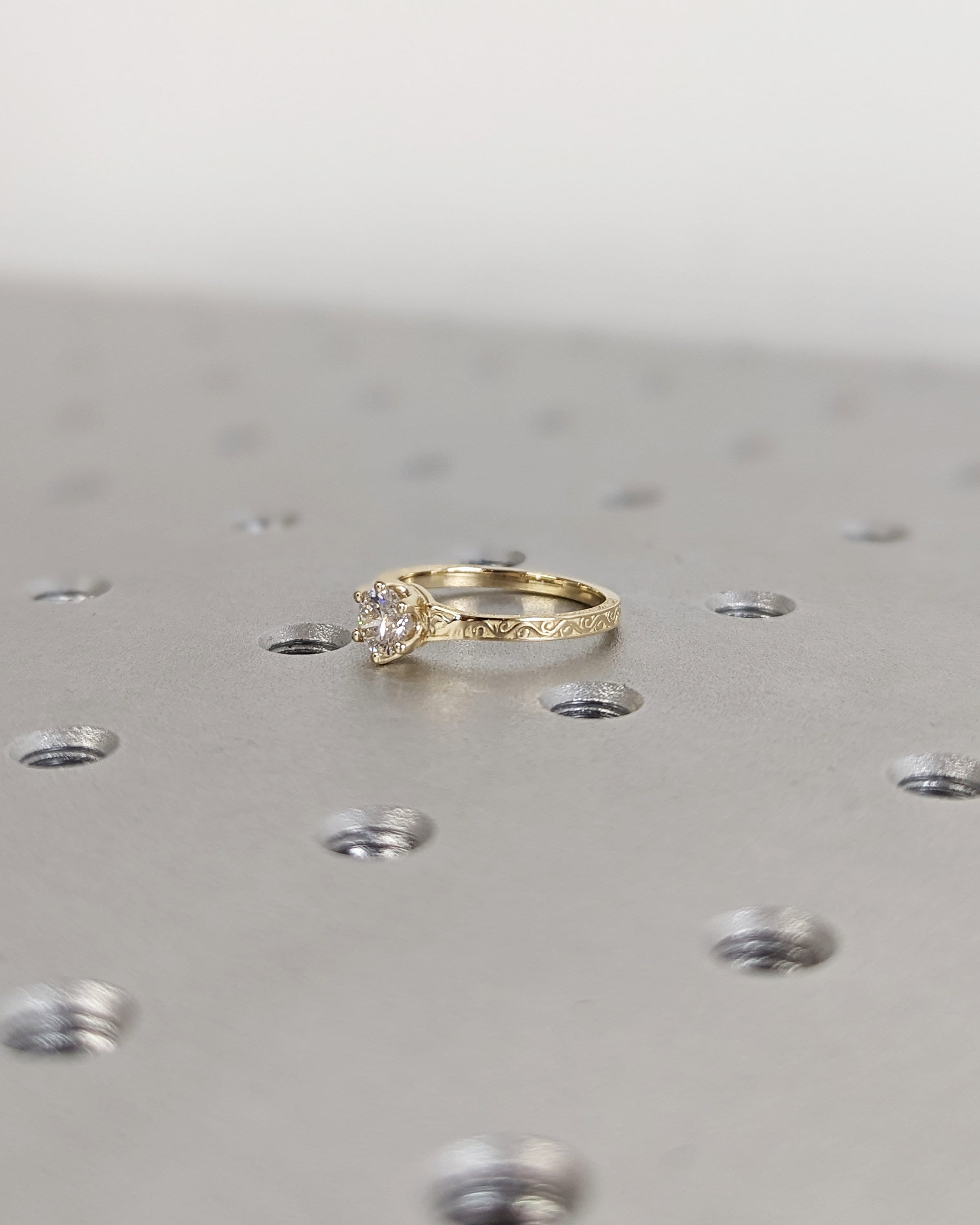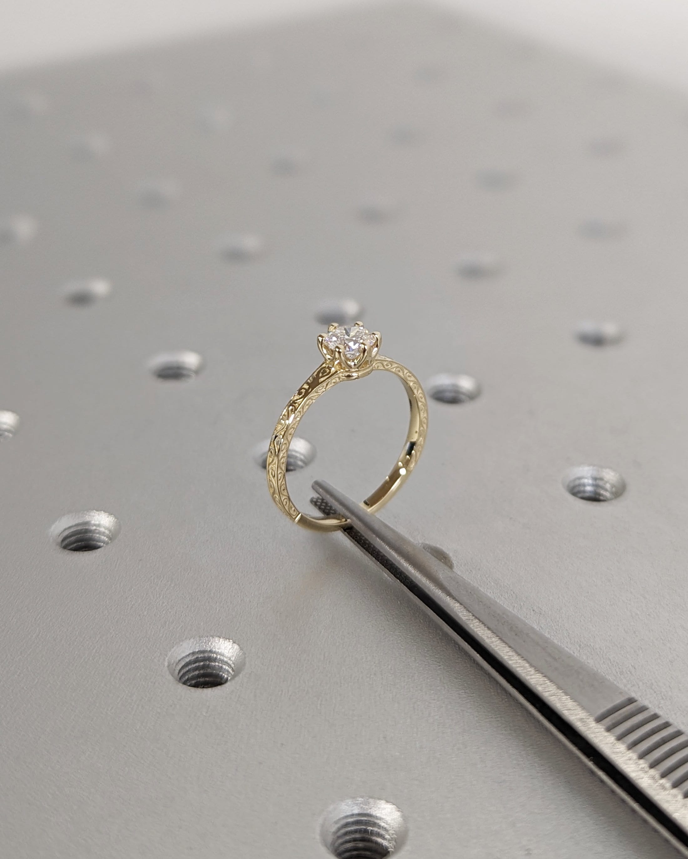 Unveil the timeless allure of your commitment with our antique-inspired moissanite engagement ring. Its intricate design showcases a basket setting delicately placed on a square-shaped band, adorned with undulating wave filigree for a touch of vintage elegance.