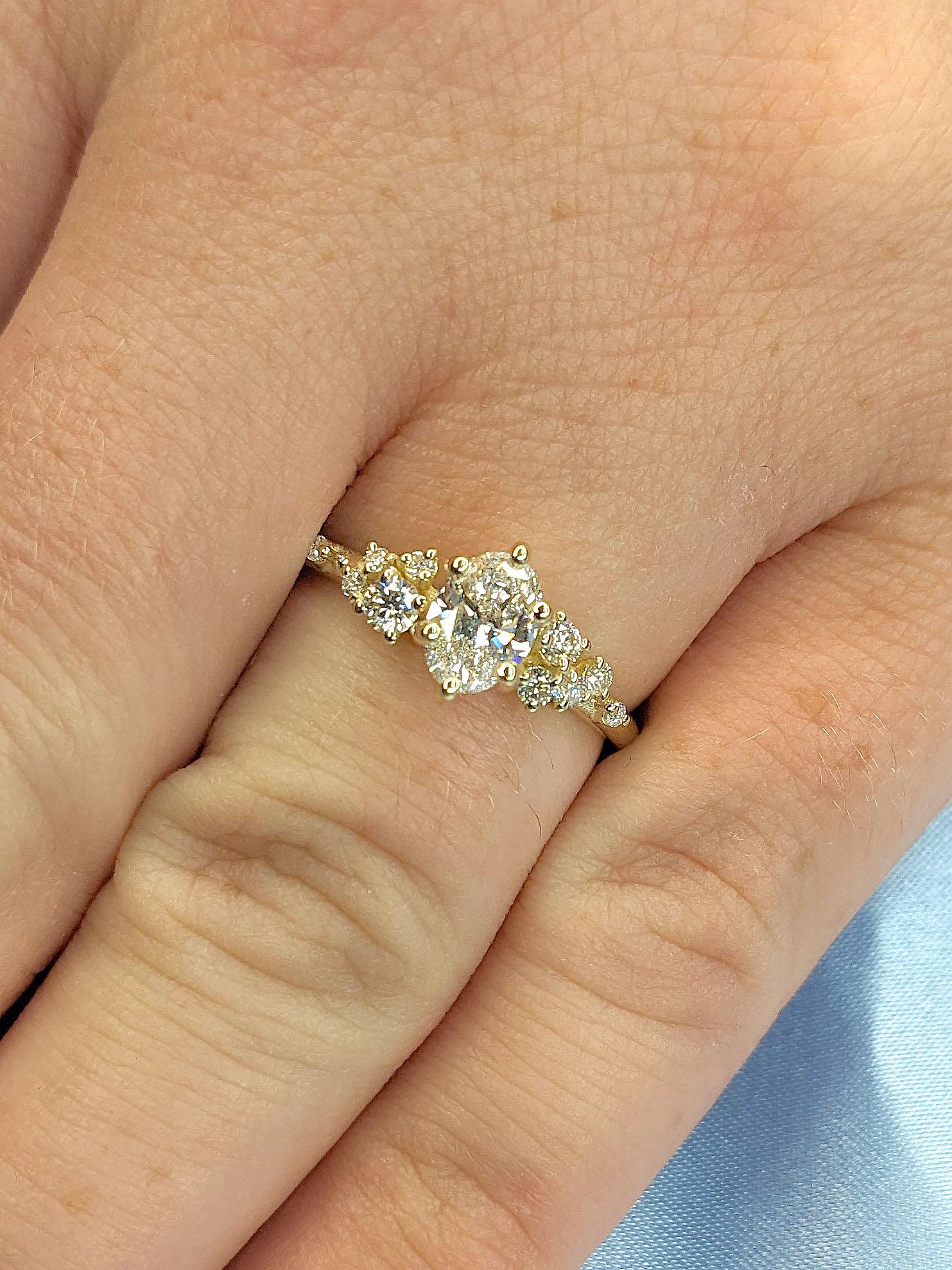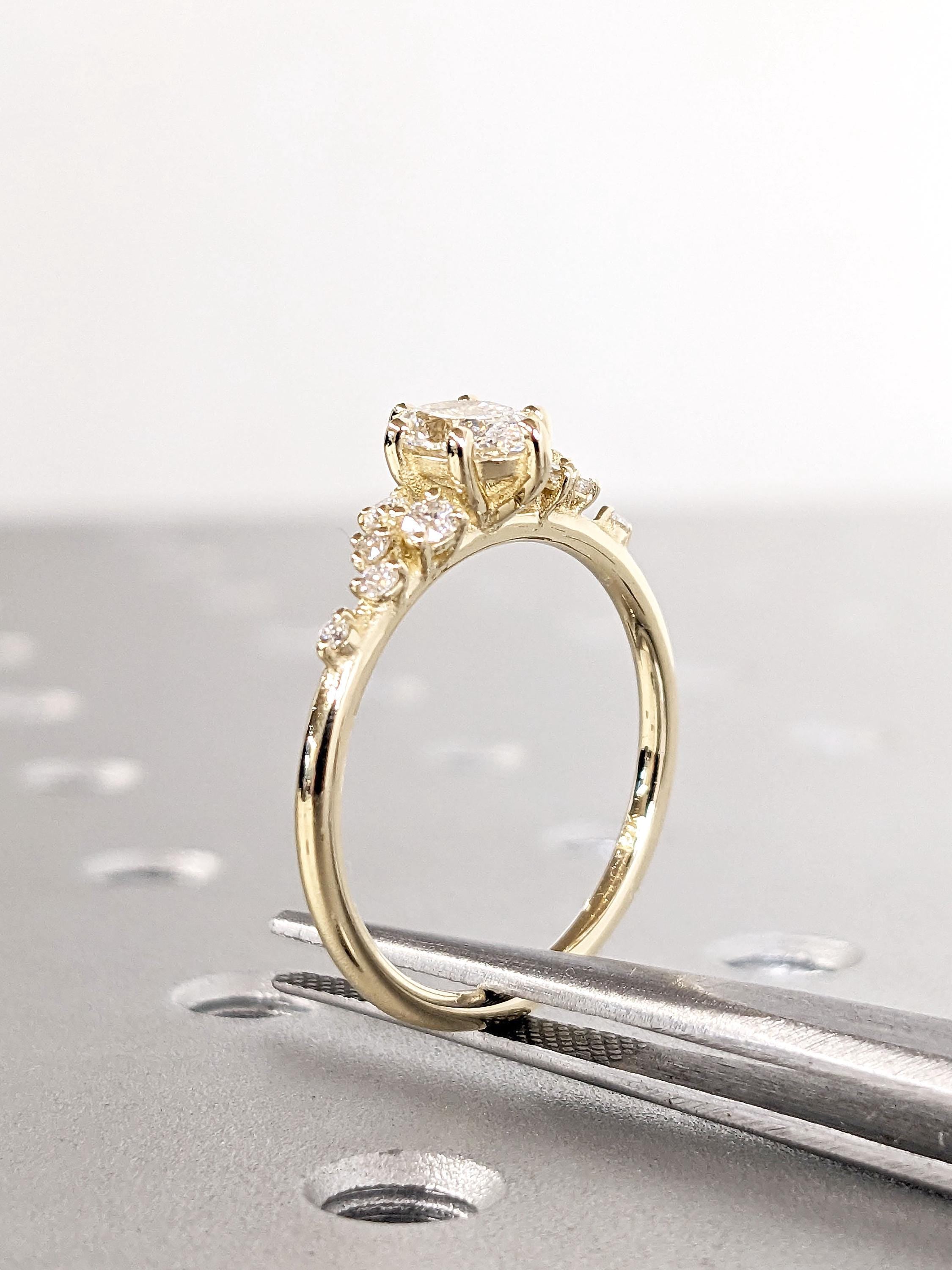 Mark the beginning of your new journey with our stunning engagement ring, featuring a classic center stone set and a delicate setting. Embellished with a brilliant Snowdrift Cluster of Natural Diamonds, Lab Diamonds or Moissanites that shimmer like winter's first snow, this carefully handcrafted ring captures the essence of enduring love and commitment.