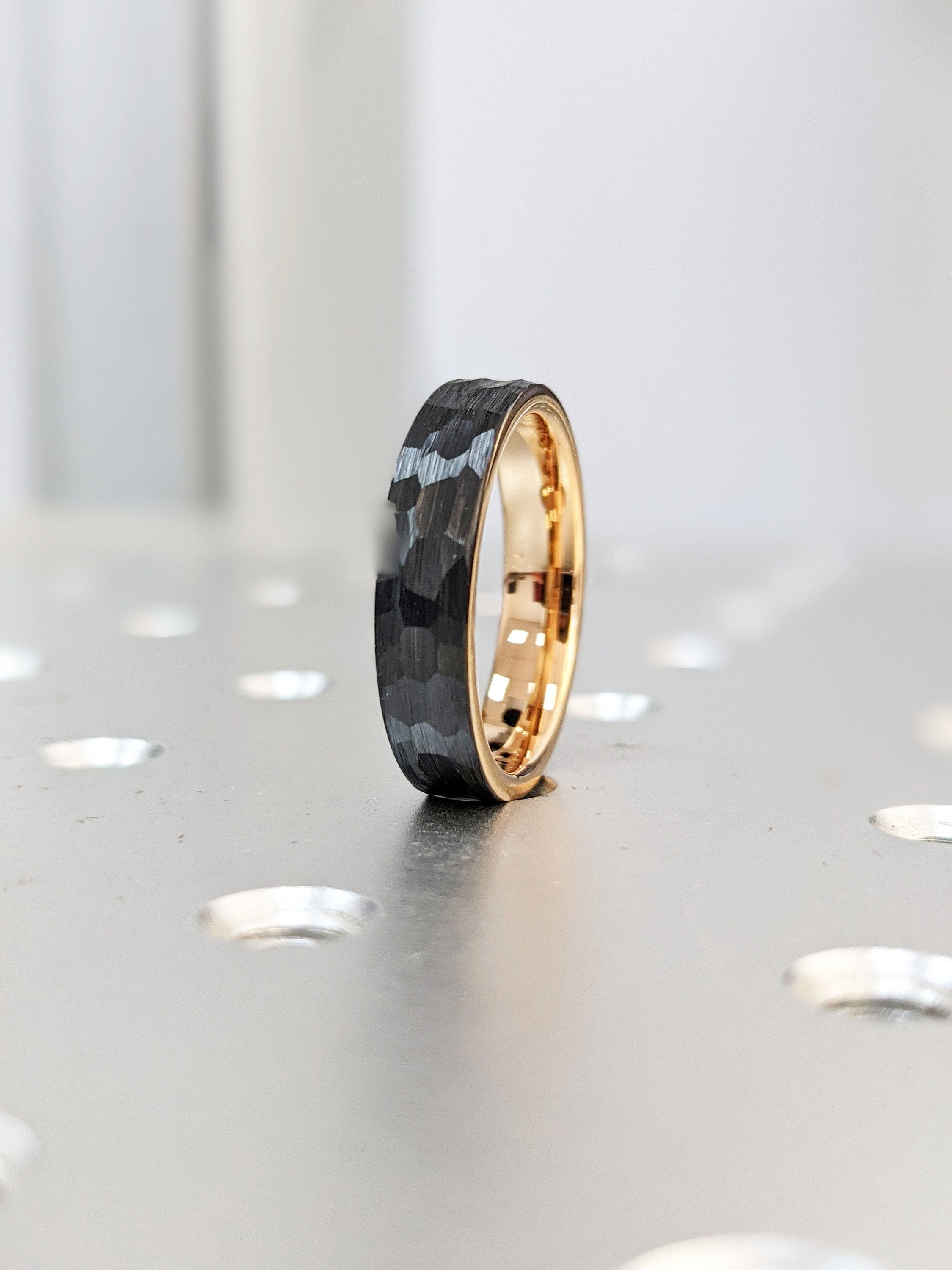 Comfort Fit Black Wedding Ring for Him or Her: 5MM Wide, Brushed Hammered Black Rhodium Plated Tungsten, Rose Gold Inner Band
