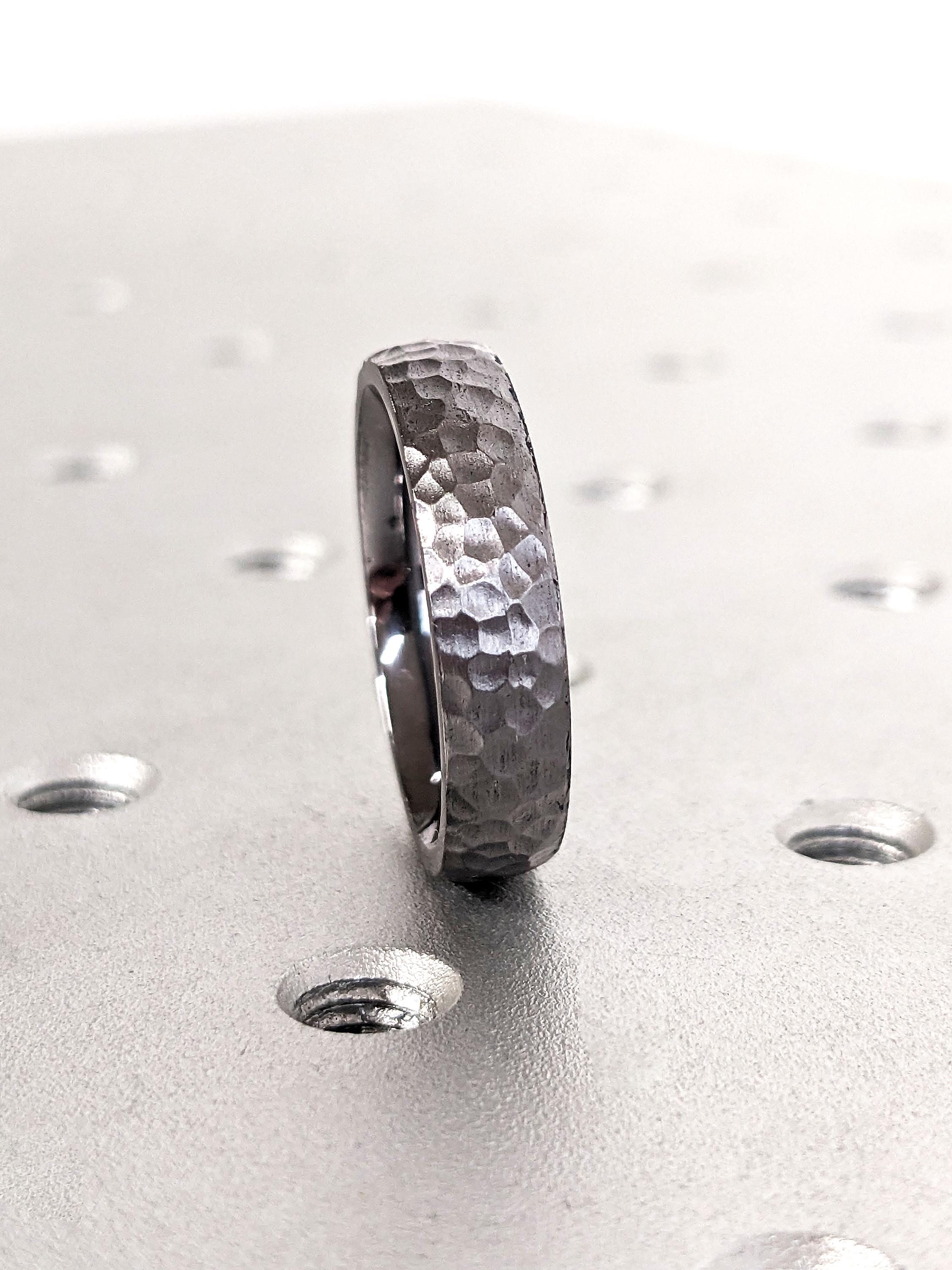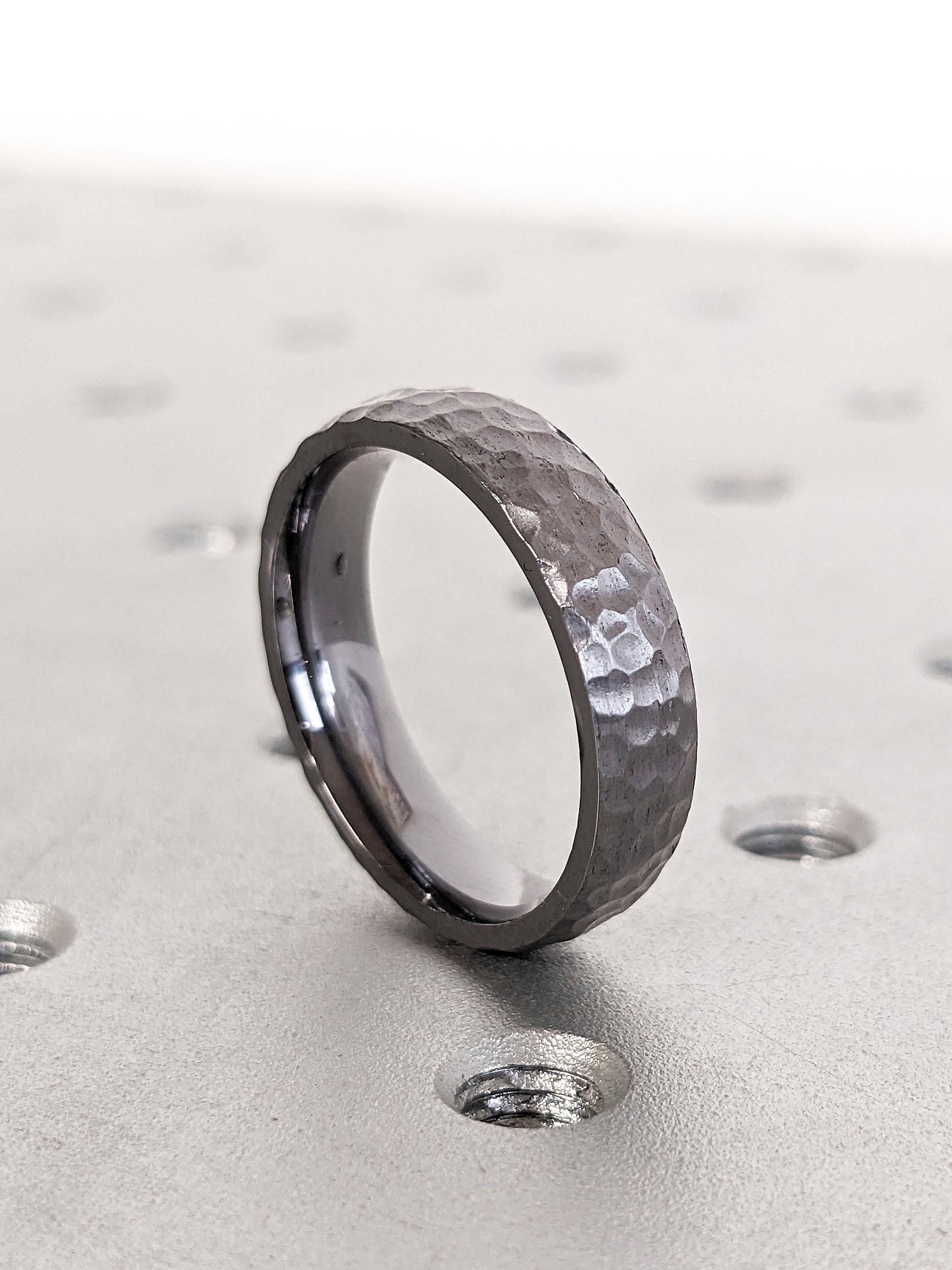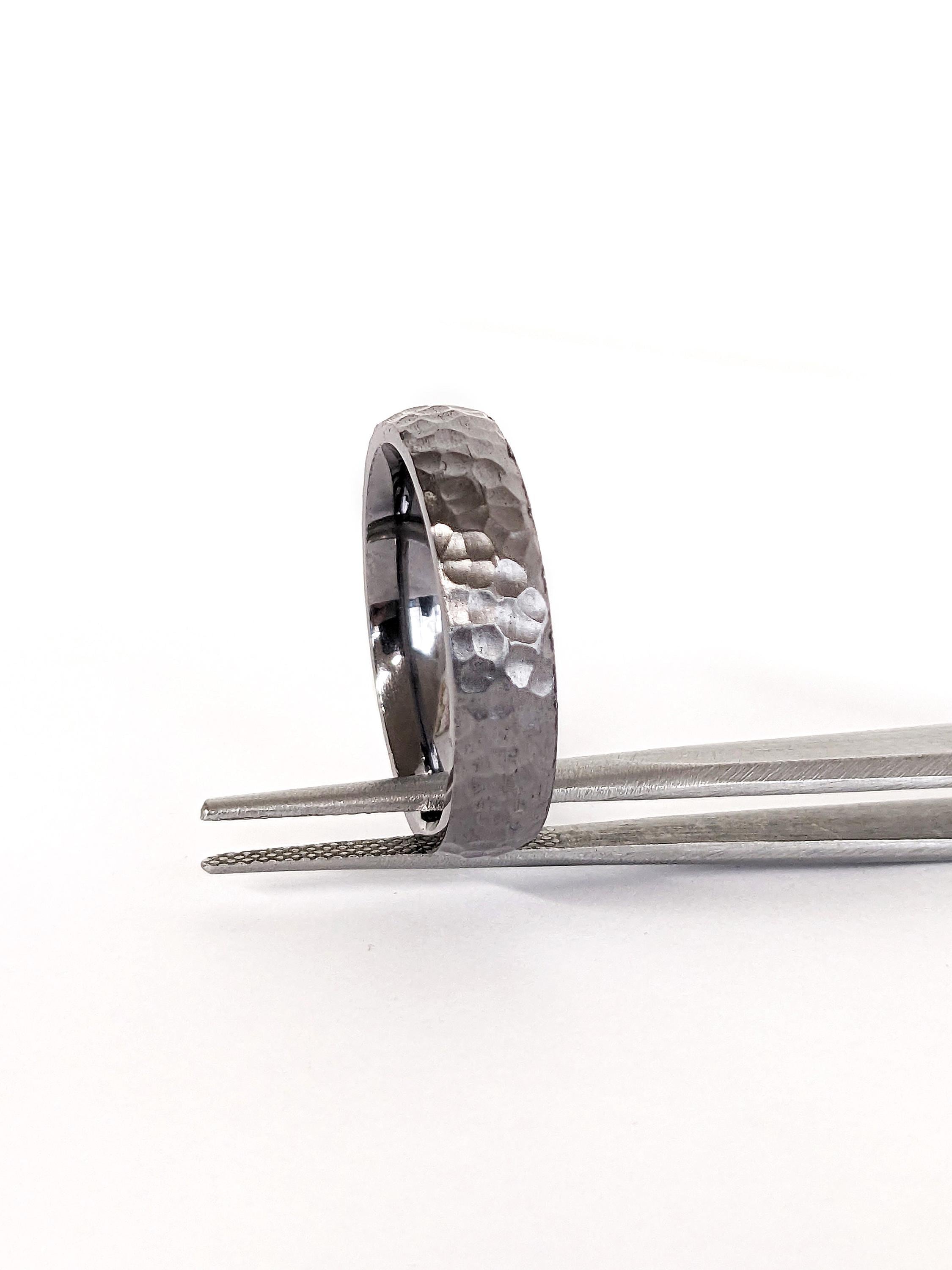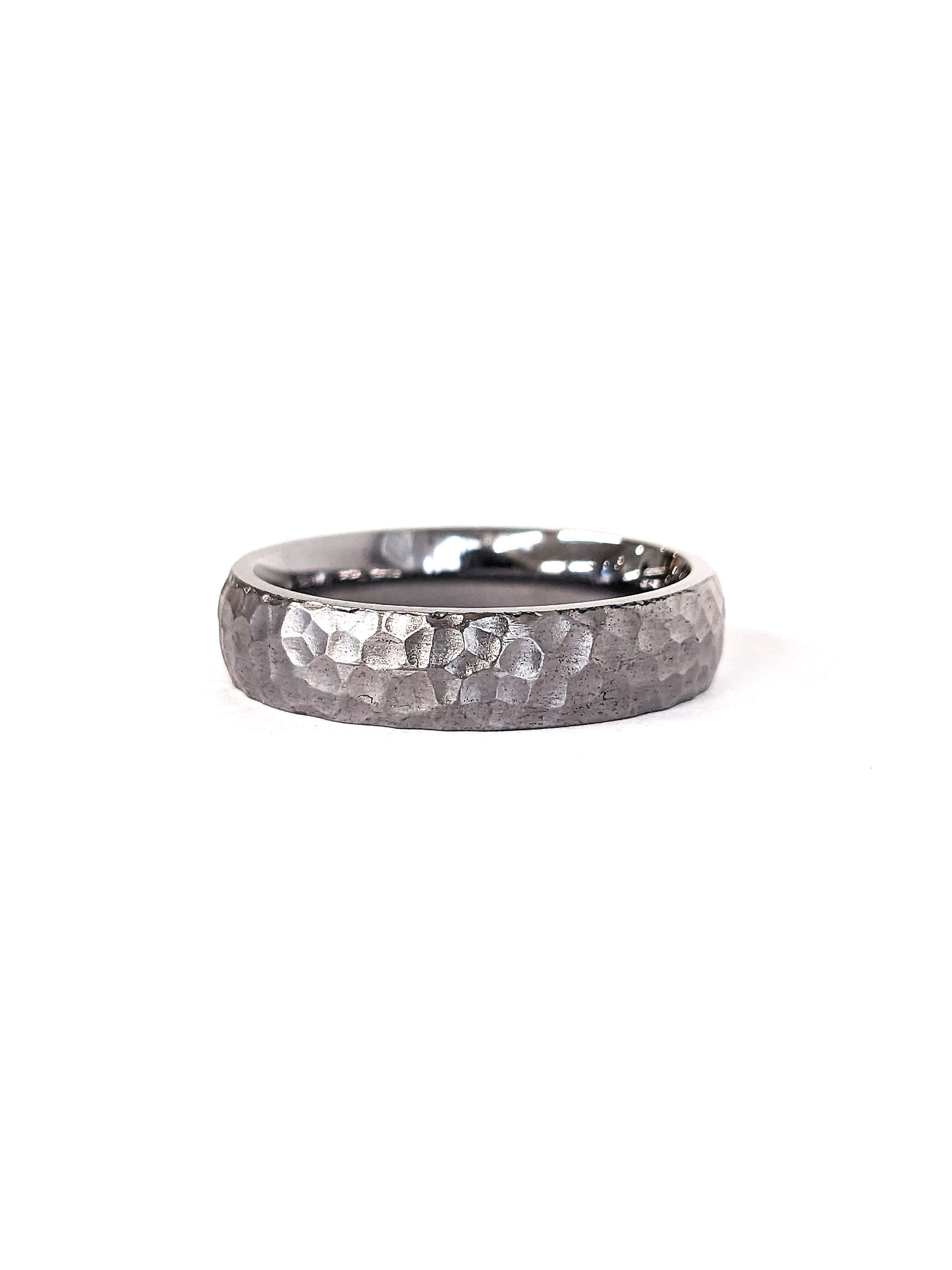 An alternative metal, 5mm width ring for him, with hand hammered faceted surface. With a sophisticated dark grey hue, this ring is hypoallergenic and comes with comfort fit suitable for everyday wear.