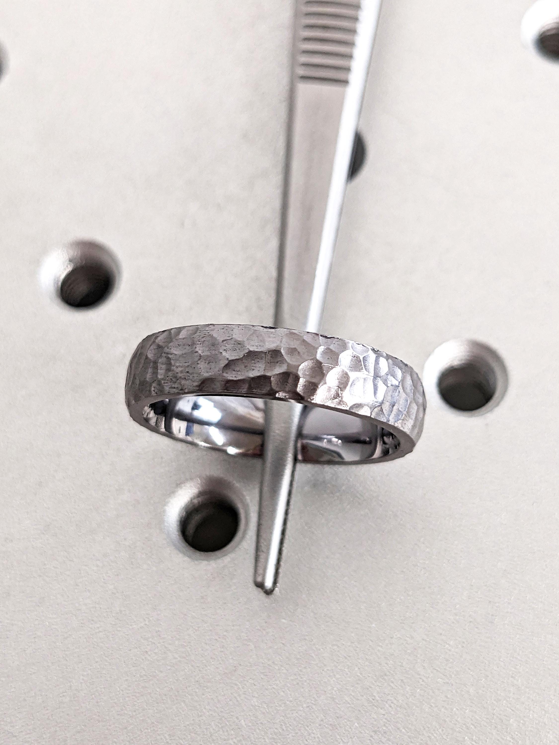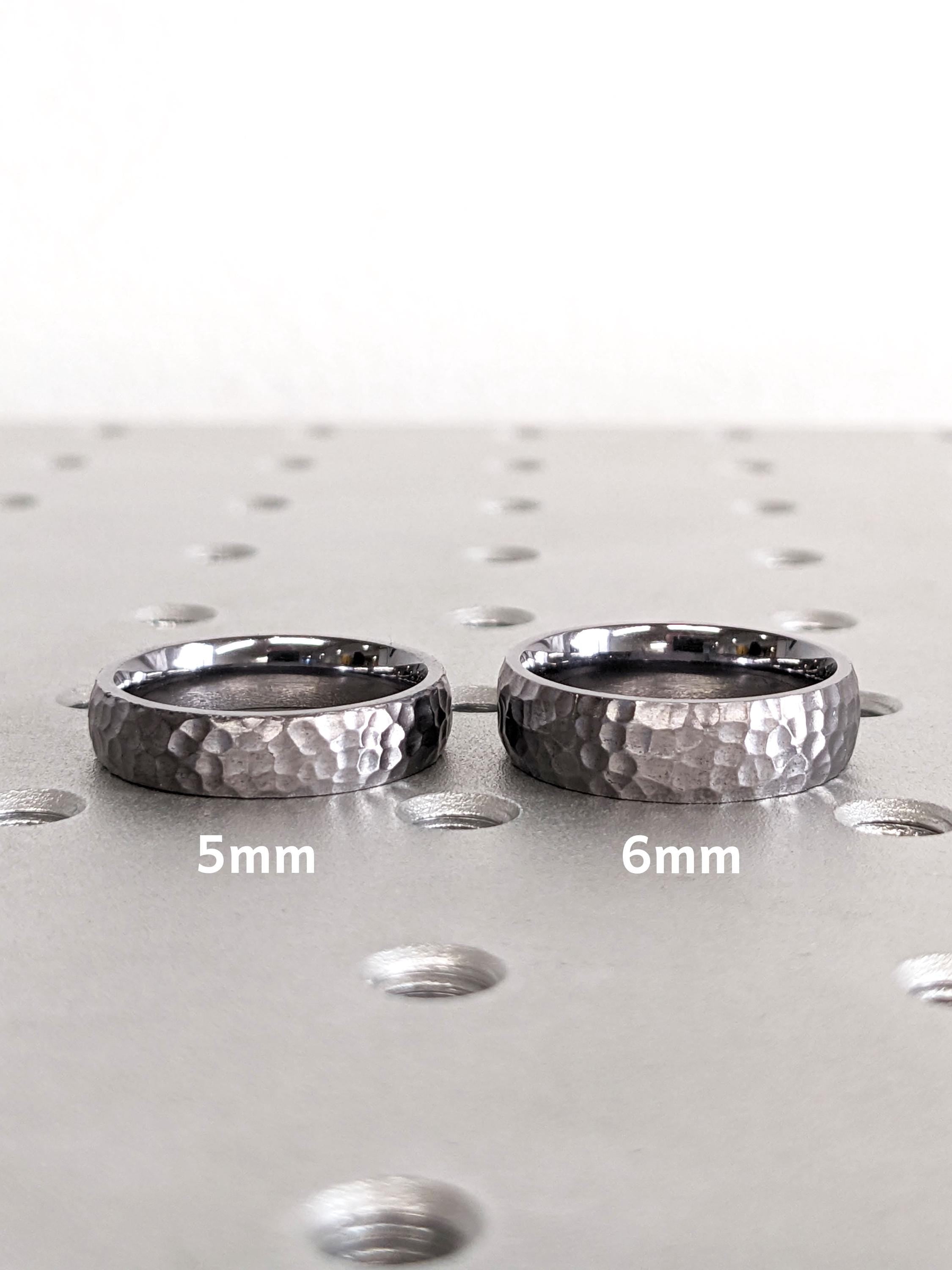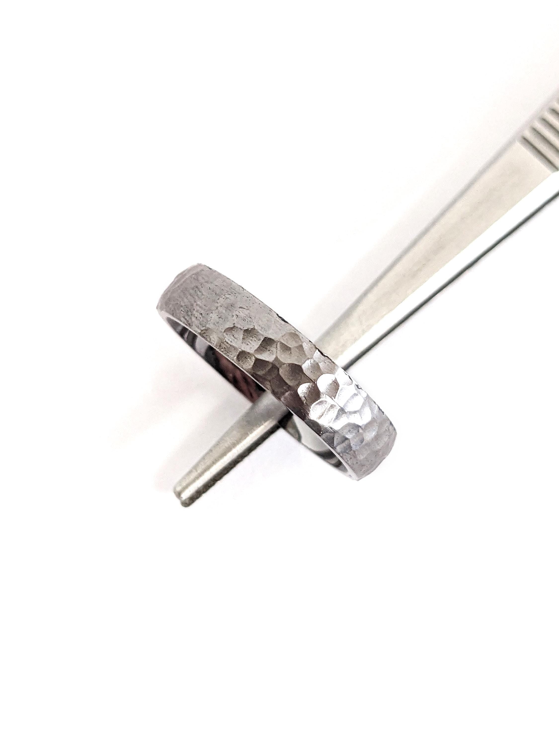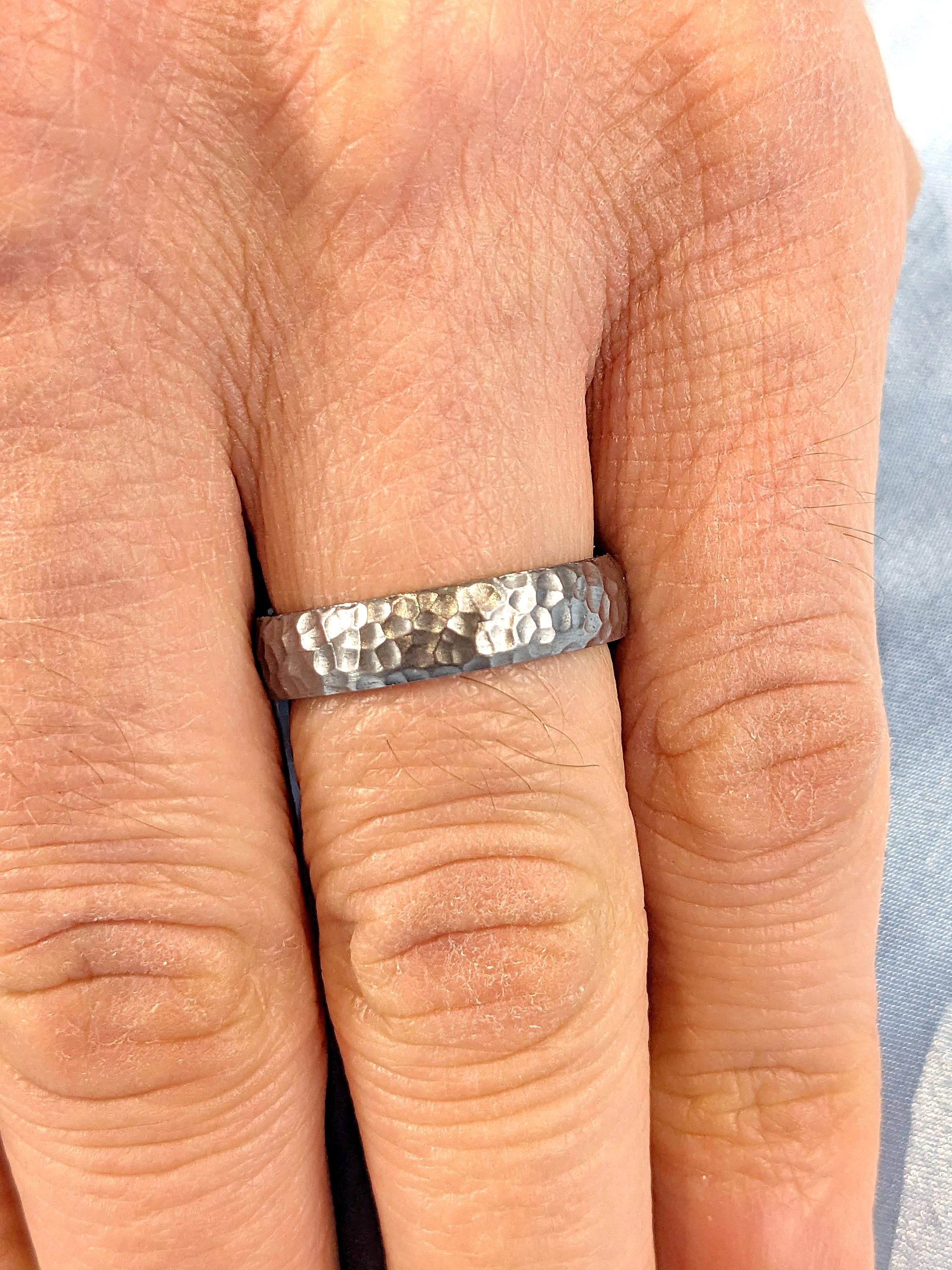 An alternative metal, 5mm width ring for him, with hand hammered faceted surface. With a sophisticated dark grey hue, this ring is hypoallergenic and comes with comfort fit suitable for everyday wear.