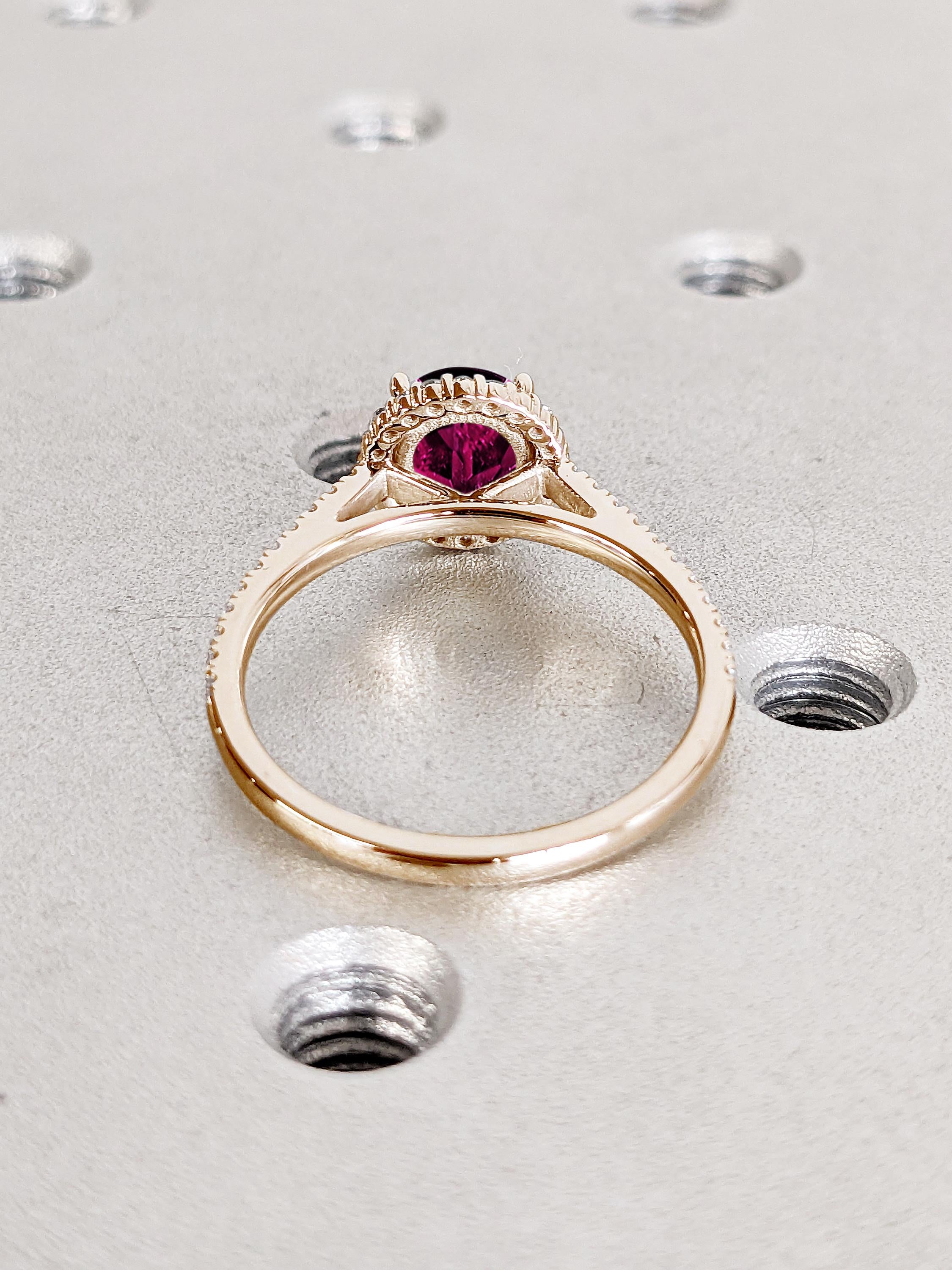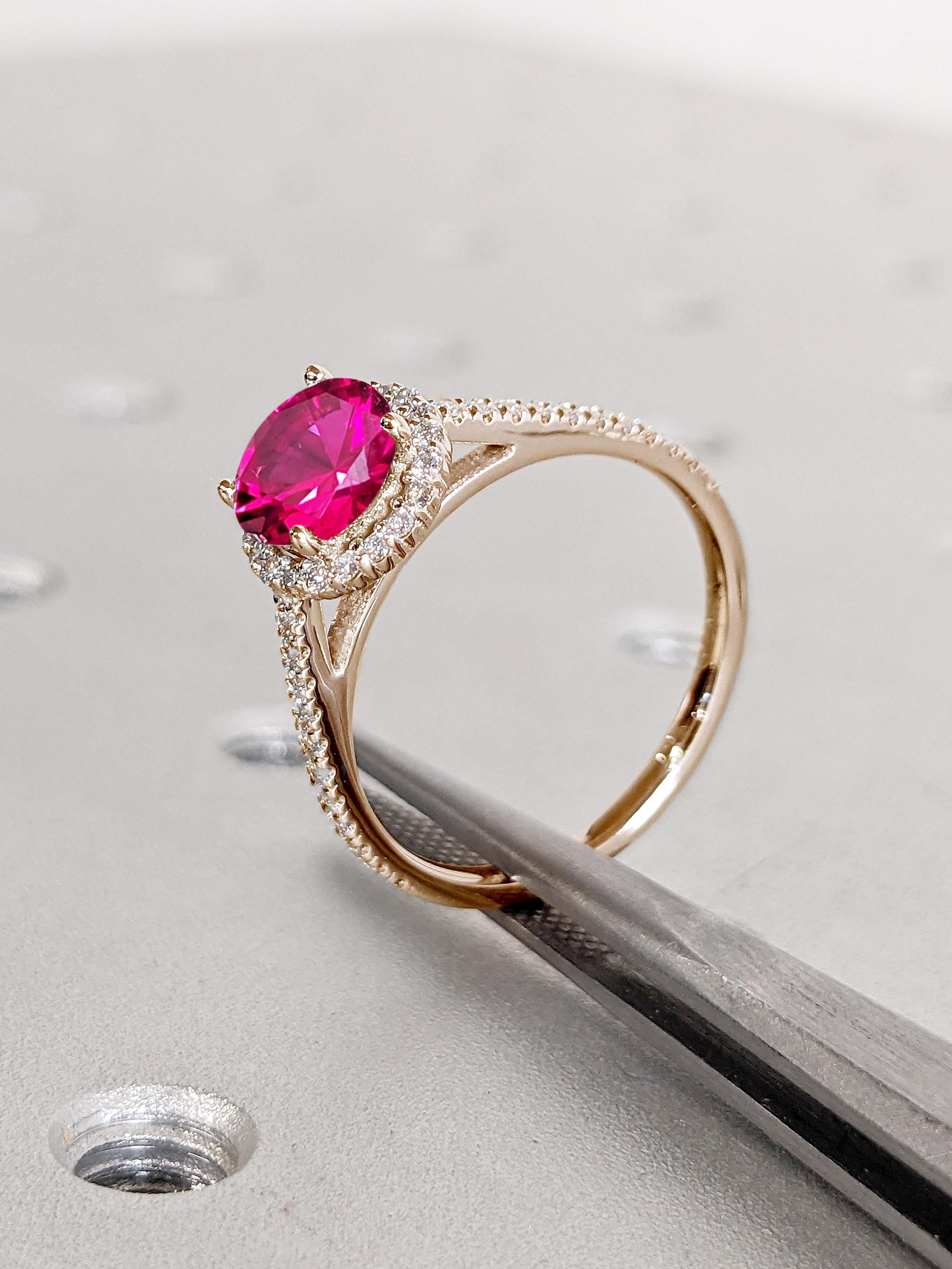 Comfort Fit Lab Ruby Ring, Halo Engagement Ring, Rose Gold Ring, Ruby Anniversary Ring, July Birthstone Ring, Moissanite Half Eternity Ring
