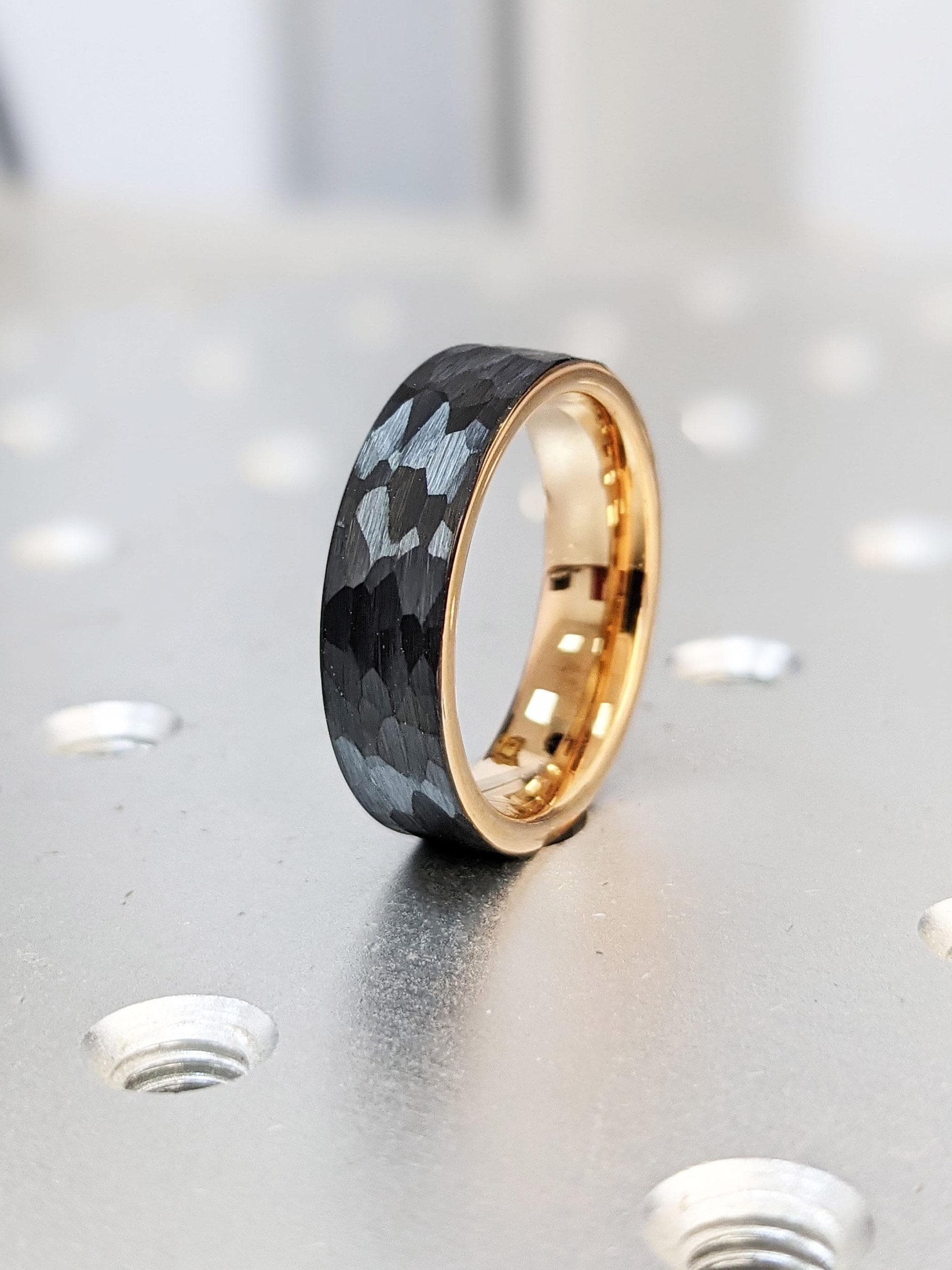 Comfort Fit Tungsten Ring for Him | Black Tungsten Rose Gold 6MM Men's Wedding Ring | Hammered Rough Faceted Black Rhodium Male Wedding Band