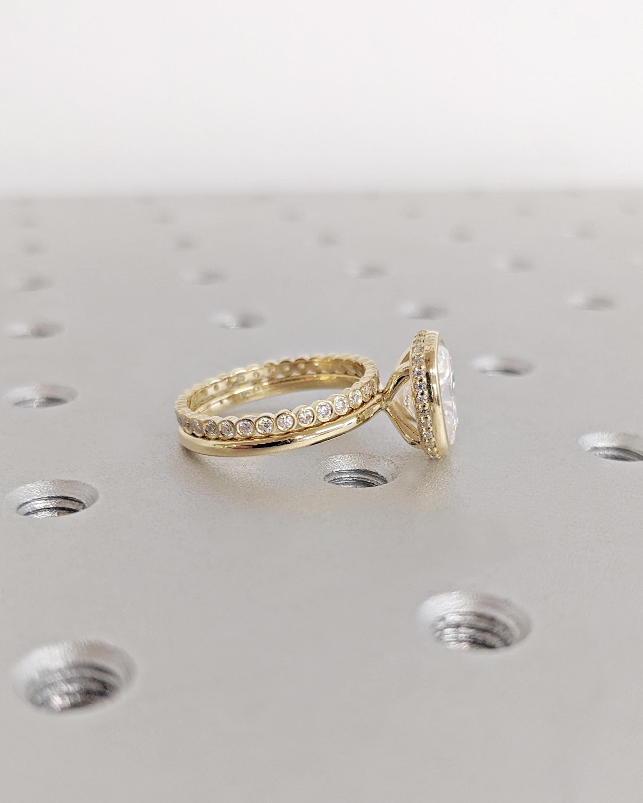 Cushion Cut Lab Grown Diamond Hidden Halo Engagement Ring Set 14K Yellow Gold Matching Diamond Band Wedding Anniversary Custom Eternity Ring