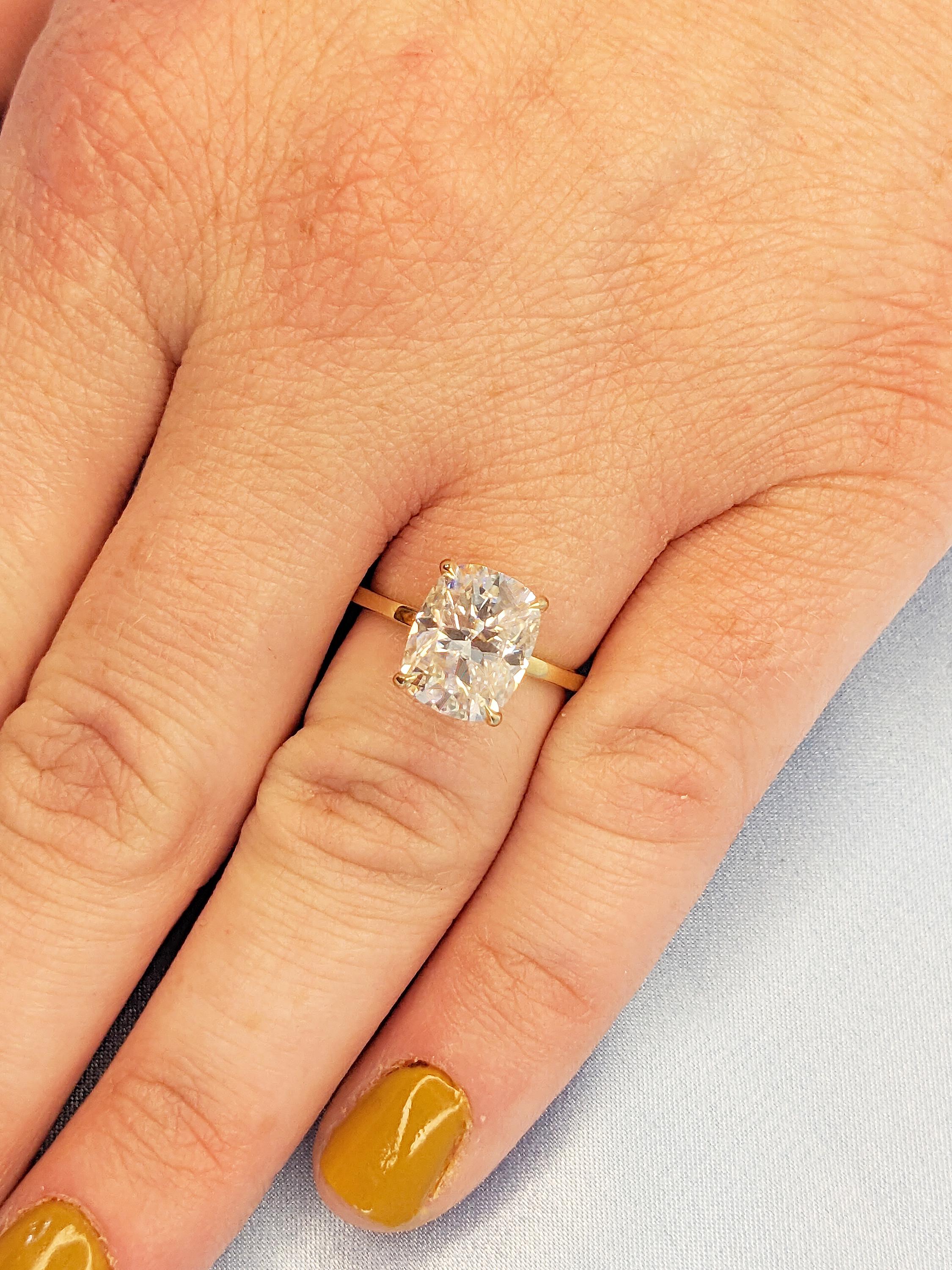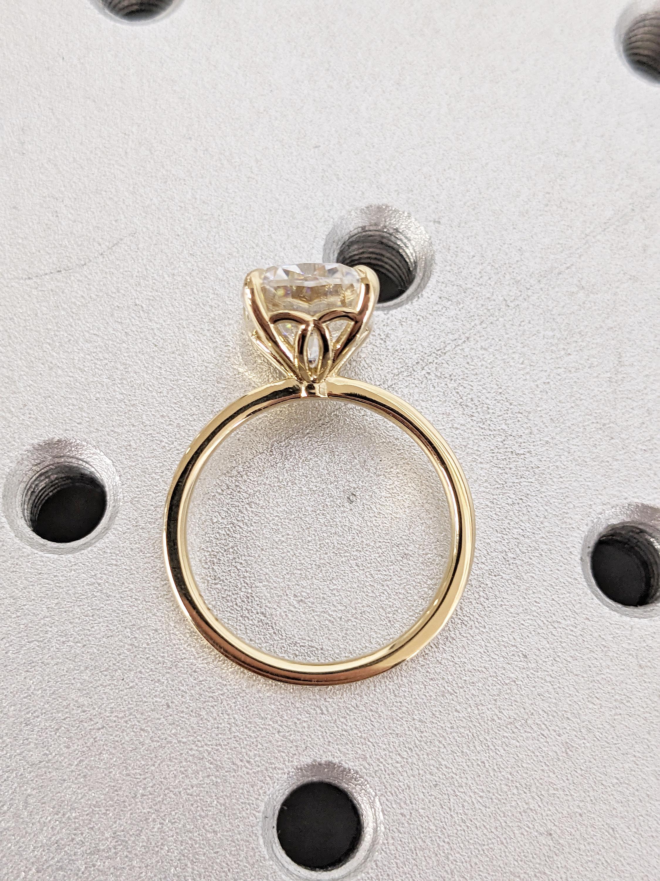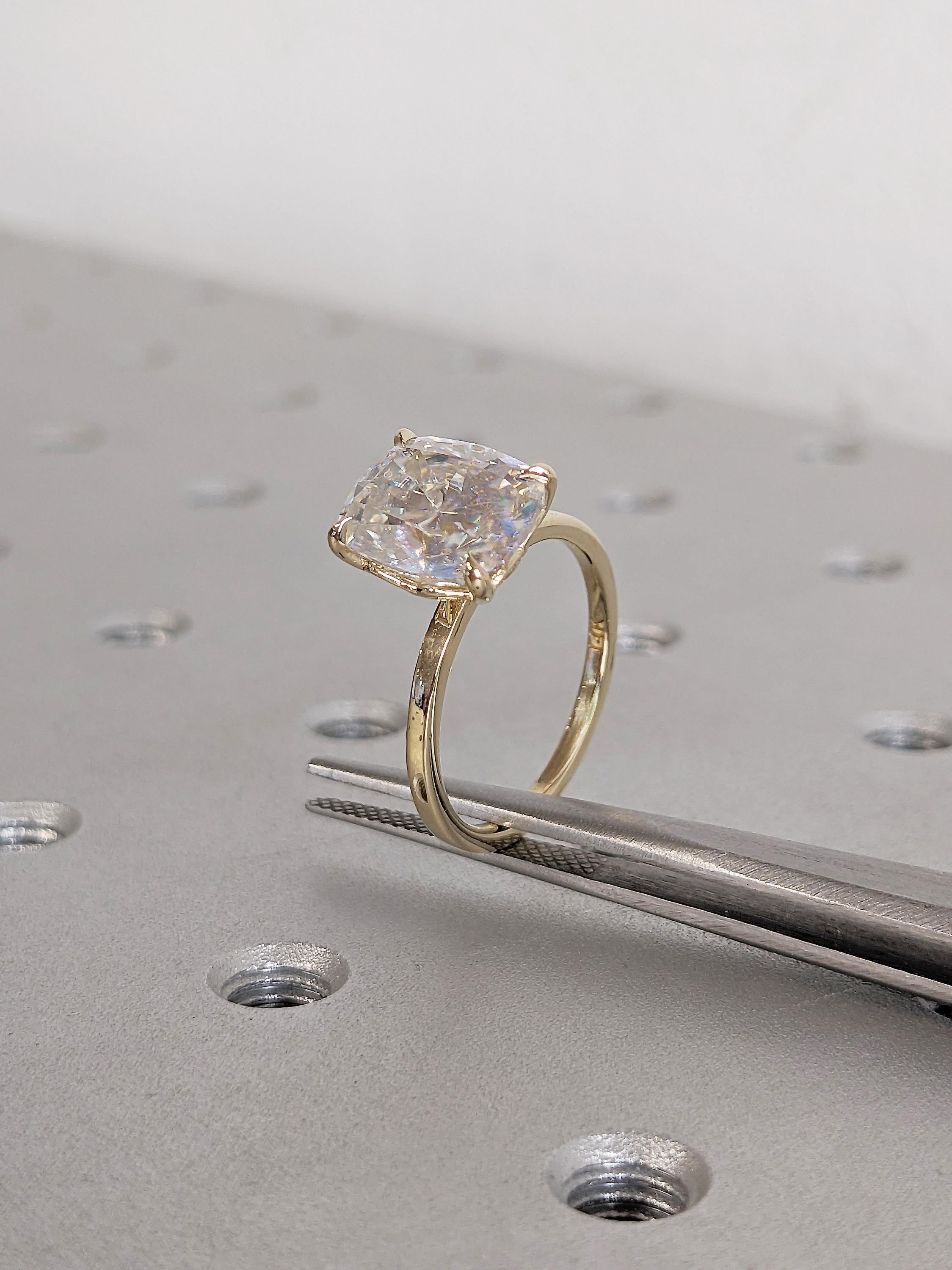 This stunning statement ring features a cushion cut Moissanite, securely set with elegant talon prongs on a luxurious gold band. Designed to captivate, its timeless sparkle makes it the perfect choice for both engagements and anniversaries, symbolizing love and commitment with a modern yet classic touch.