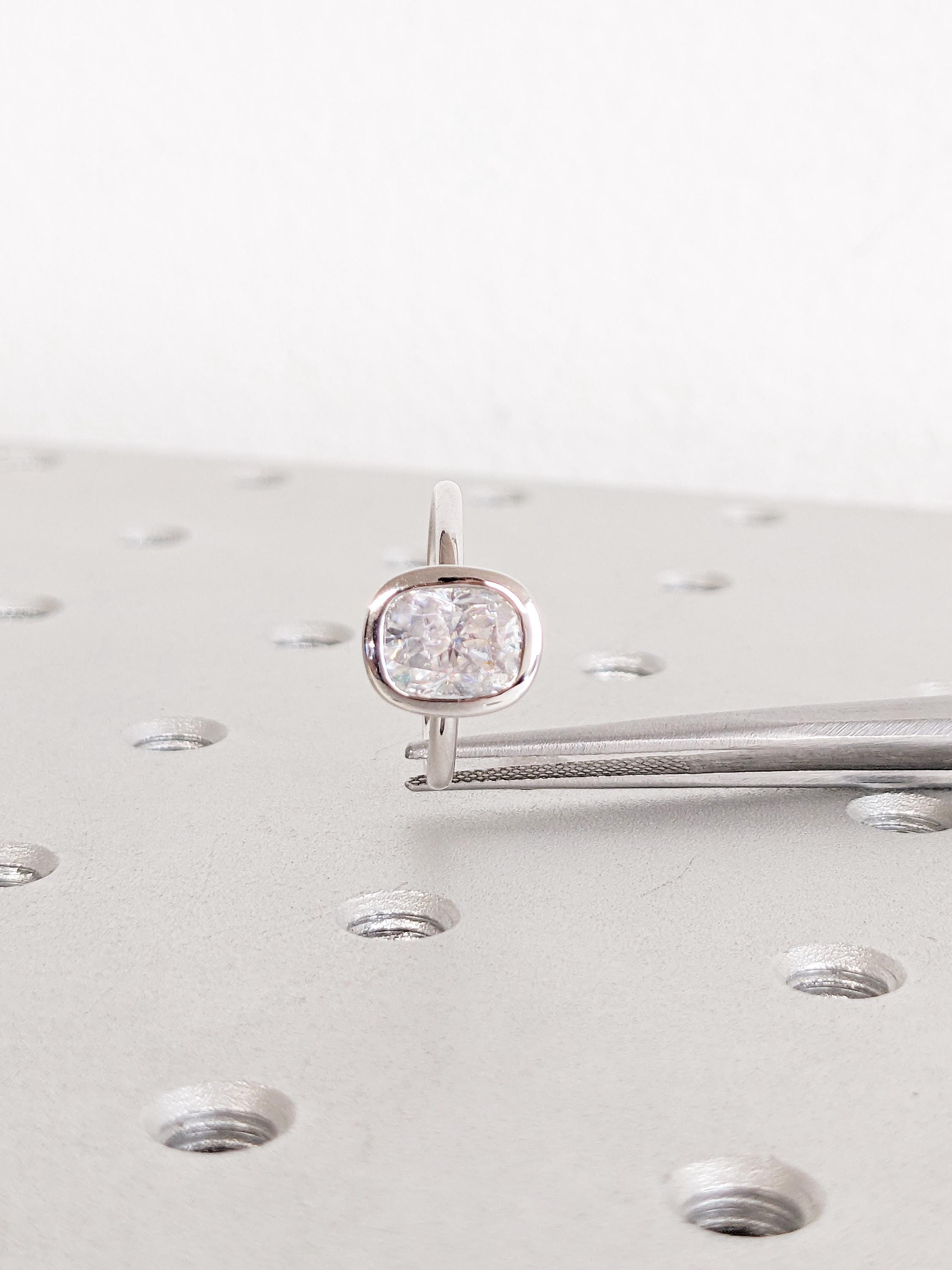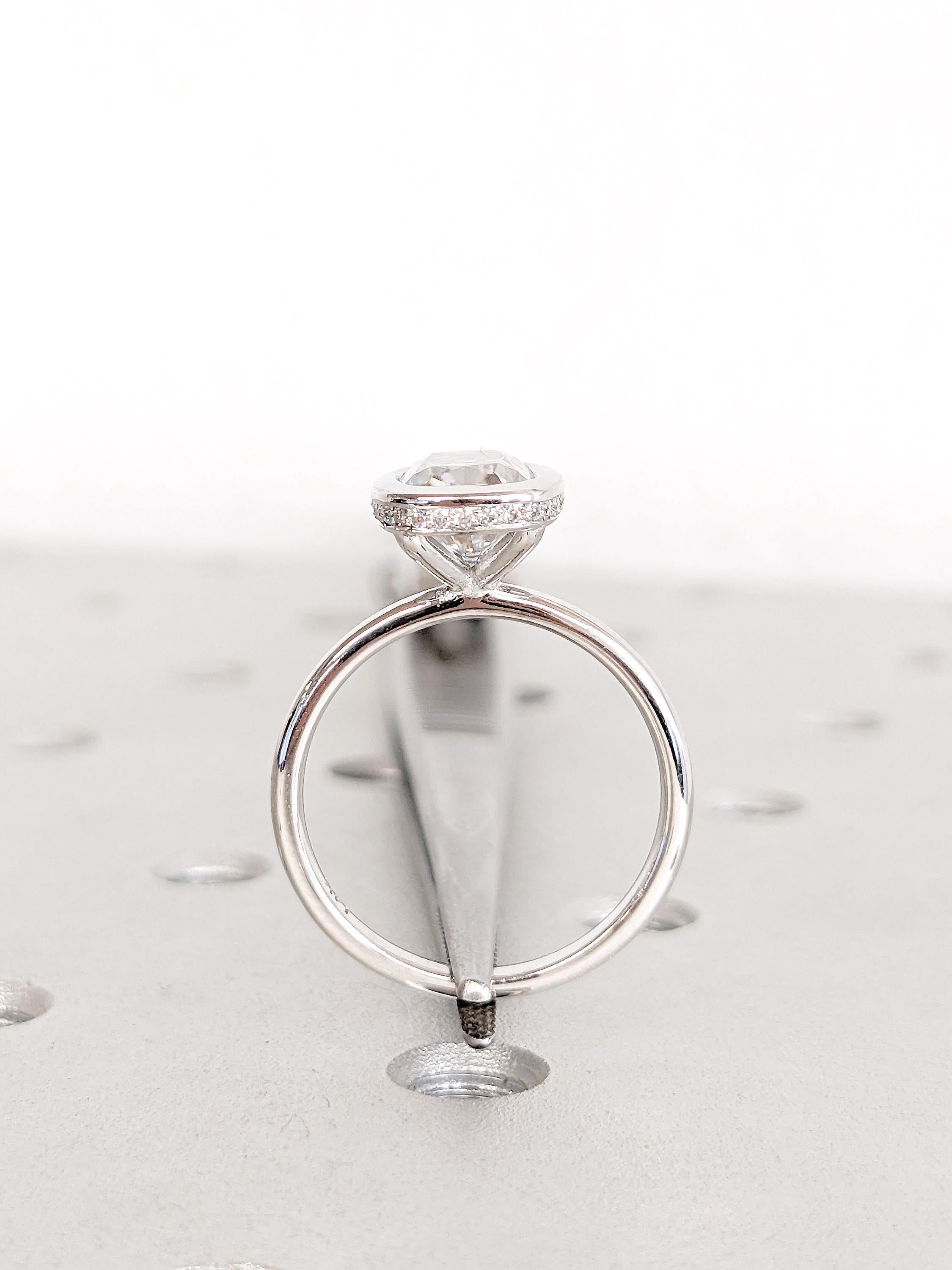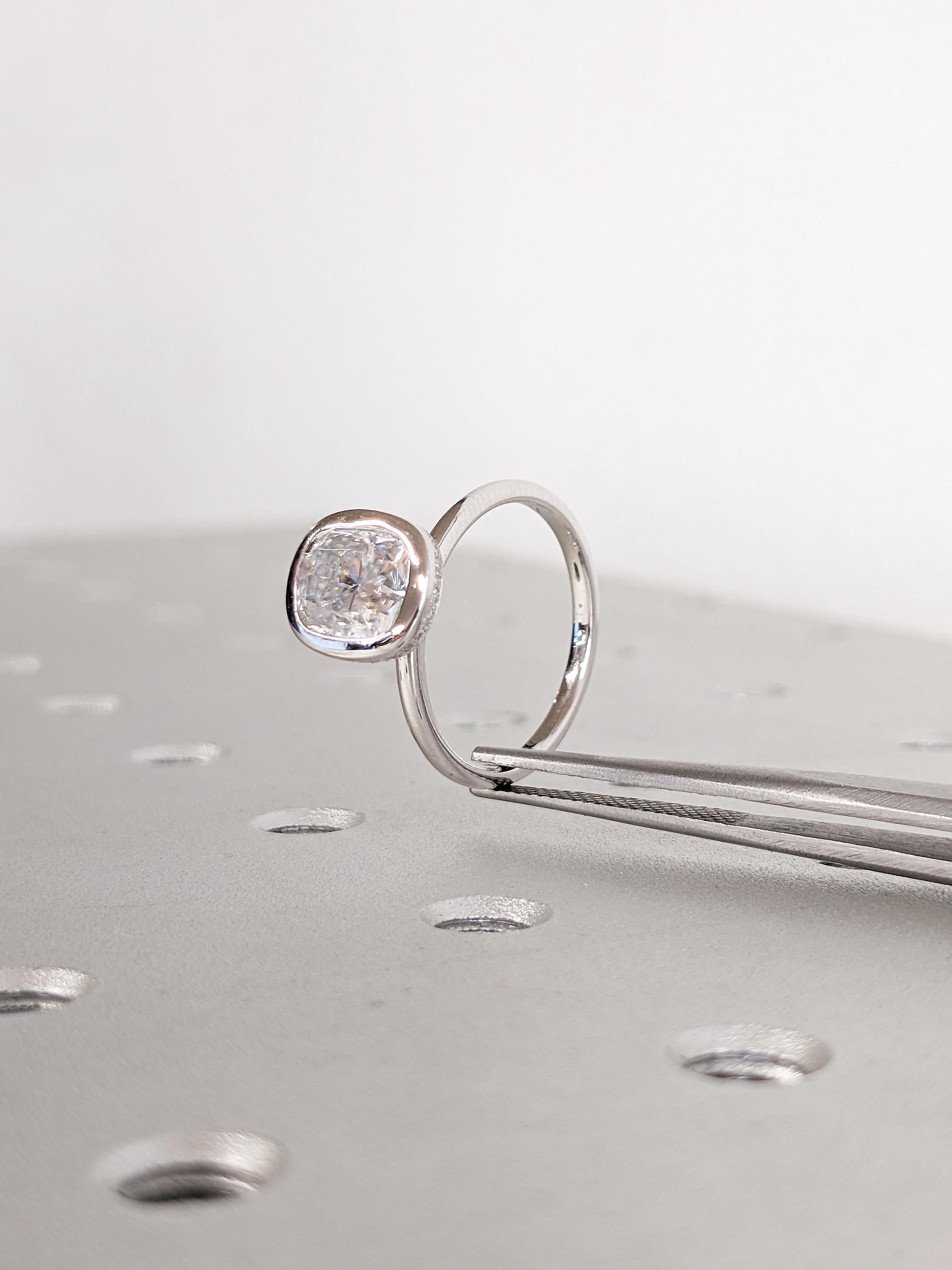 Moissanite engagement ring with cushion cut Moissanite in a bezel setting, complemented by round hidden halo side stones in Natural Diamond, Lab Grown Diamond, or Moissanite. The elegant design highlights brilliance with a slim band and minimalist profile. Perfect for engagement, bridal jewelry, anniversaries, or everyday wear, this timeless ring adds sophistication and enduring beauty to any collection.