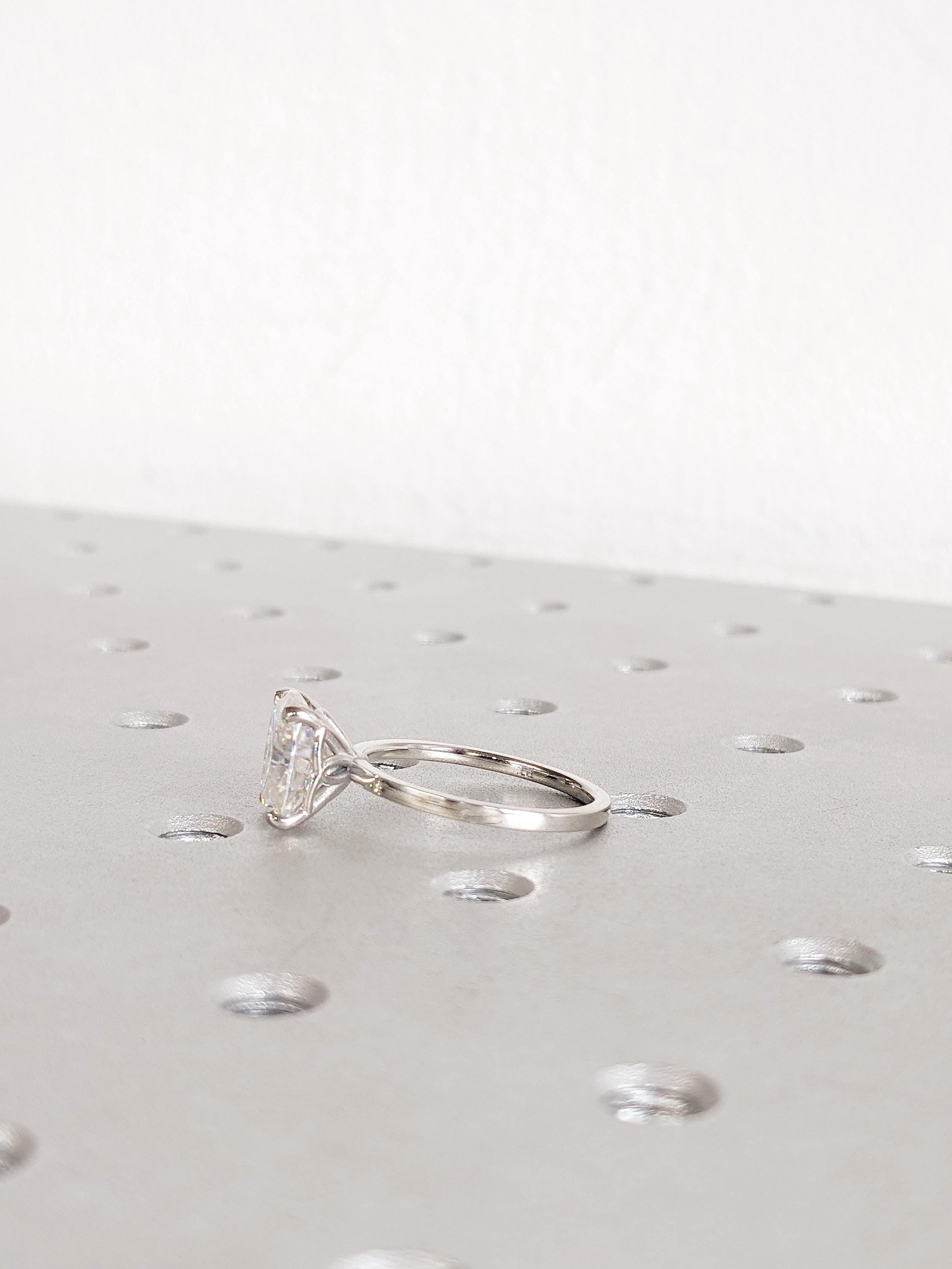 This Moissanite engagement ring features a cushion cut Moissanite in a refined talon prong setting, capturing a brilliant sparkle with timeless elegance. Its clean solitaire design highlights the stone’s fire and clarity, creating a sophisticated and modern look that makes it perfect for engagements, anniversaries, weddings, or as a meaningful symbol of everlasting love.