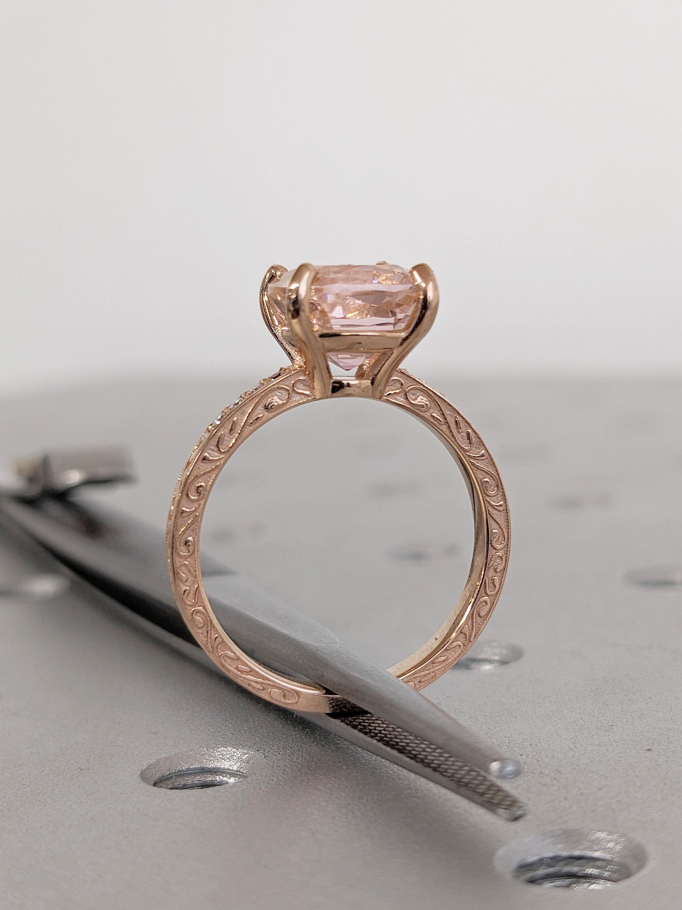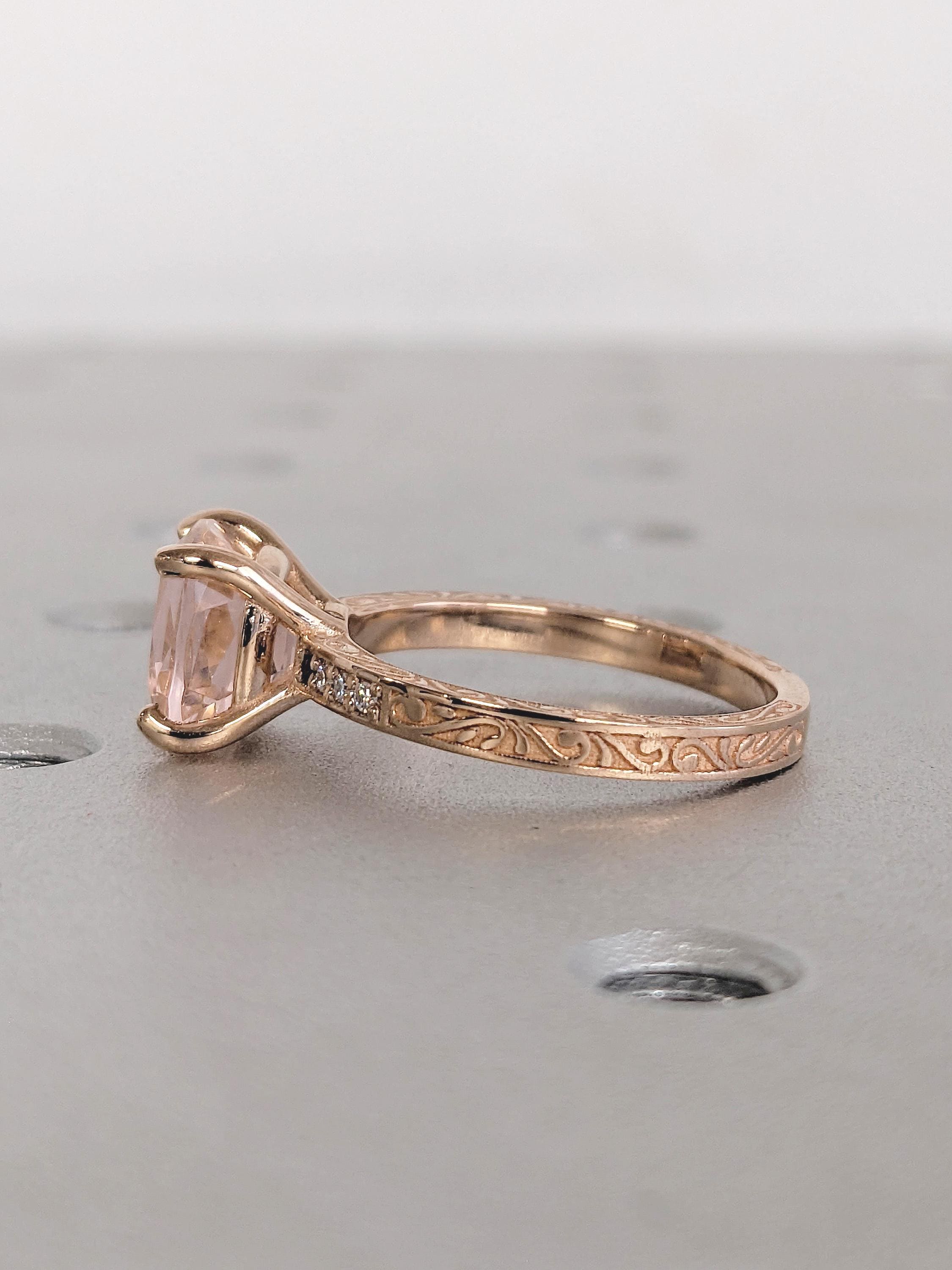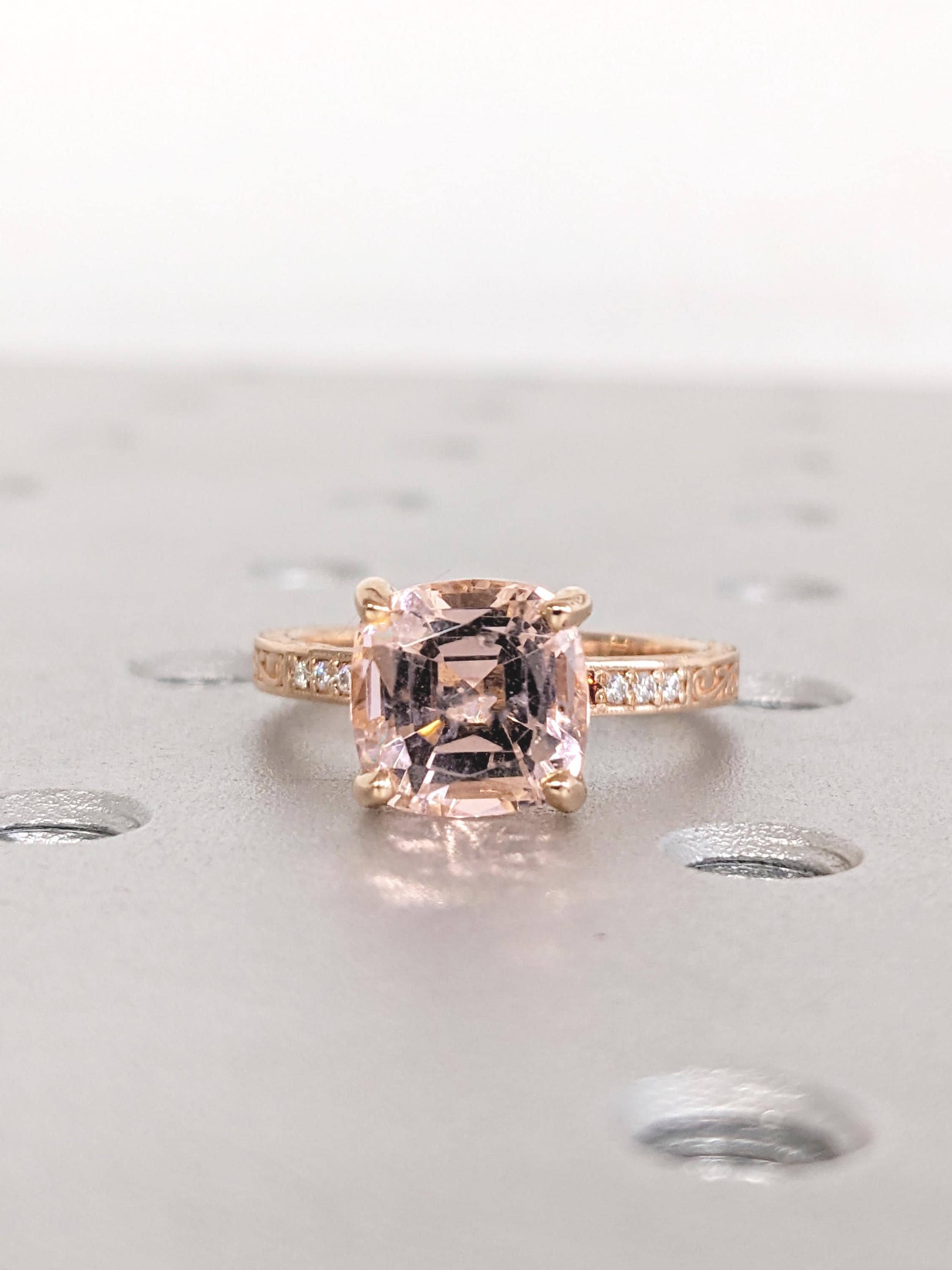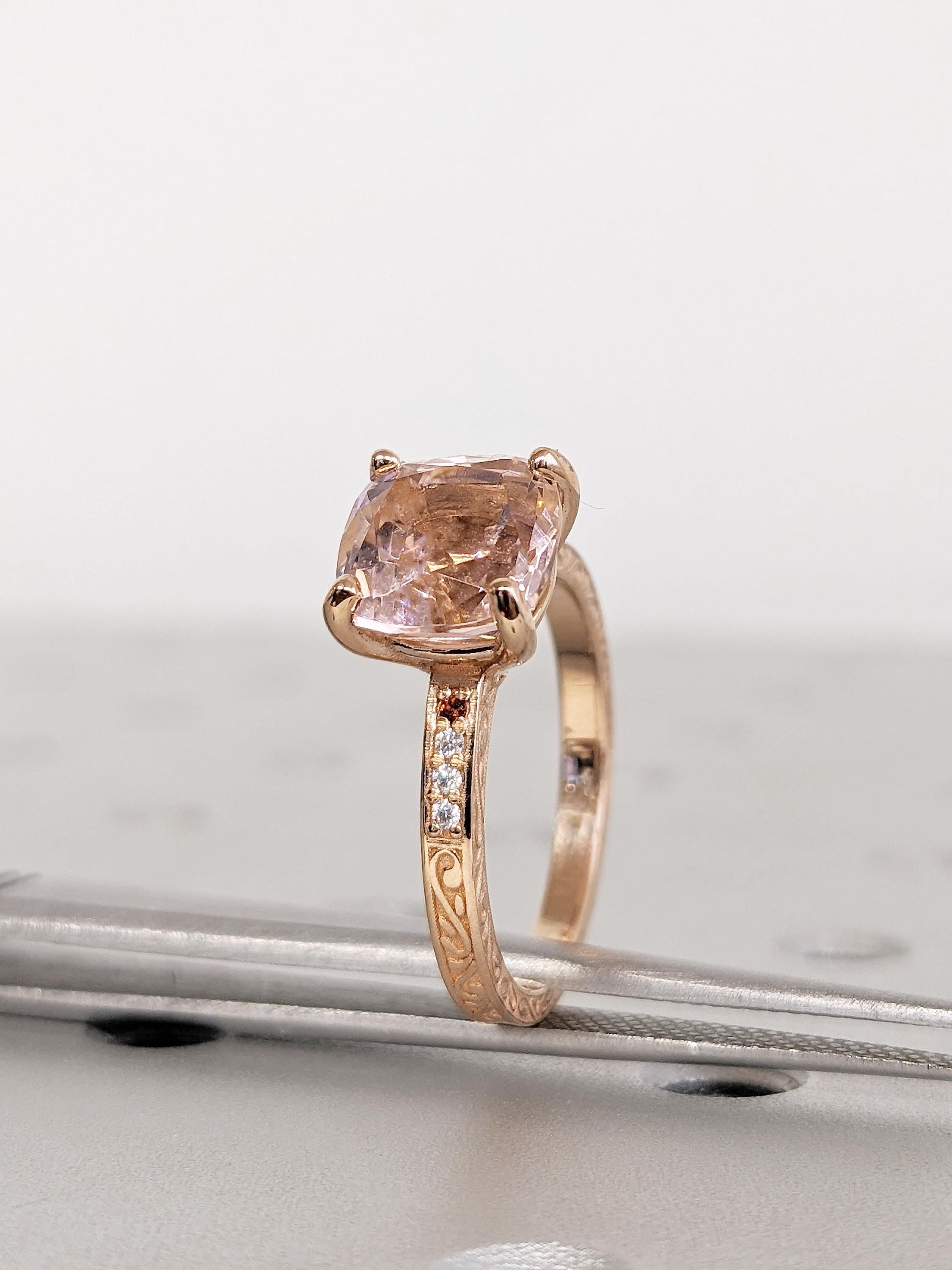 Cushion Cut Ring, Filigree Engagement Ring, Diamond, Garnet, Peach Morganite Ring, 14k Rose Gold Ring