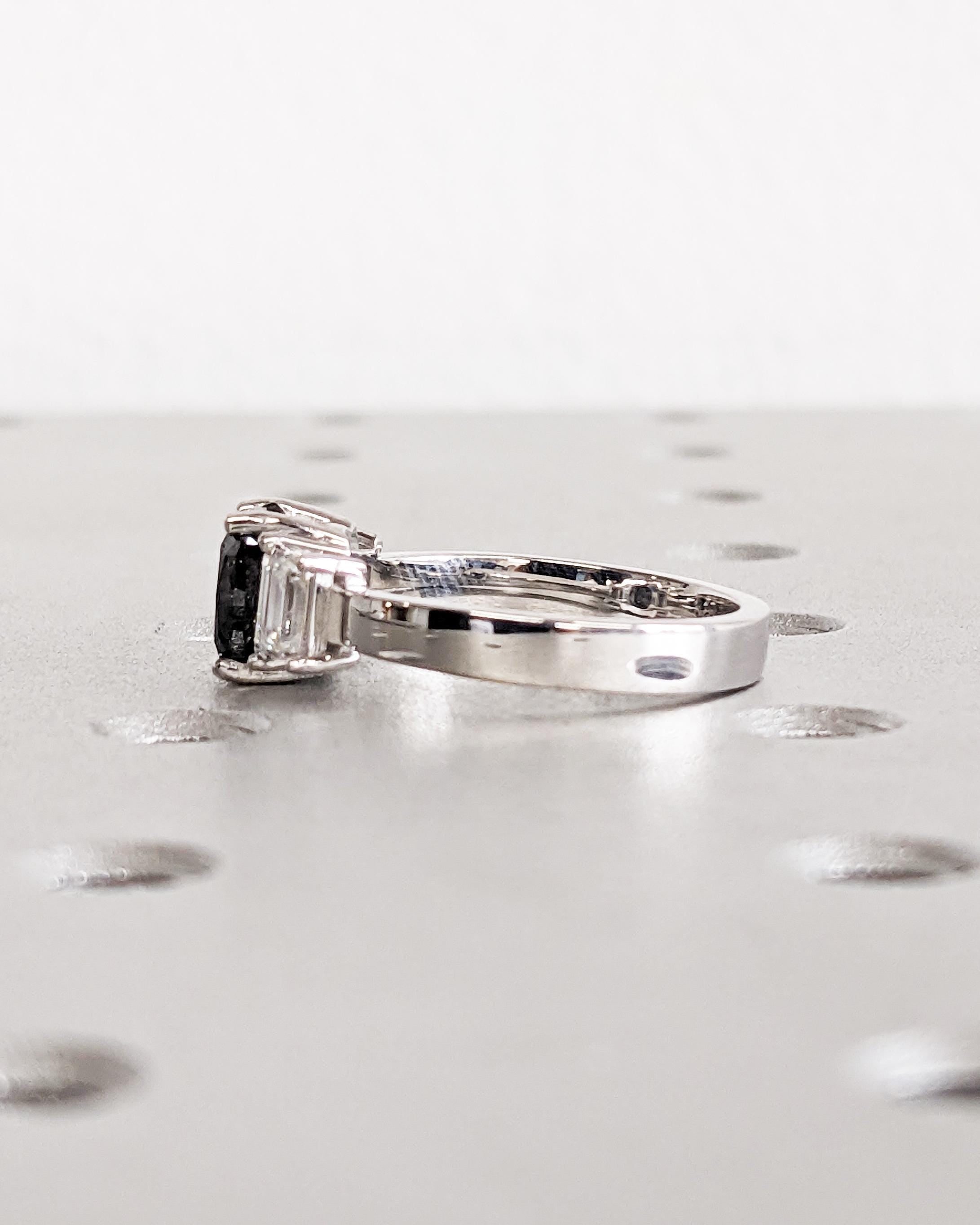 This ring features a stunning cushion cut Salt and Pepper diamond as the centerpiece, flanked by two trapezoid Moissanite side stones for a modern three stone design. The unique mix of natural character and refined sparkle makes it a perfect choice for an alternative engagement ring. Timeless and meaningful, it symbolizes individuality and love in a truly unique way.