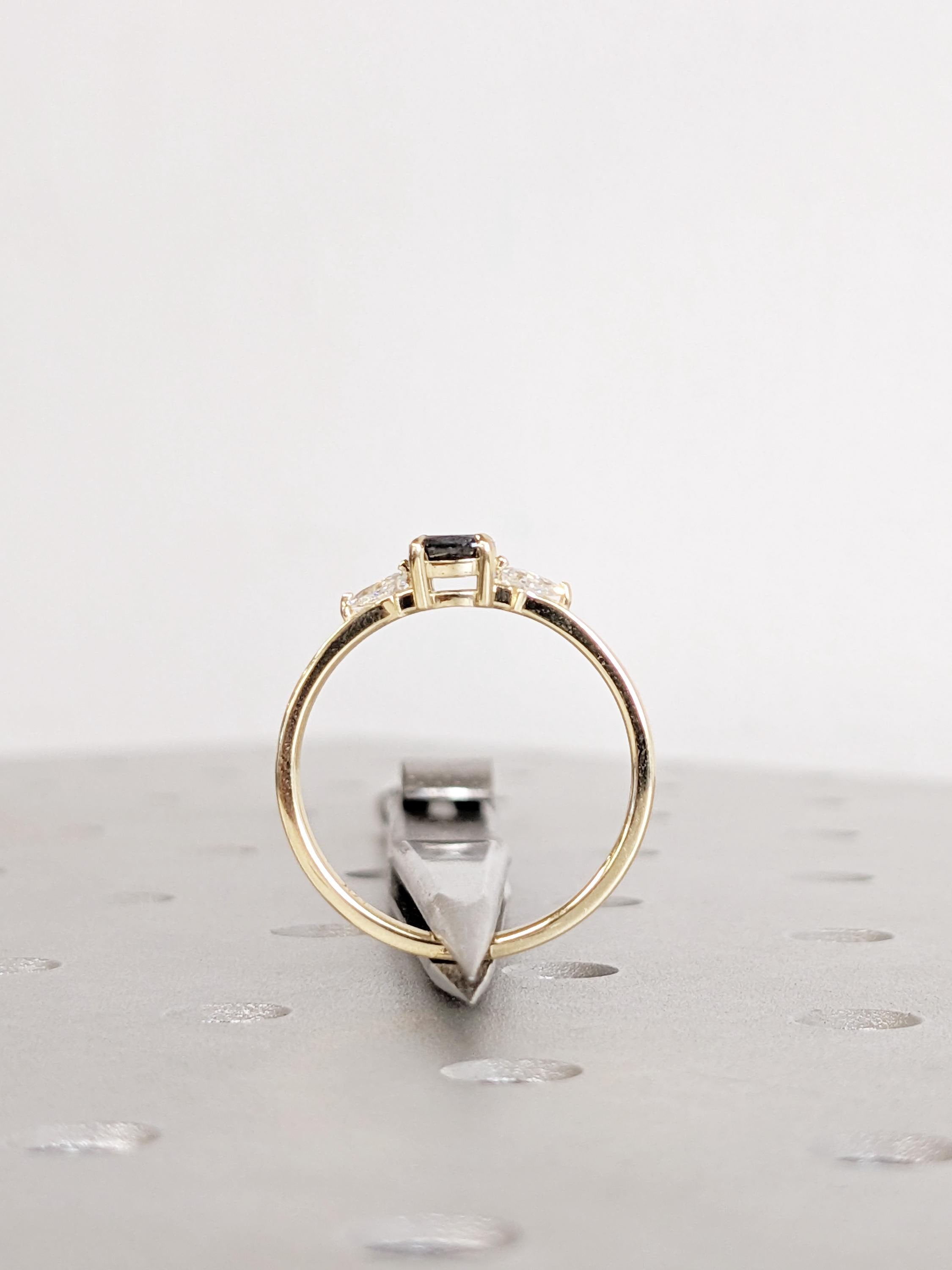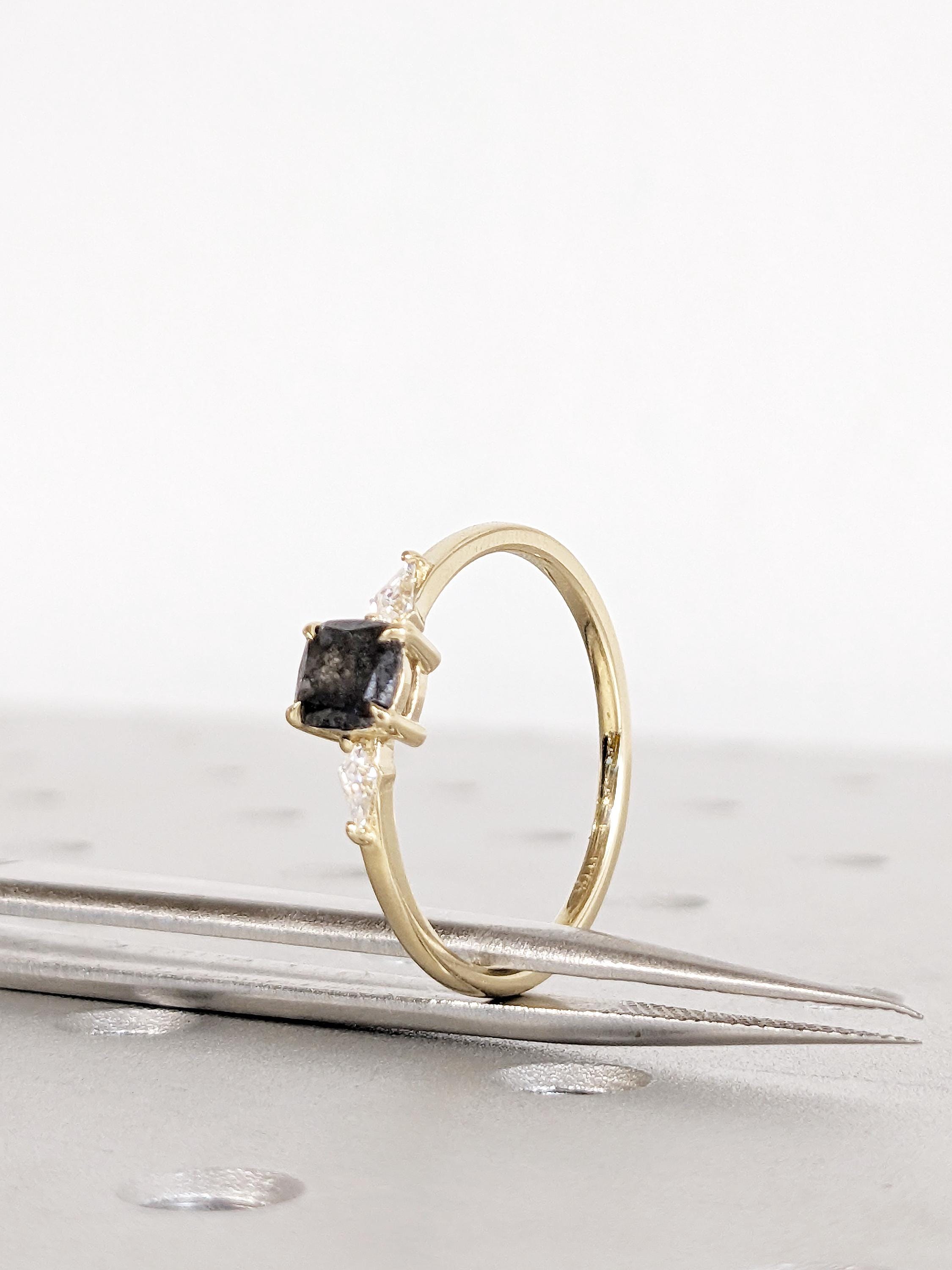 This ring features a Cushion Salt and Pepper Diamond as the center stone, set securely in a talon prong setting. Its natural speckled tones give it a bold and one-of-a-kind look. On each side, Kite-shaped Natural Diamonds or Moissanites side stones add a subtle sparkle. Perfect for engagements or anniversaries, this ring embodies modern elegance with a rustic charm.
