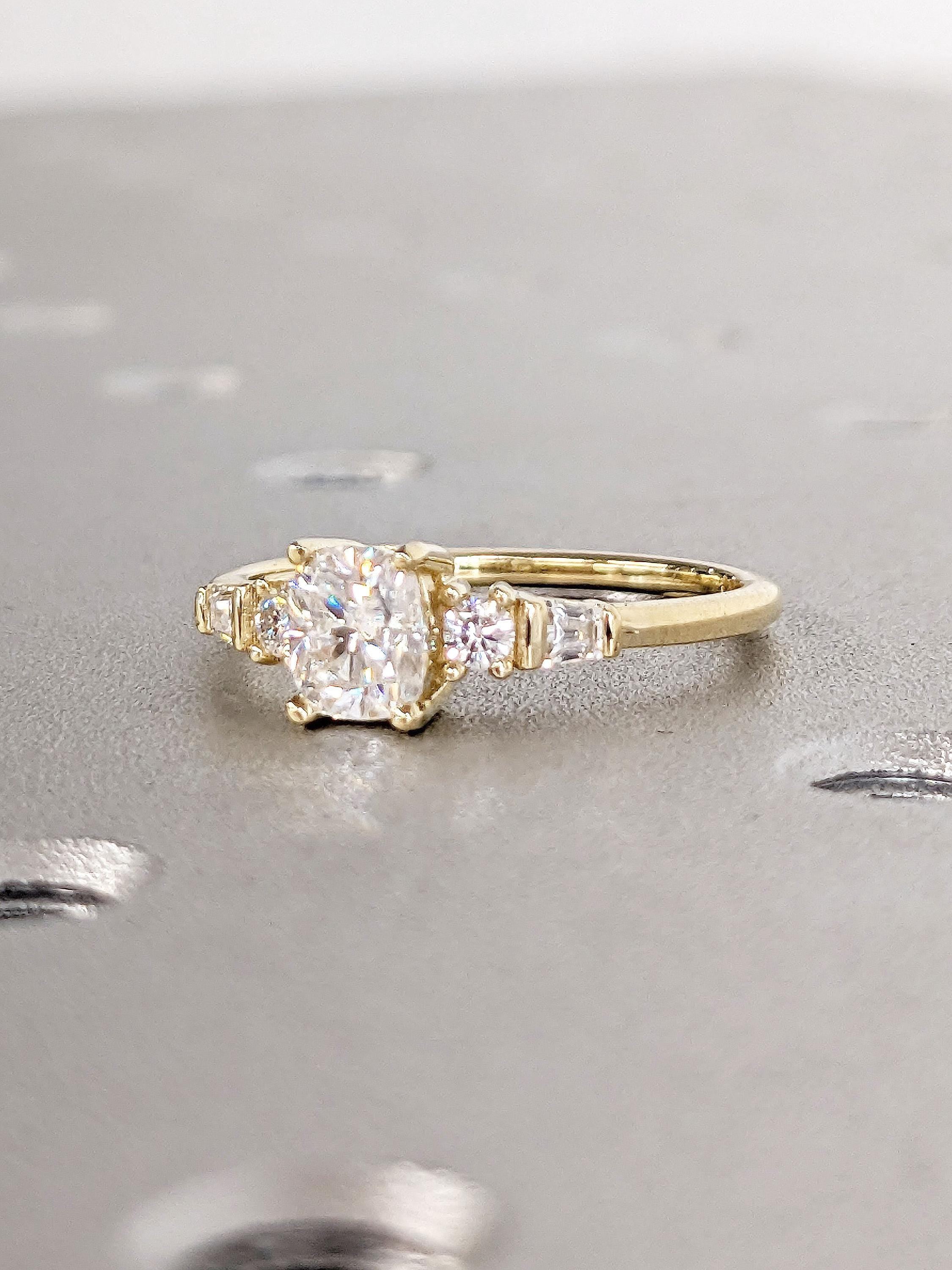 An elegant dainty ring with an eco friendly Lab Diamond focal stone in elongated cushion cut, accented by round and tapered baguette cut side stones set on a mix of prong and bar/channel setting. This ring is classic yet modern, making it the perfect complimenting statement jewelry for a sophisticated look.
