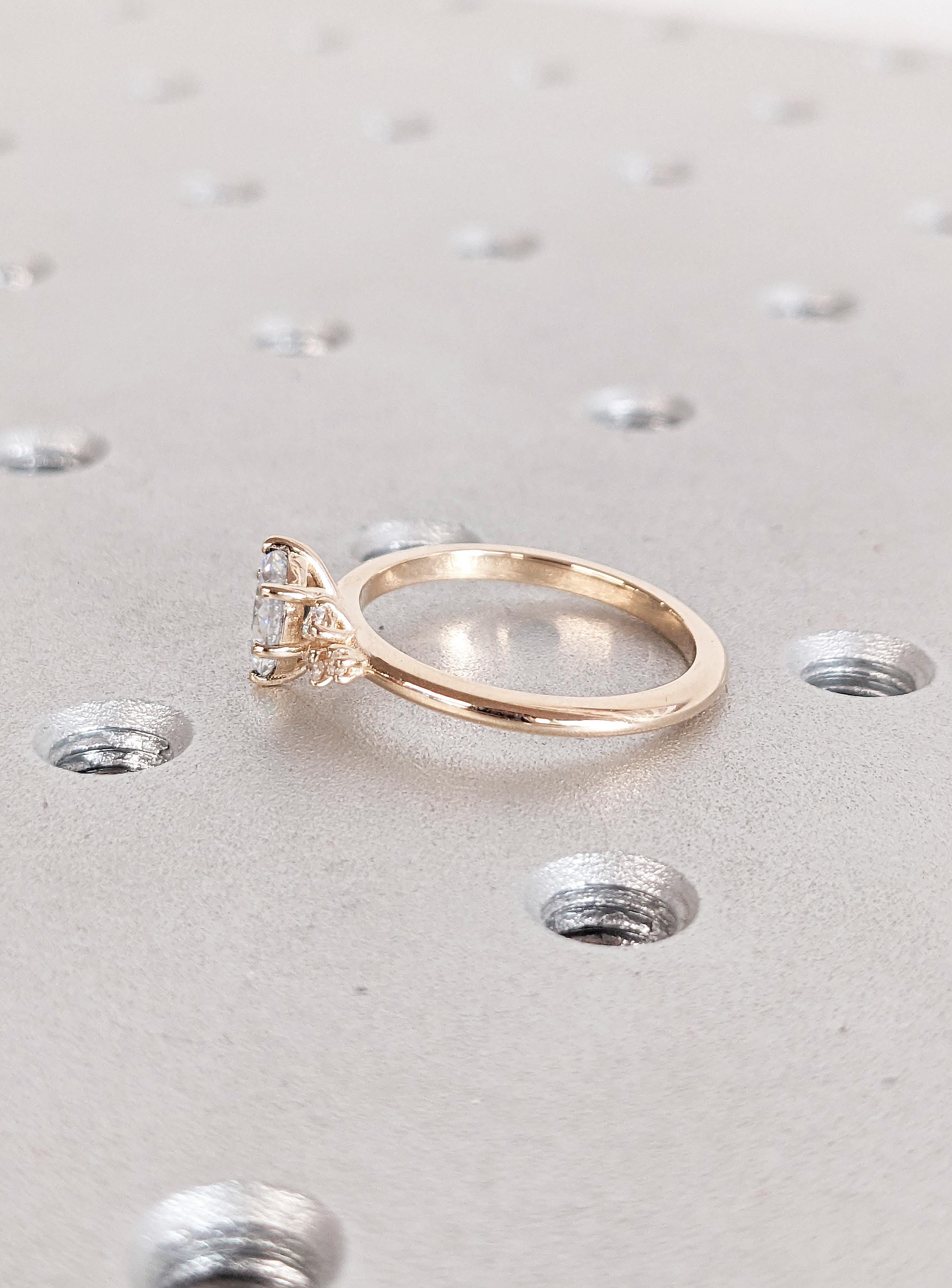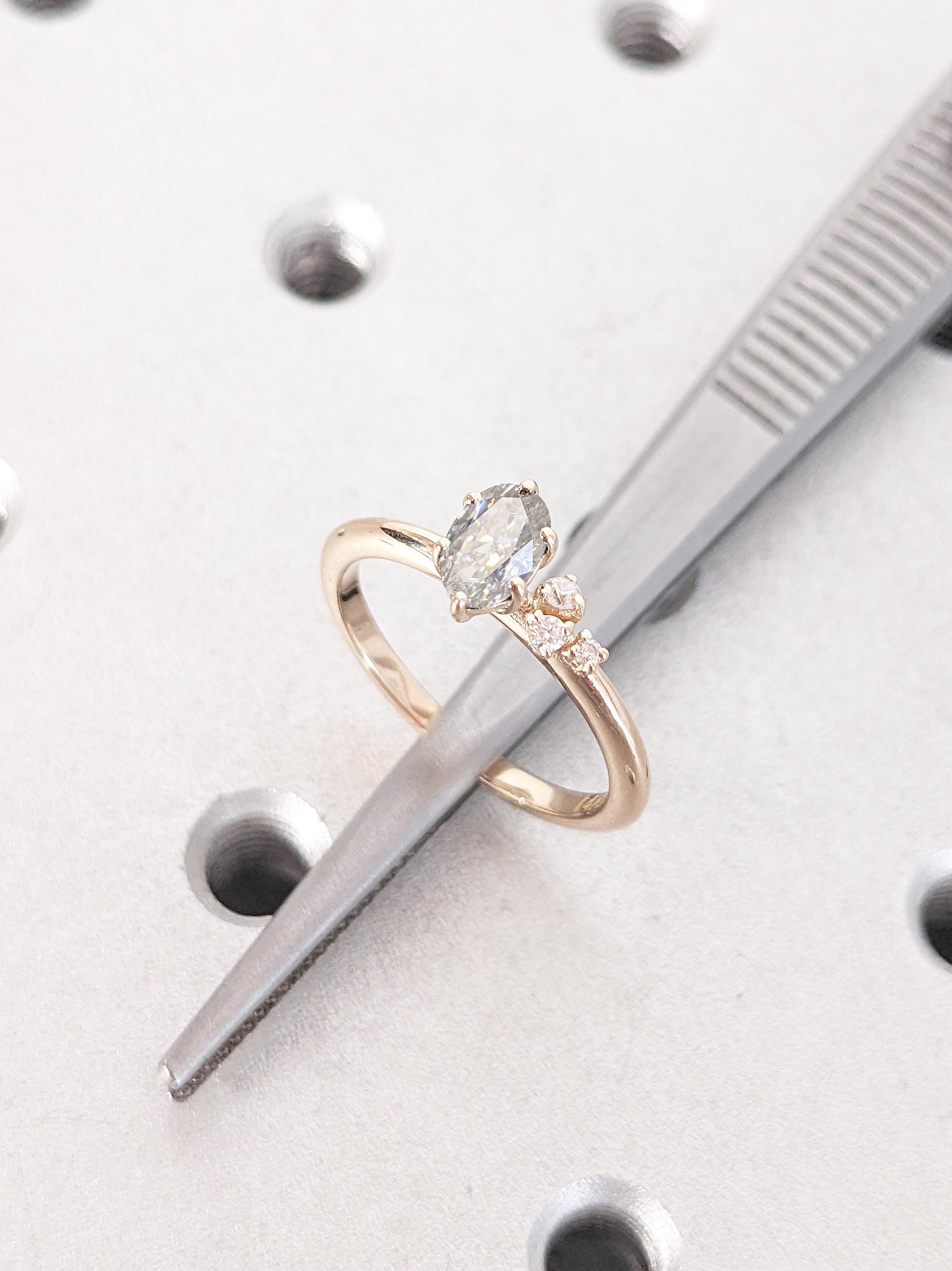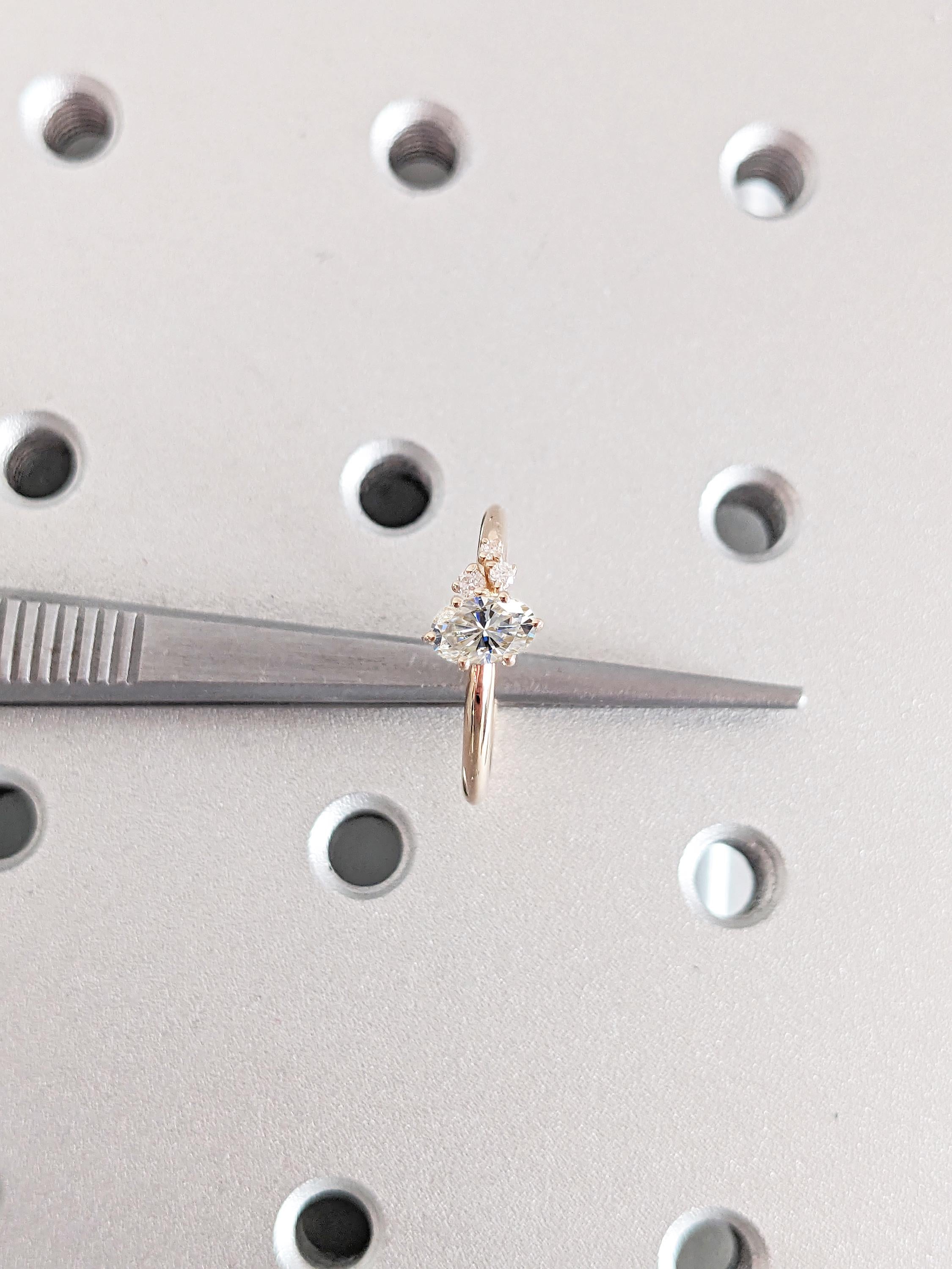 Elegant and enchanting, this ring features an oval cut Lab Grown Diamond in a delicate six-prong setting. The center stone is complemented by a unique cluster of Natural Diamonds, Lab-Grown Diamonds, or Moissanite of your choice, gracefully adorning one side of the band. This exquisite piece is a timeless statement of beauty and a perfect blend of sophistication and individuality.